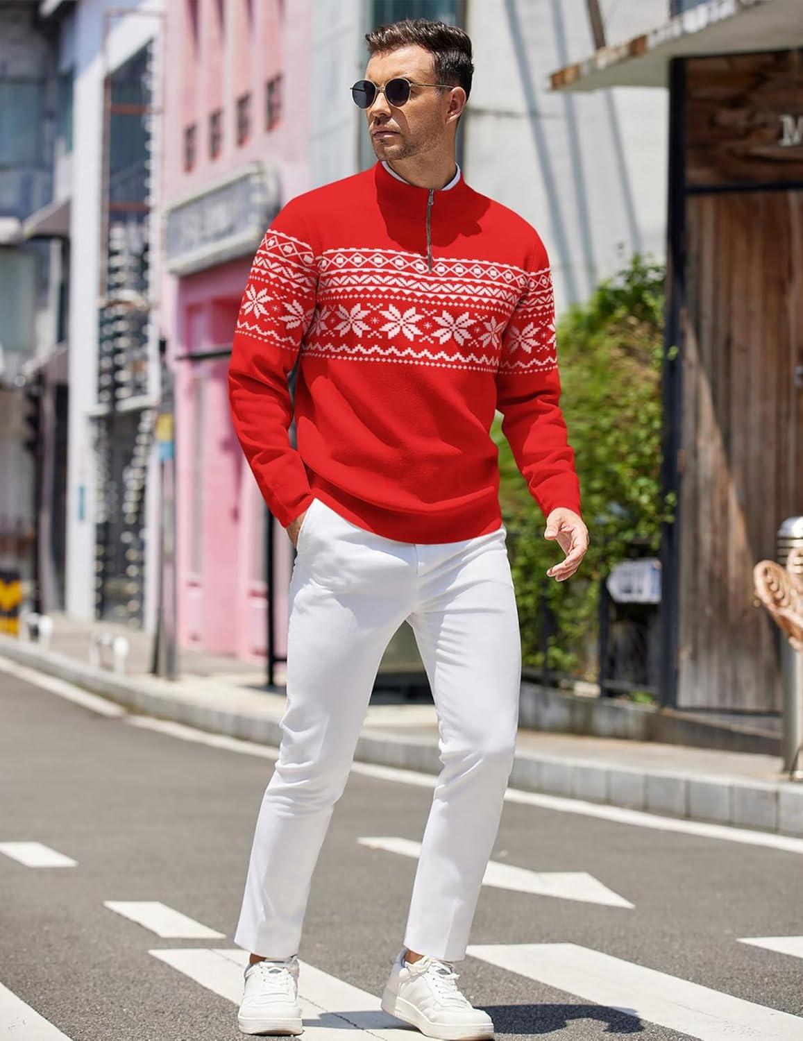 COOFANDY Men’s Quarter Zip Up Sweaters Slim Fit Lightweight Mock Neck Pullover Casual Polo Sweaters(Christmas Red & White)