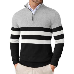 COOFANDY Men’s Quarter Zip Up Sweaters Slim Fit Lightweight Mock Neck Pullover Casual Polo Sweaters(Black & White & Grey Stripe)