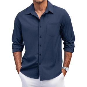 COOFANDY Men’s Casual Button Down Shirts Long Sleeve Untucked Shirts Regular Fit Linen Shirt(Navy Blue)