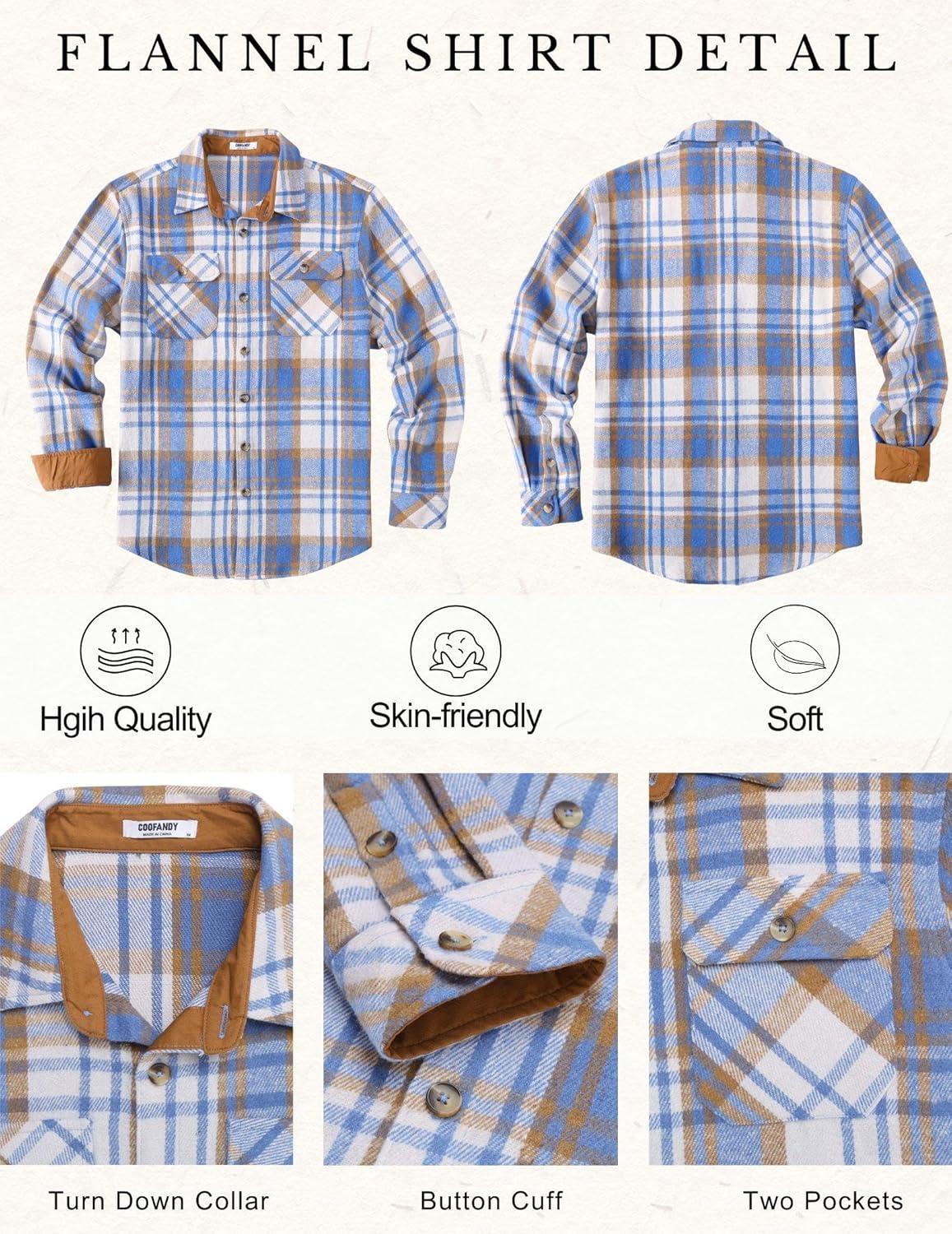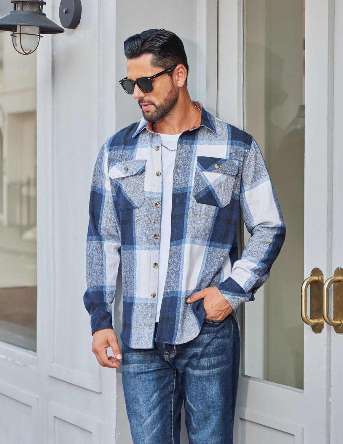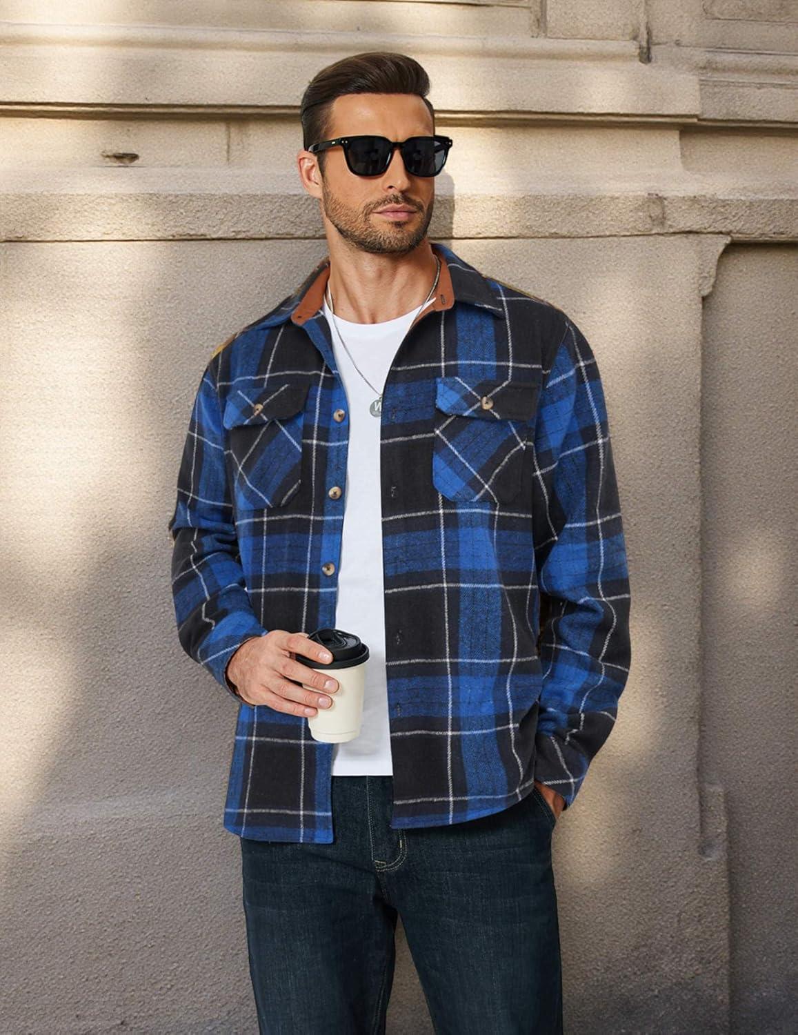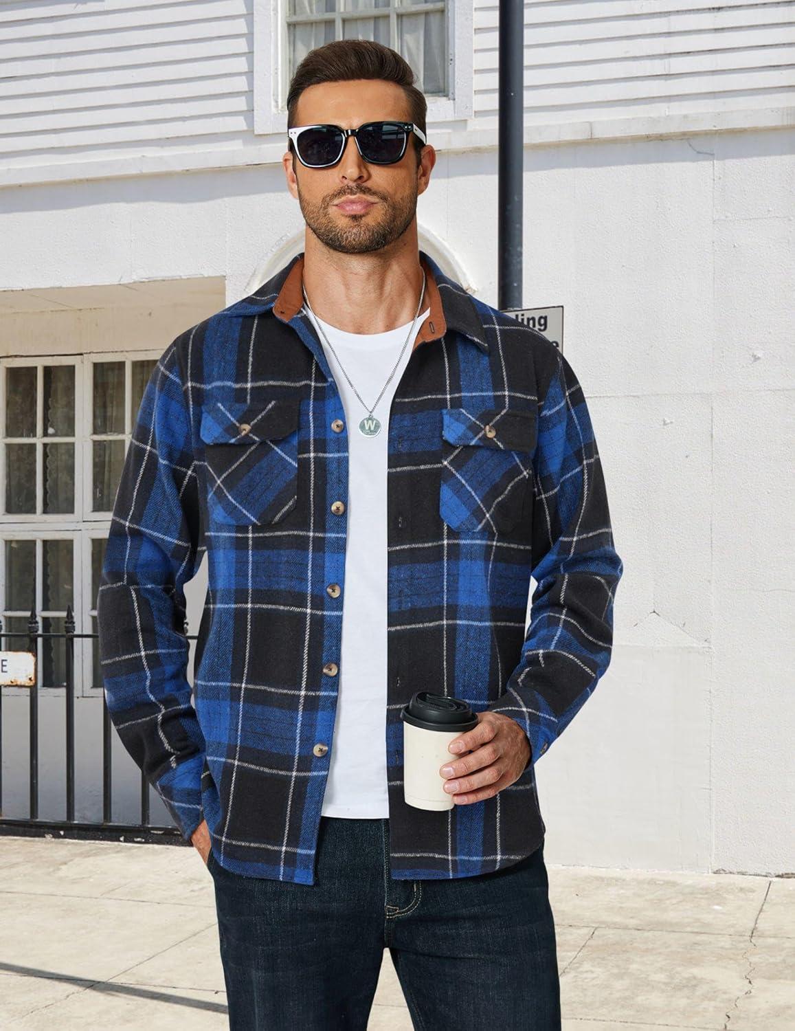 COOFANDY Men’s Long Sleeve Flannel Shirts Jacket Fashion Plaid Jackets Casual Button Down Shirt with Pockets(Blue)
