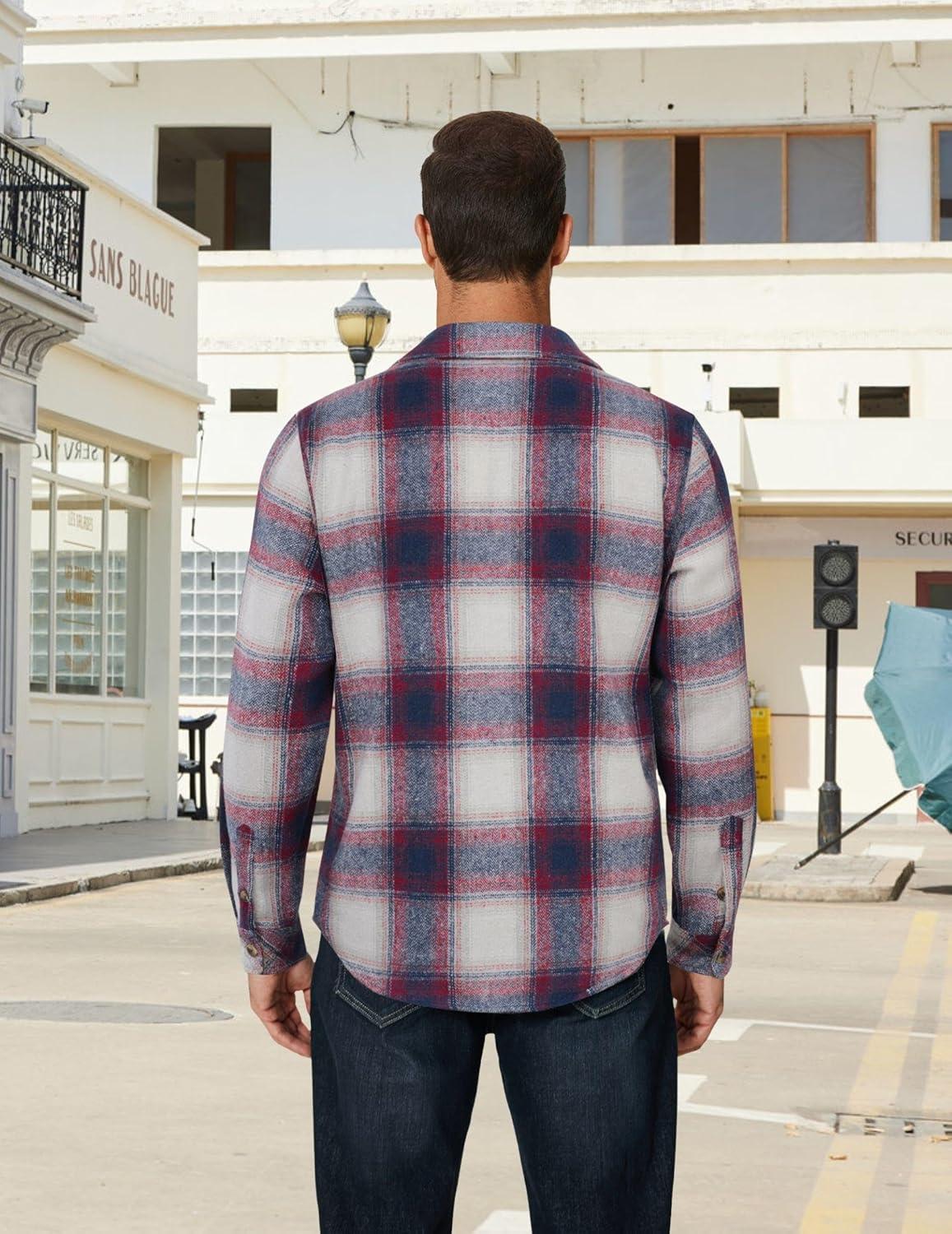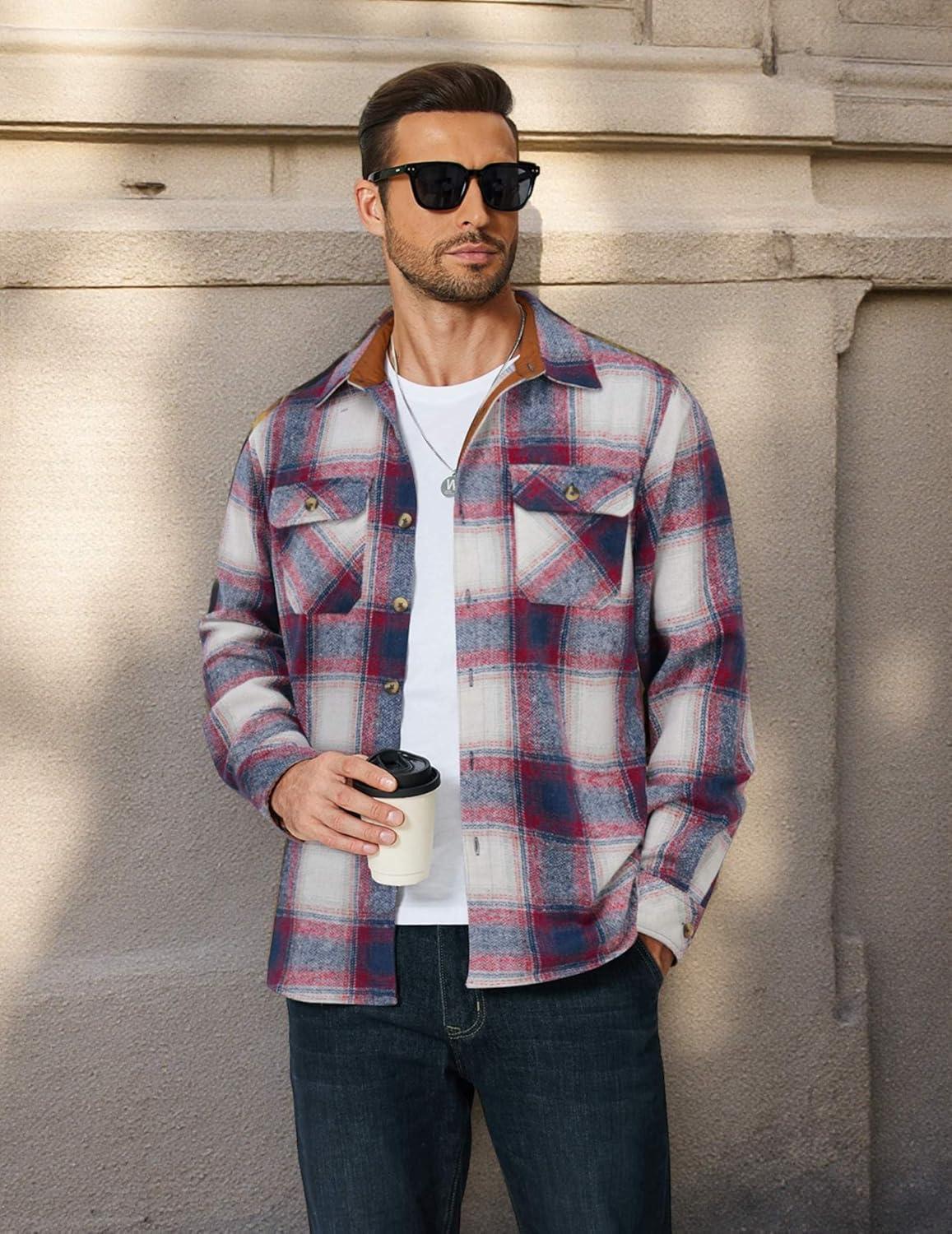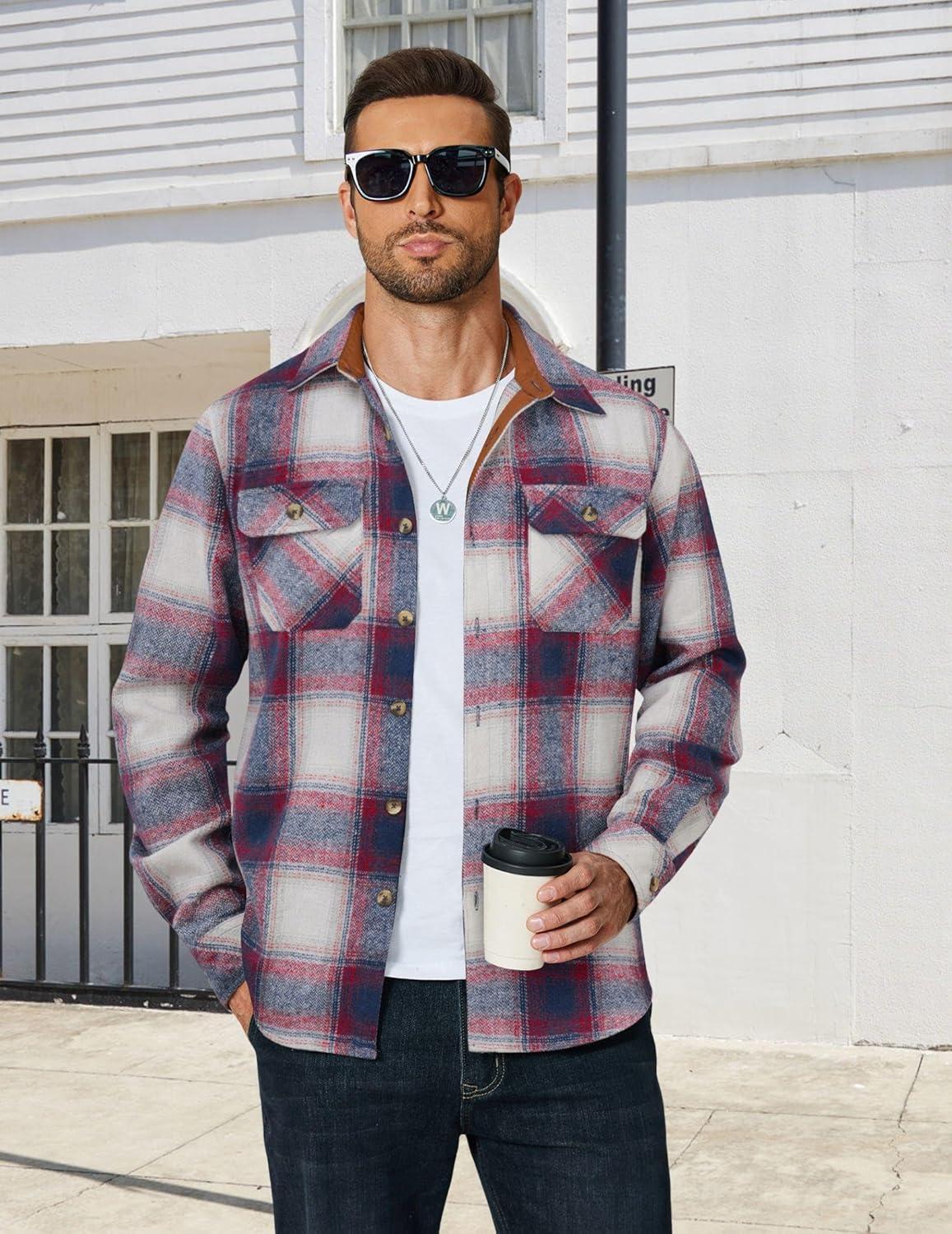 COOFANDY Men’s Long Sleeve Flannel Shirts Jacket Fashion Plaid Jackets Casual Button Down Shirt with Pockets(Blue Red-line)