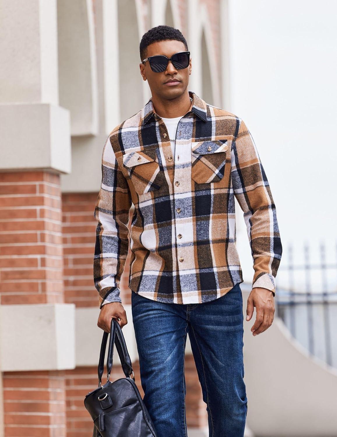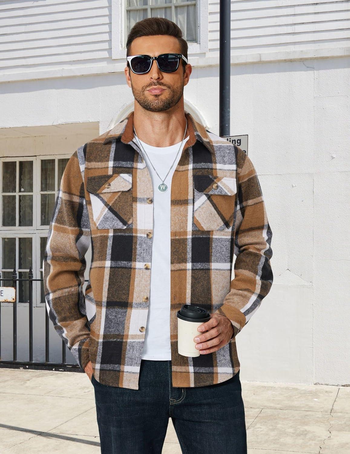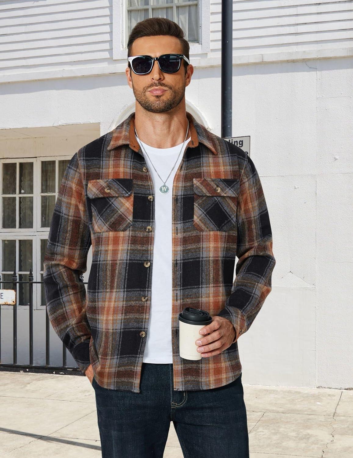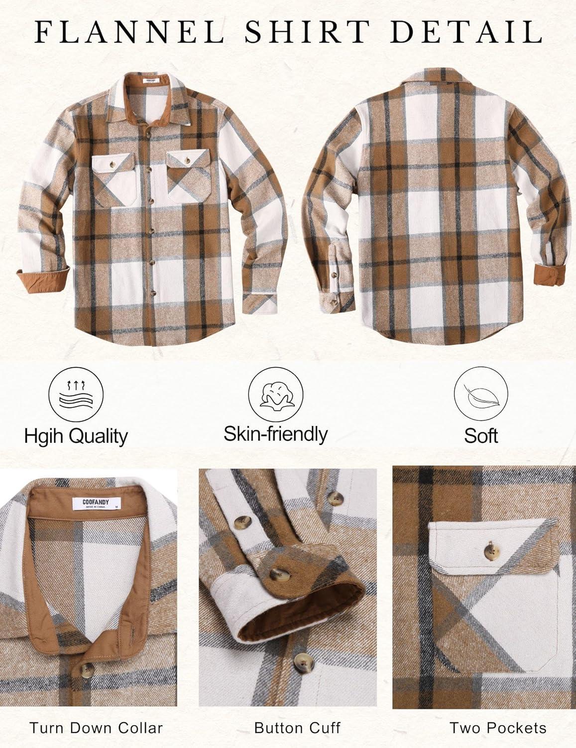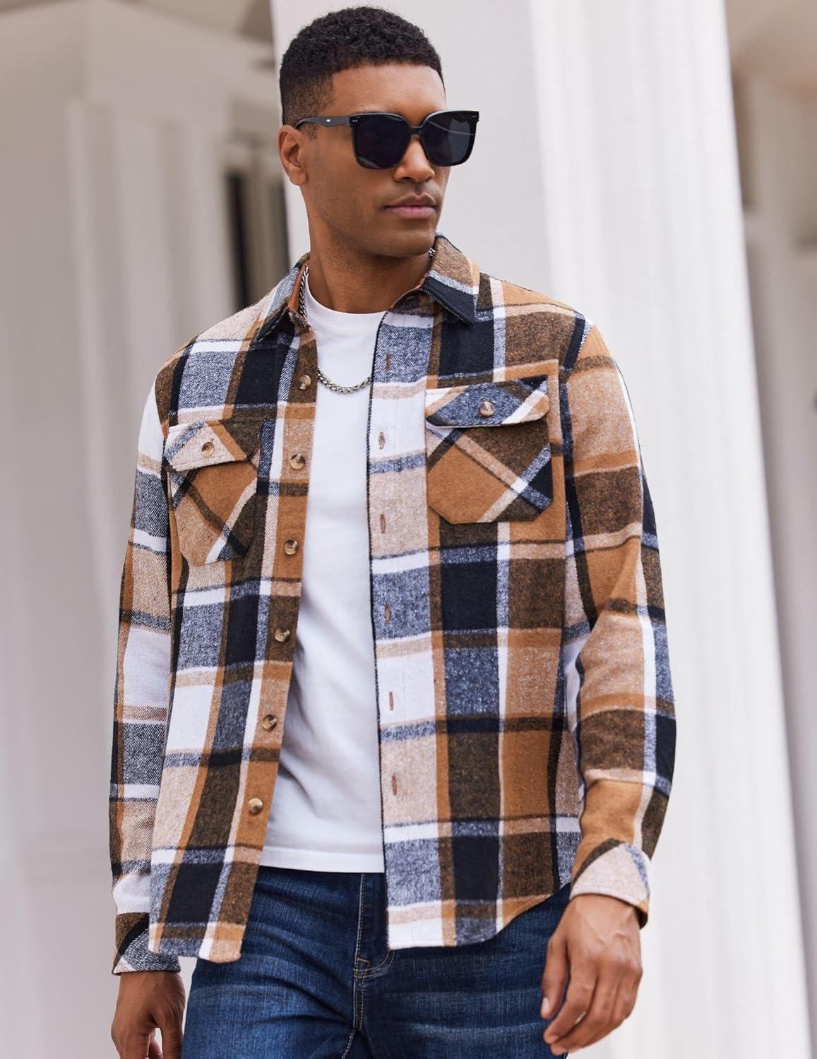 COOFANDY Men’s Long Sleeve Flannel Shirts Jacket Fashion Plaid Jackets Casual Button Down Shirt with Pockets(Brown)