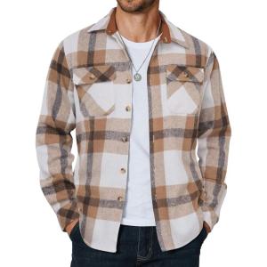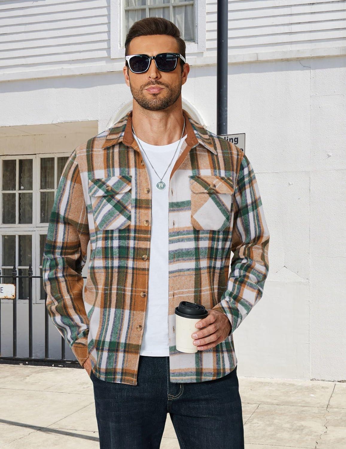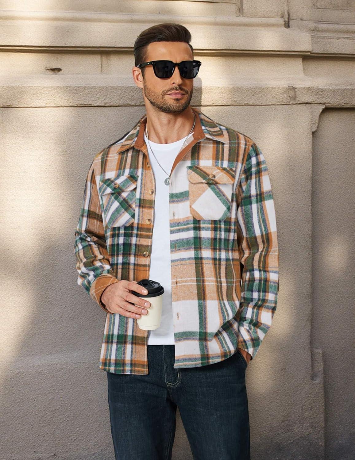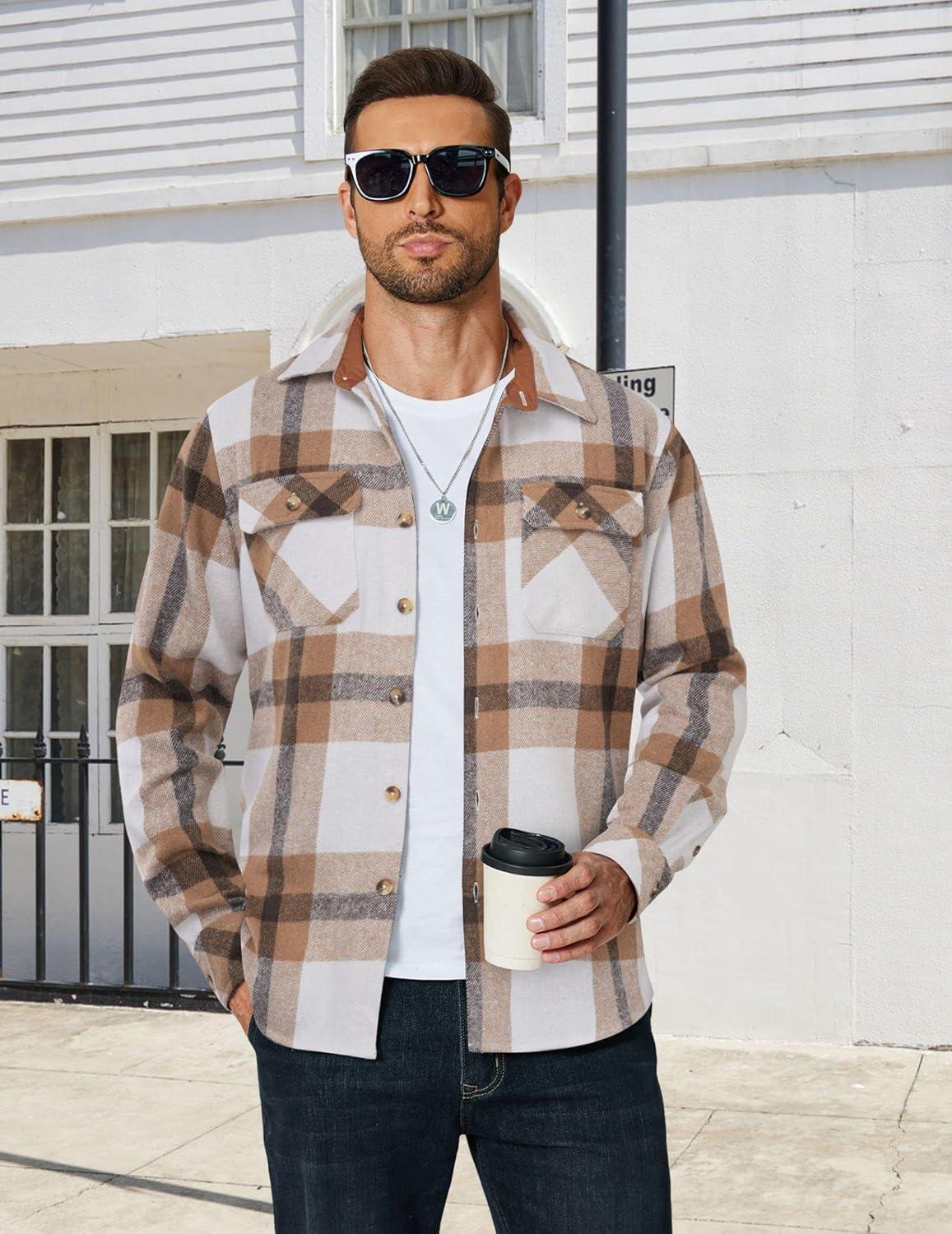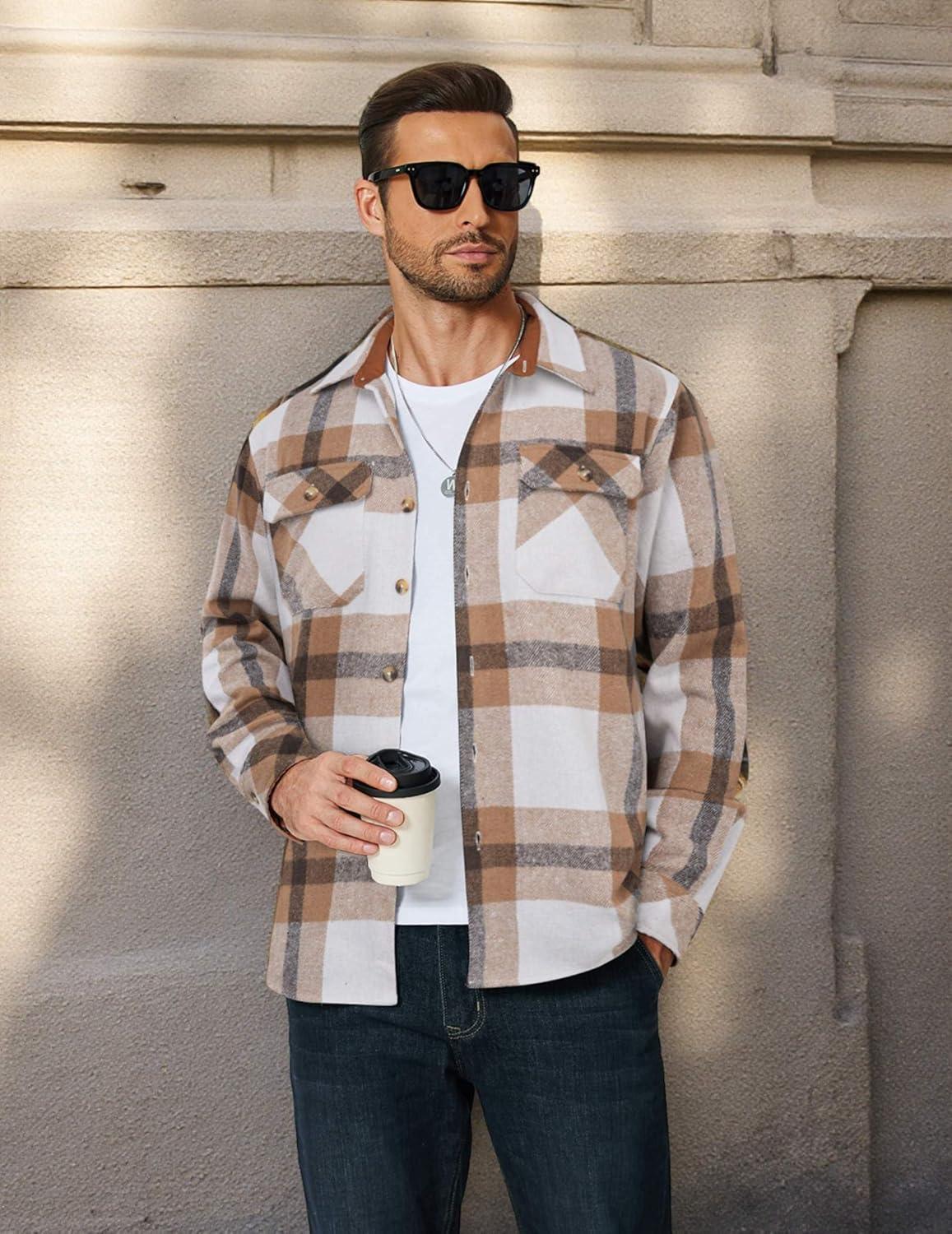 COOFANDY Men’s Long Sleeve Flannel Shirts Jacket Fashion Plaid Jackets Casual Button Down Shirt with Pockets(Khaki)