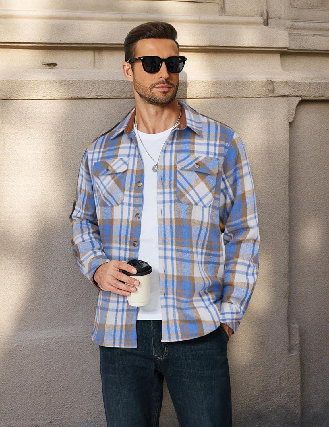COOFANDY Men’s Long Sleeve Flannel Shirts Jacket Fashion Plaid Jackets Casual Button Down Shirt with Pockets(Light Blue)
