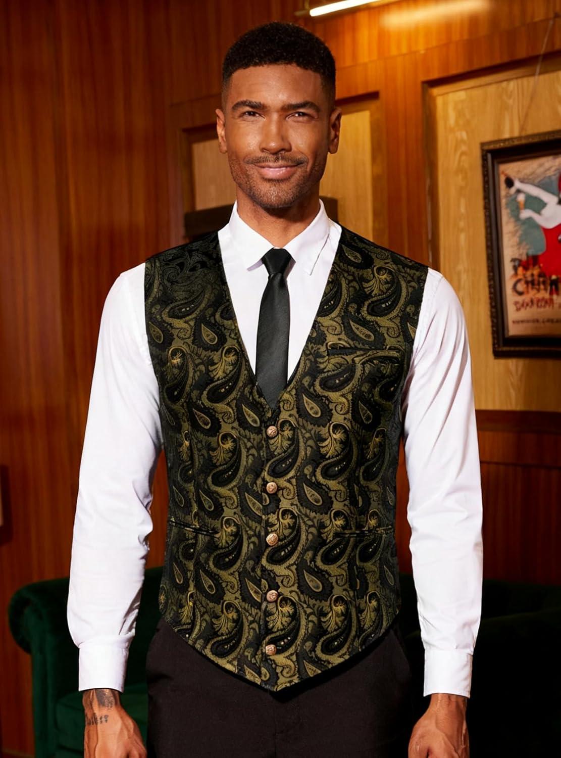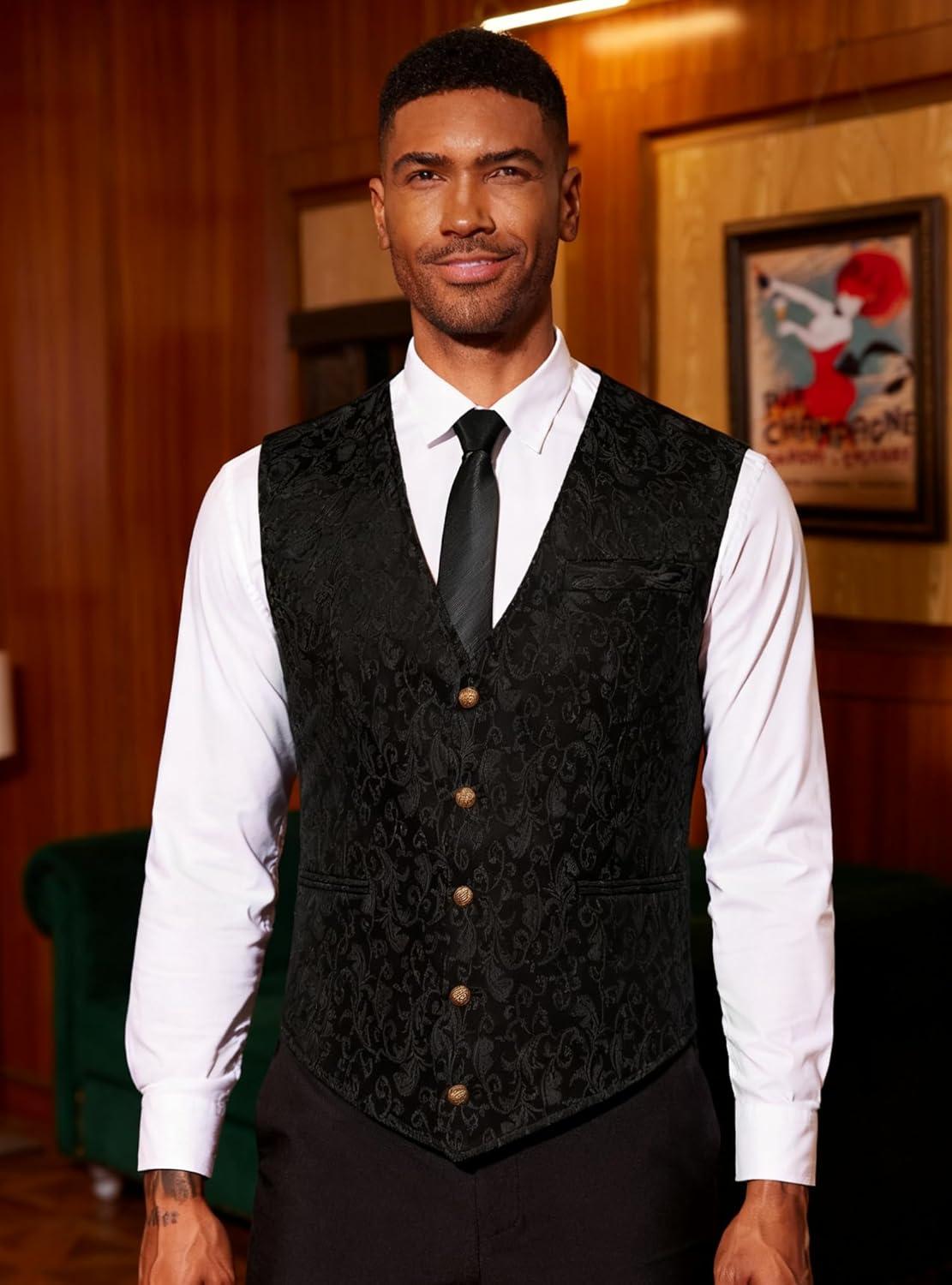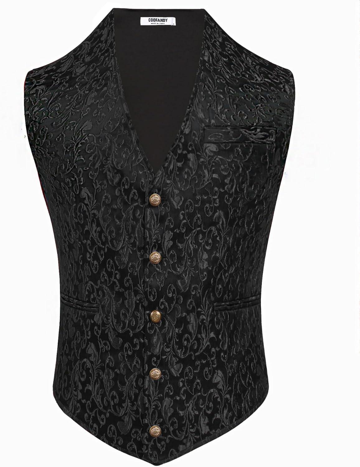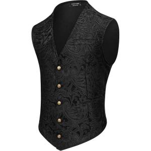 COOFANDY Mens Paisley Tuxedo Vest Victorian Steampunk Gothic Suit Vest Slim Fit V-Neck Waistcoat(Black)