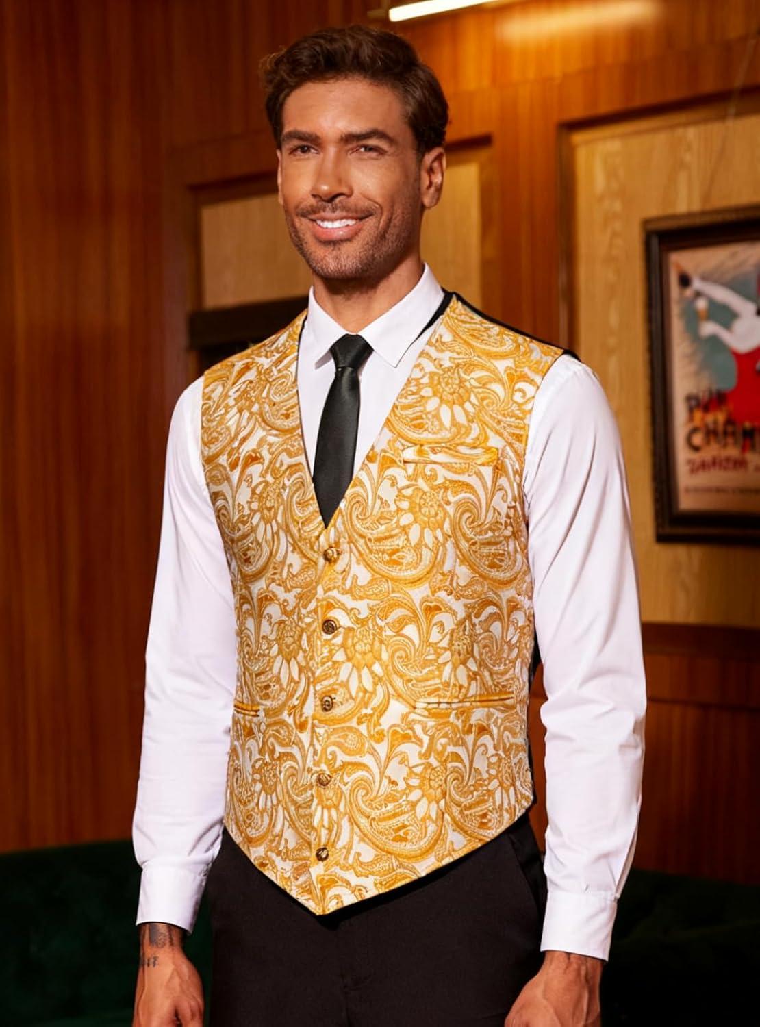COOFANDY Mens Paisley Tuxedo Vest Victorian Steampunk Gothic Suit Vest Slim Fit V-Neck Waistcoat(Gold)