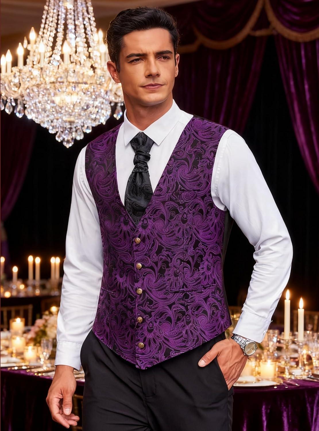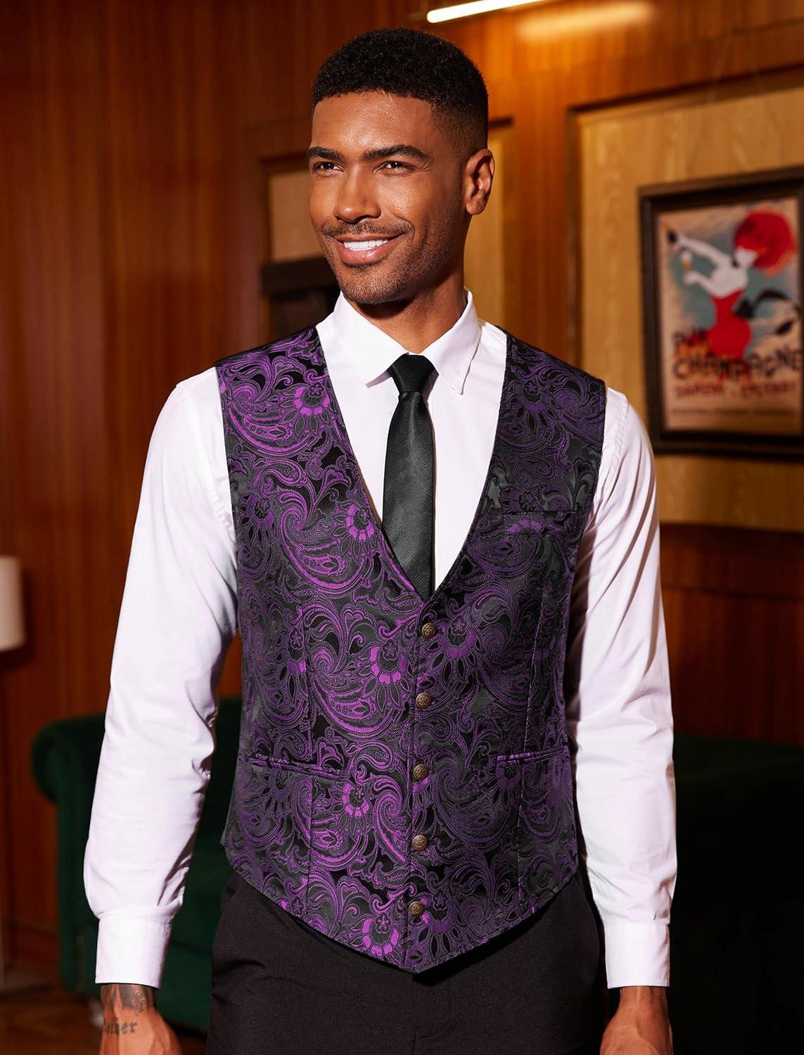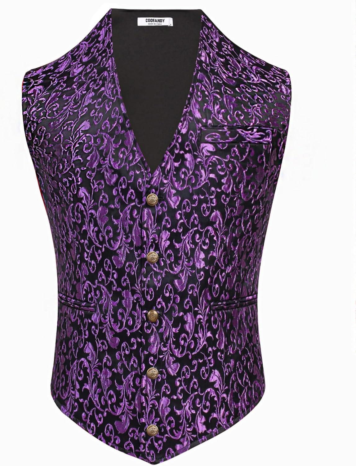 COOFANDY Mens Paisley Tuxedo Vest Victorian Steampunk Gothic Suit Vest Slim Fit V-Neck Waistcoat(Purple)