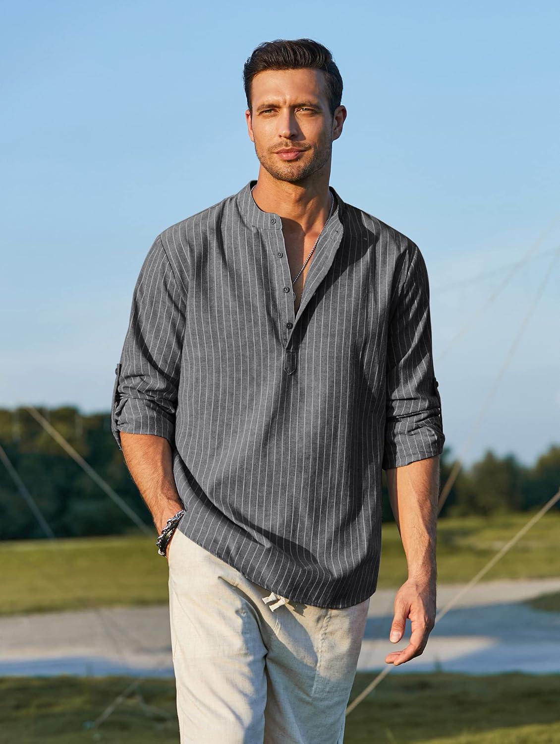 COOFANDY Men’s Cotton Linen Henley T-Shirt Long Sleeve Hippie Casual Beach T-Shirts(Black Striped)