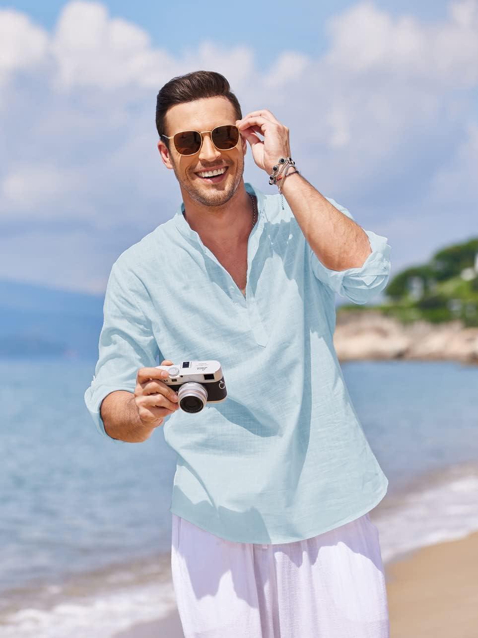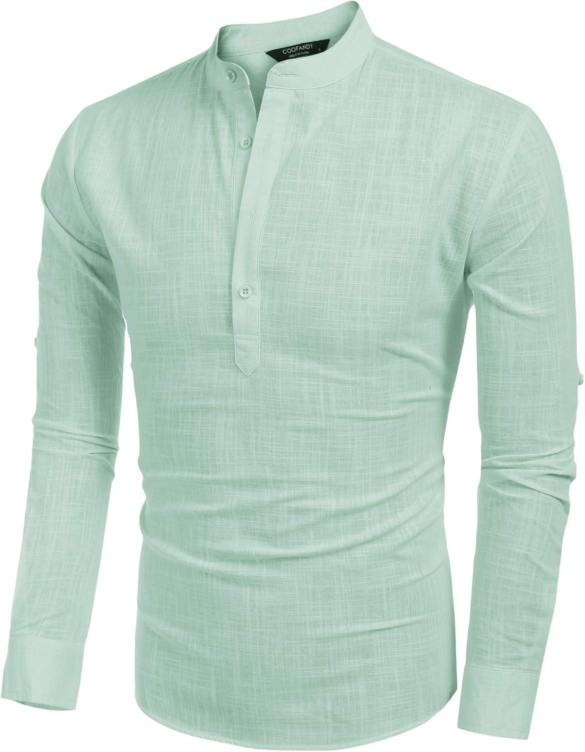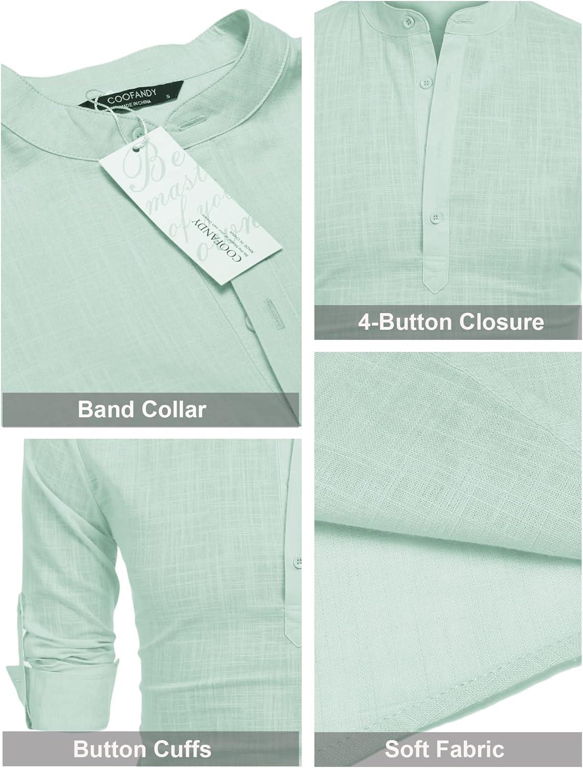 COOFANDY Men’s Cotton Linen Henley T-Shirt Long Sleeve Hippie Casual Beach T-Shirts(Green)