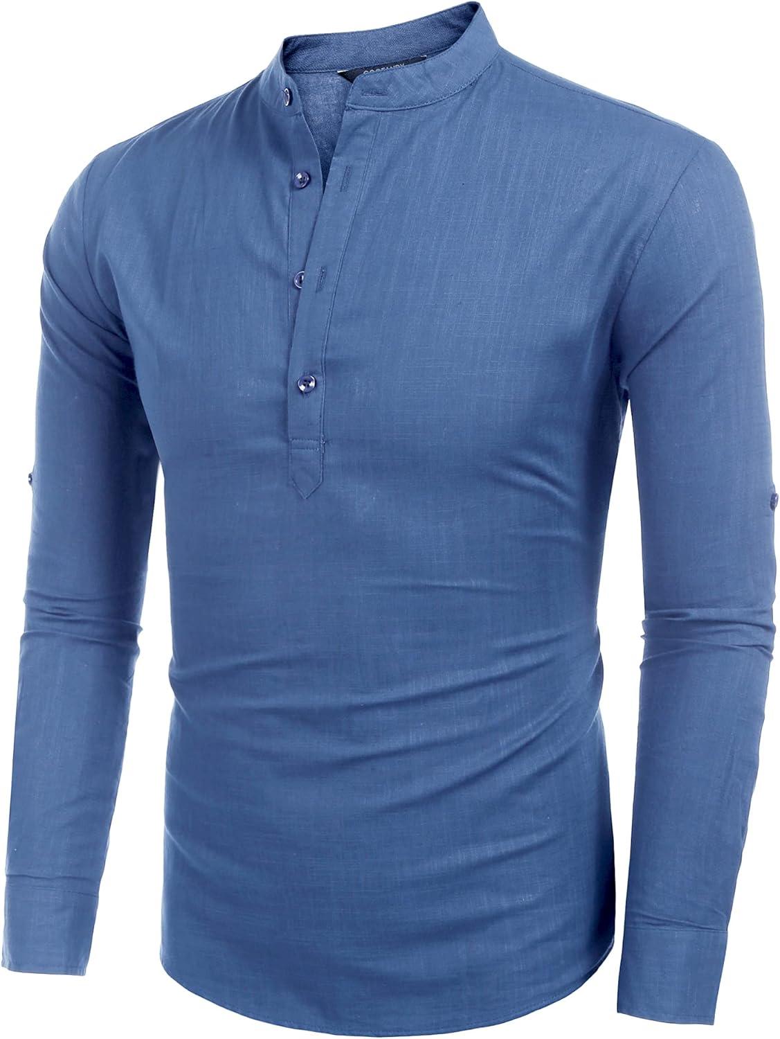 COOFANDY Men’s Cotton Linen Henley T-Shirt Long Sleeve Hippie Casual Beach T-Shirts(Denim Blue)