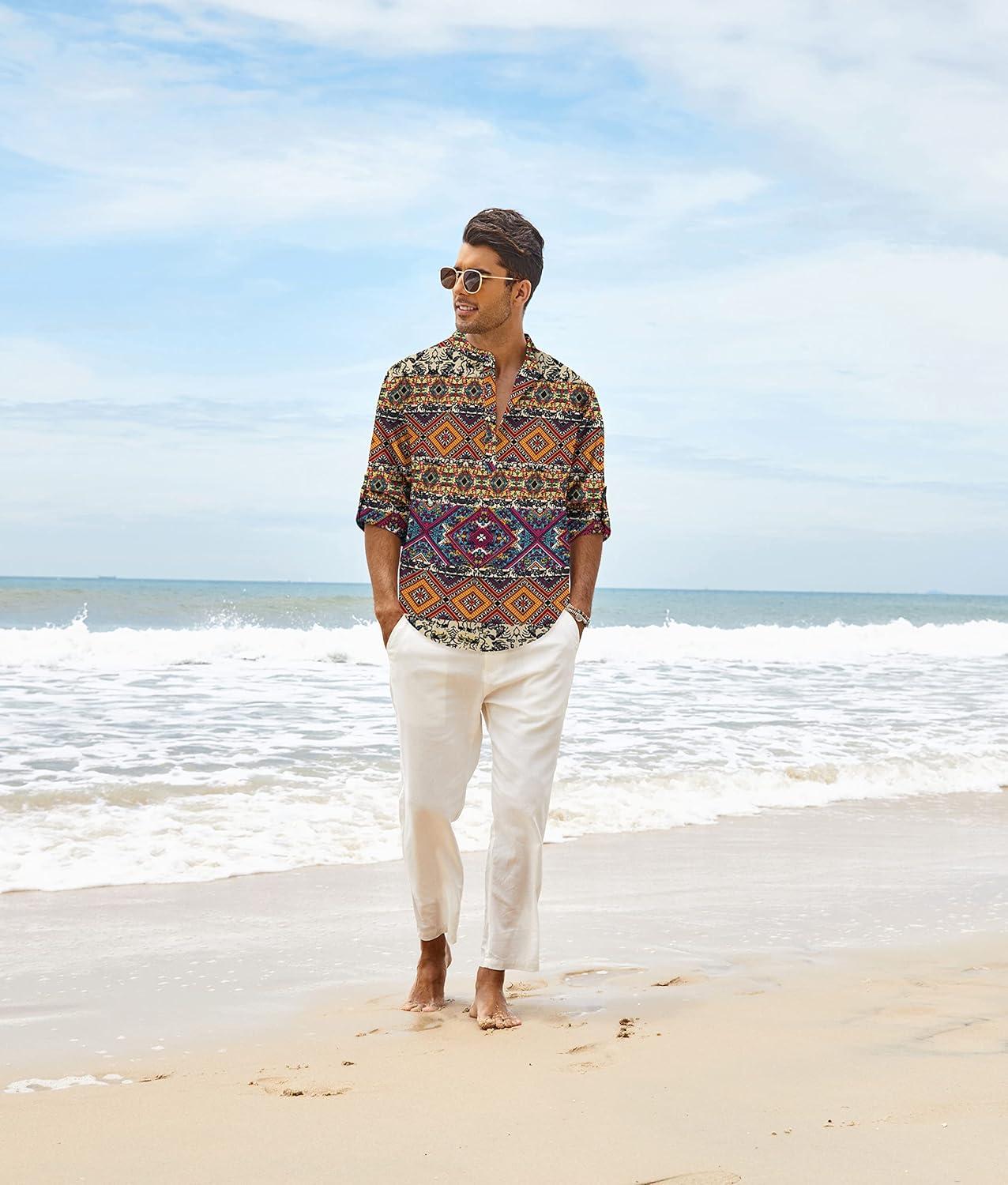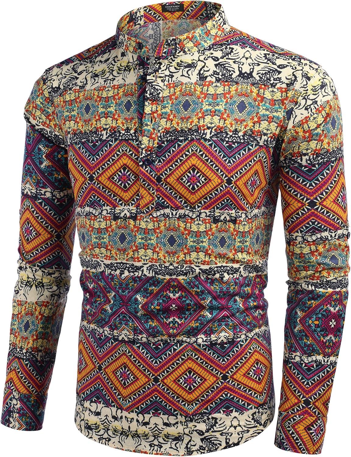 COOFANDY Men’s Cotton Linen Henley T-Shirt Long Sleeve Hippie Casual Beach T-Shirts(Geometric)