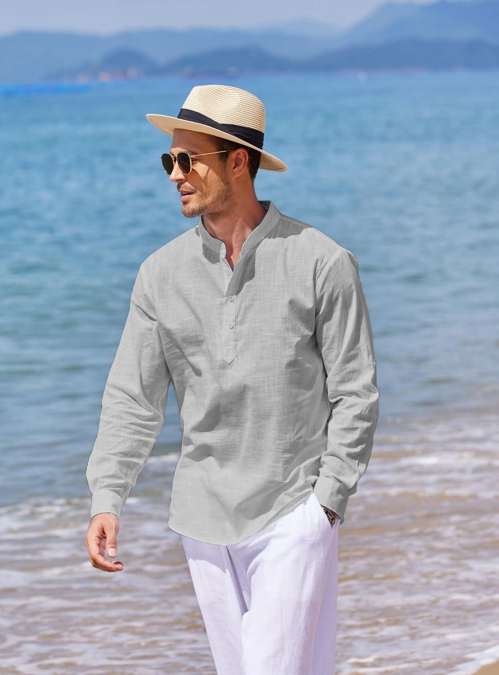COOFANDY Men’s Cotton Linen Henley T-Shirt Long Sleeve Hippie Casual Beach T-Shirts(Gray)