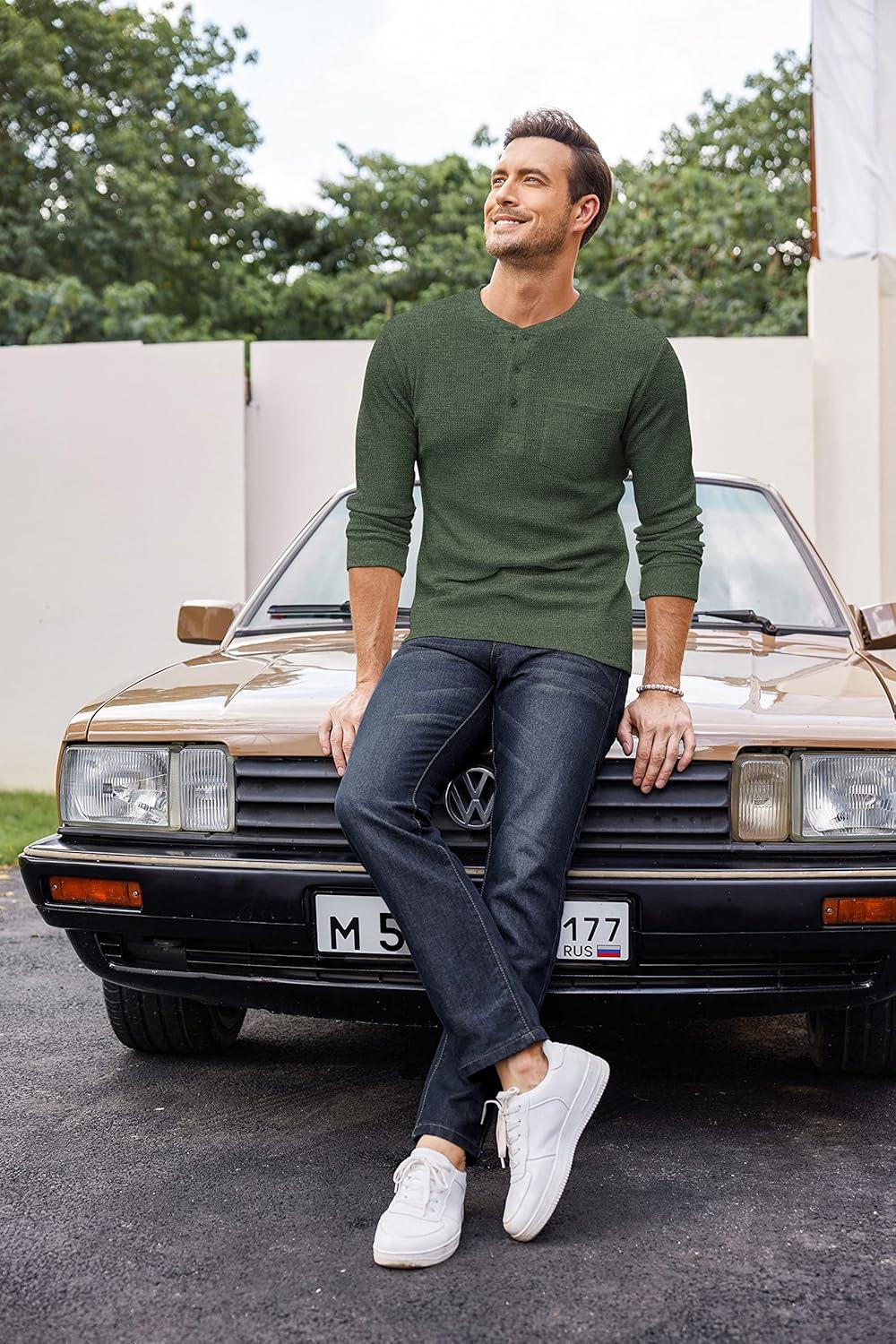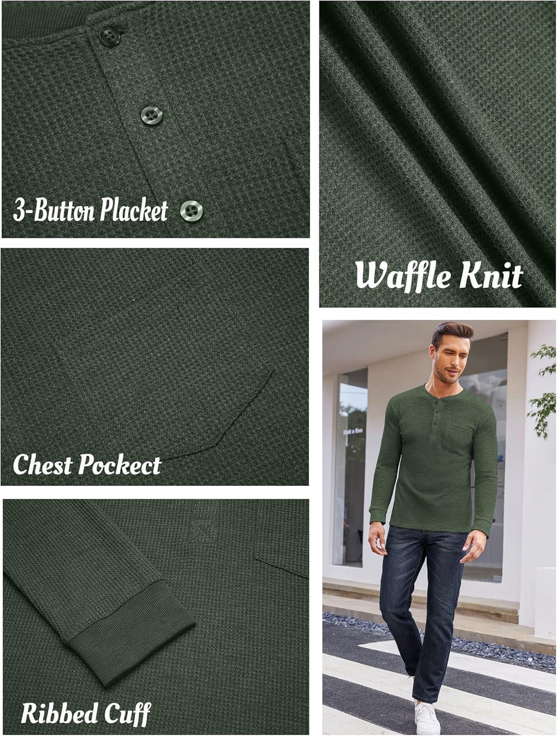 COOFANDY Men’s Henley Shirts Long Sleeve Basic Waffle Pique Pullover T-Shirt with Pocket(Army Green)