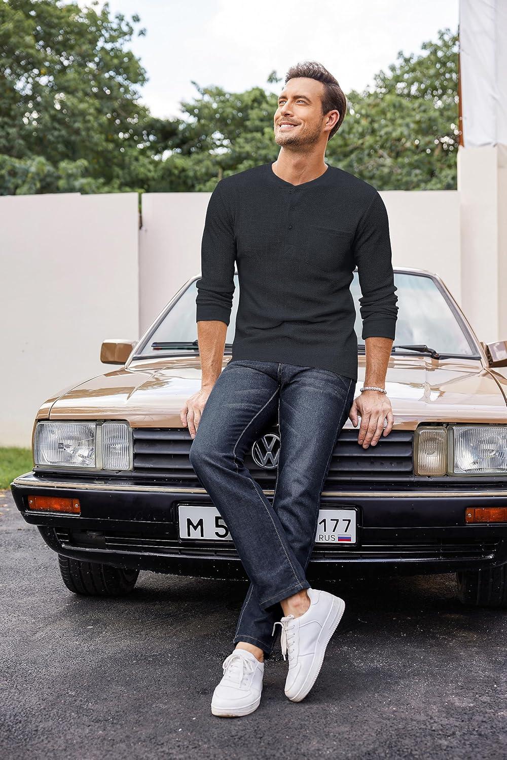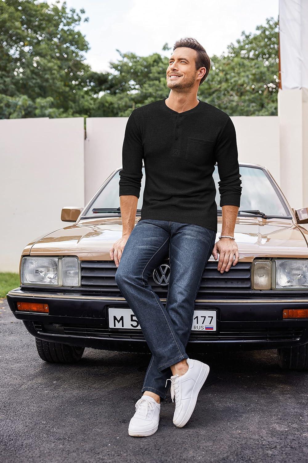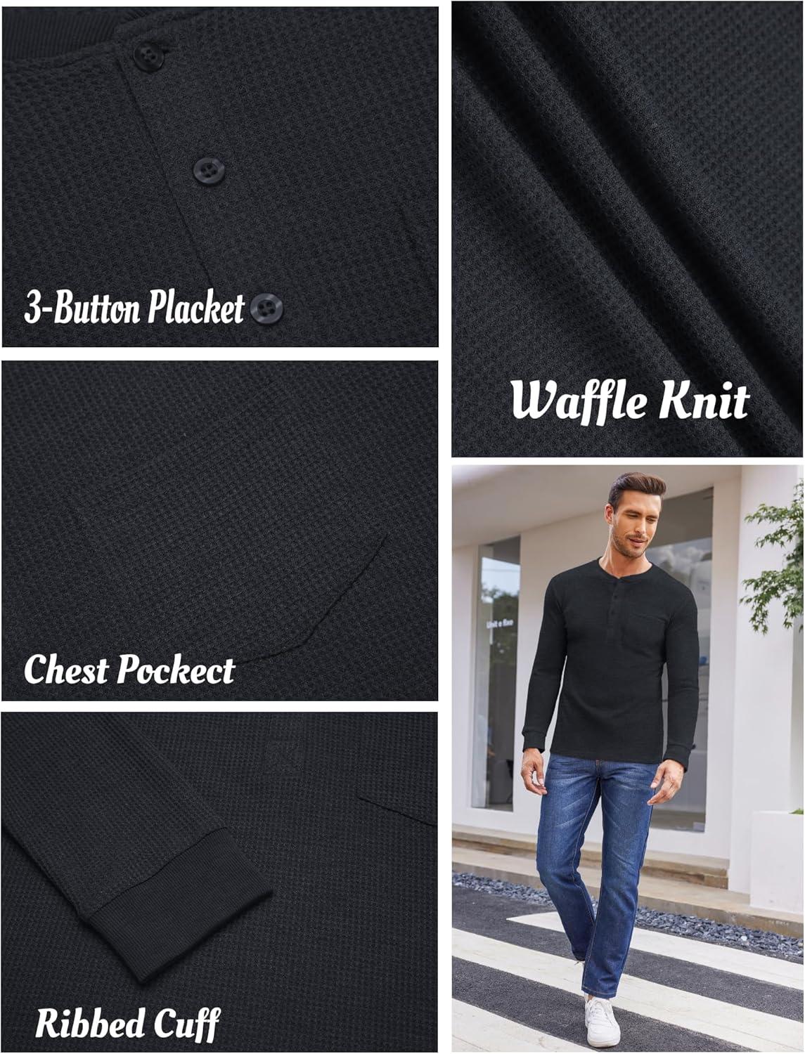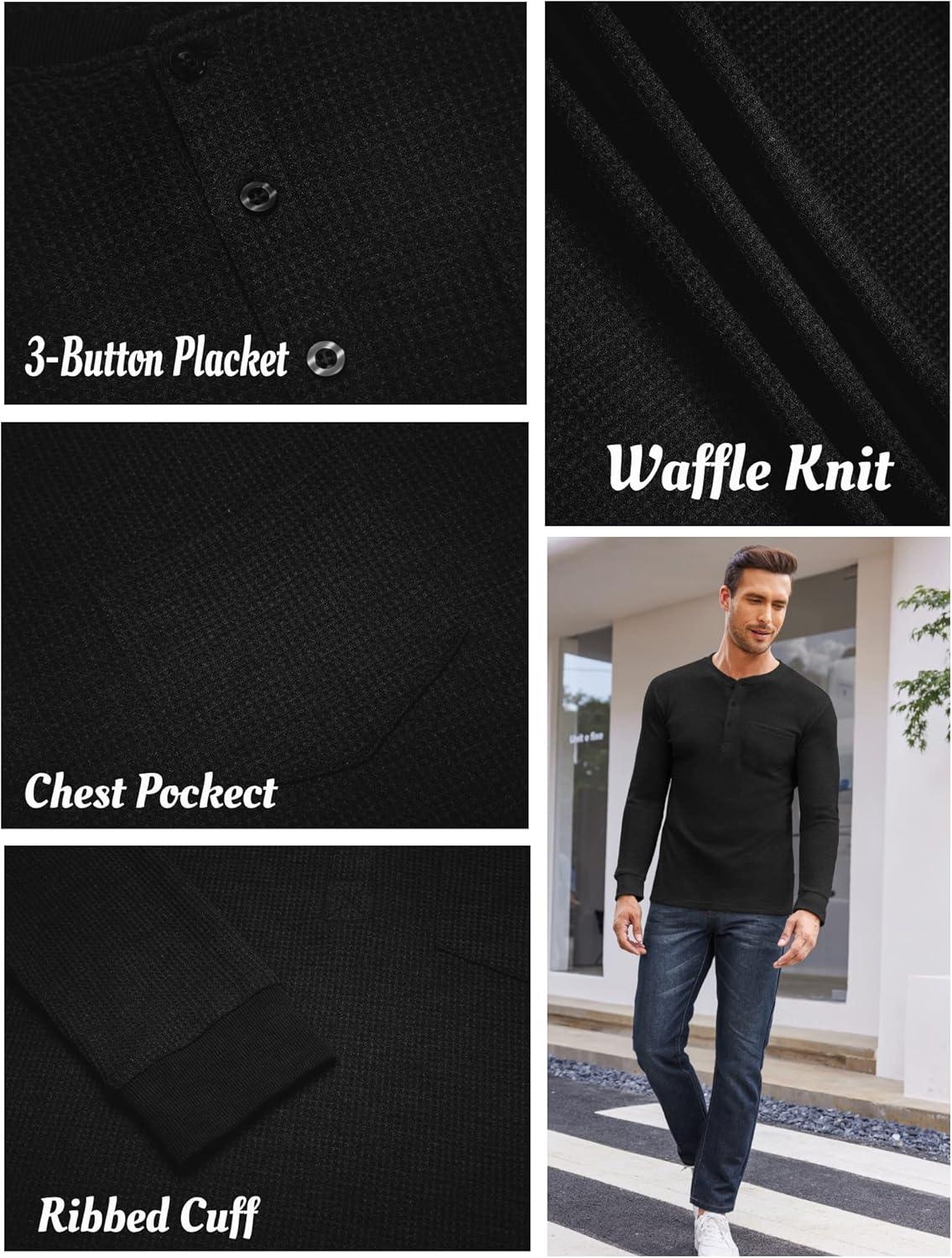 COOFANDY Men’s Henley Shirts Long Sleeve Basic Waffle Pique Pullover T-Shirt with Pocket(Black)