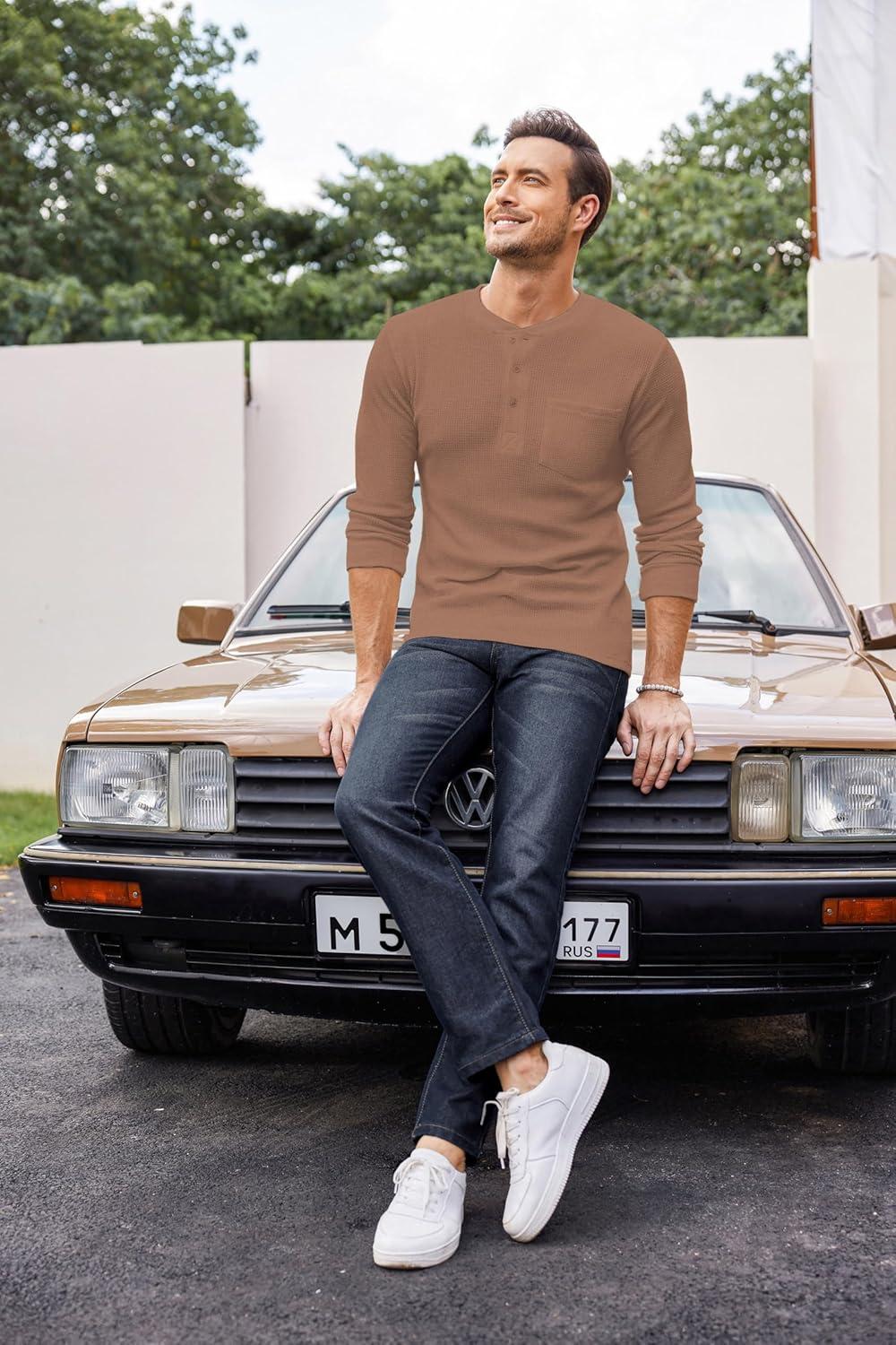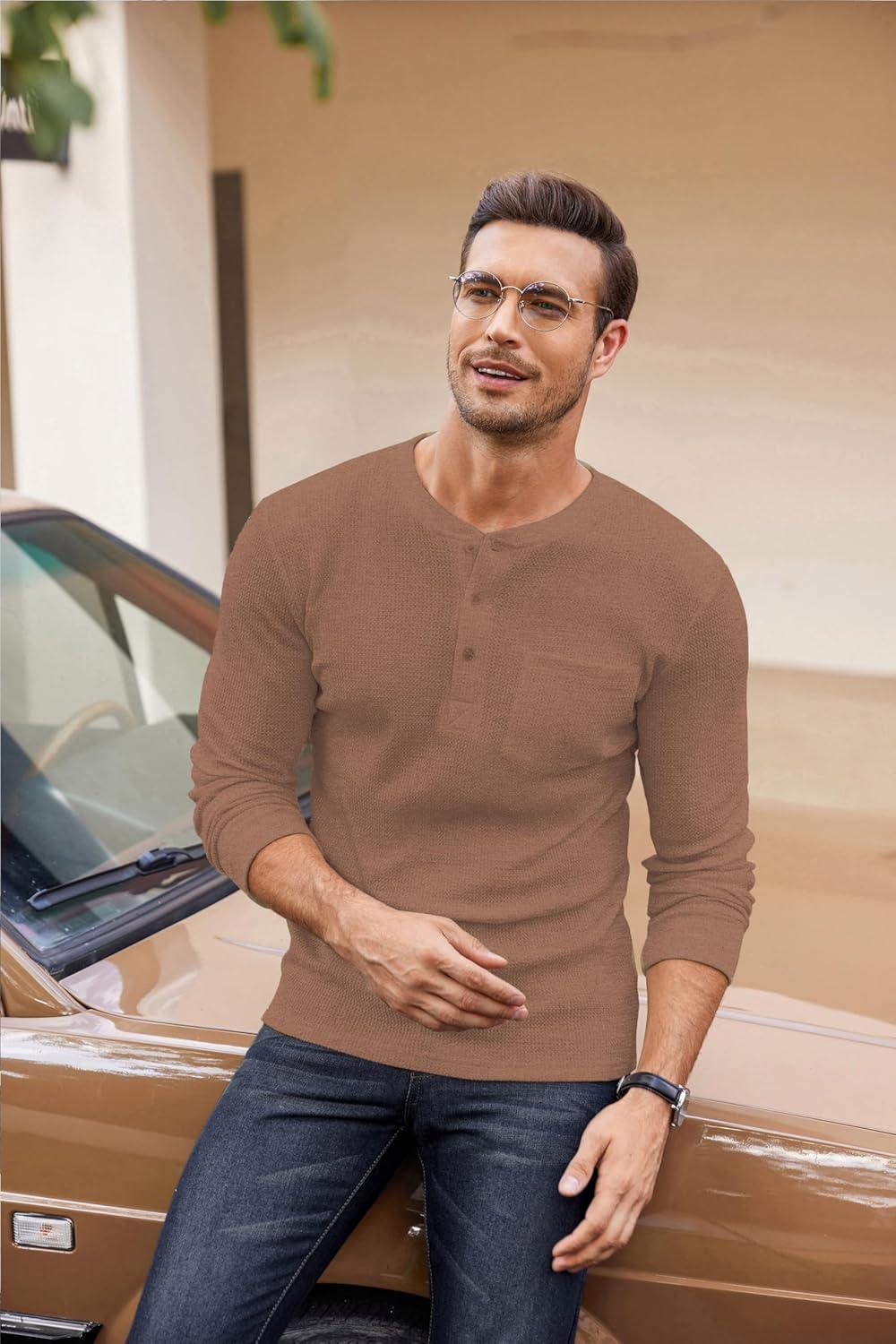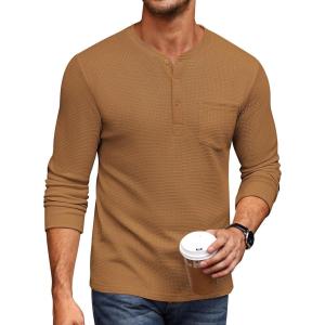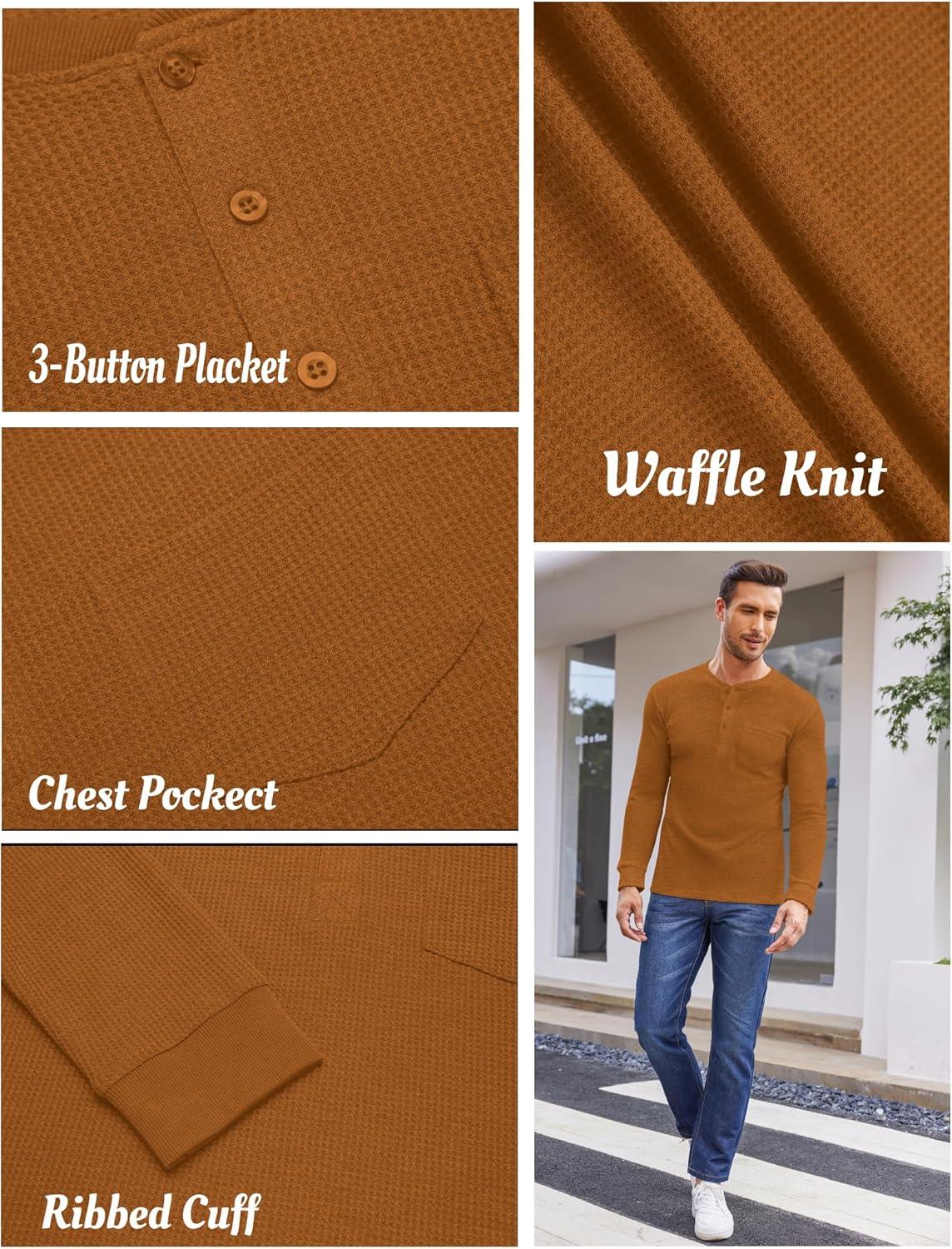 COOFANDY Men’s Henley Shirts Long Sleeve Basic Waffle Pique Pullover T-Shirt with Pocket(Caramel)