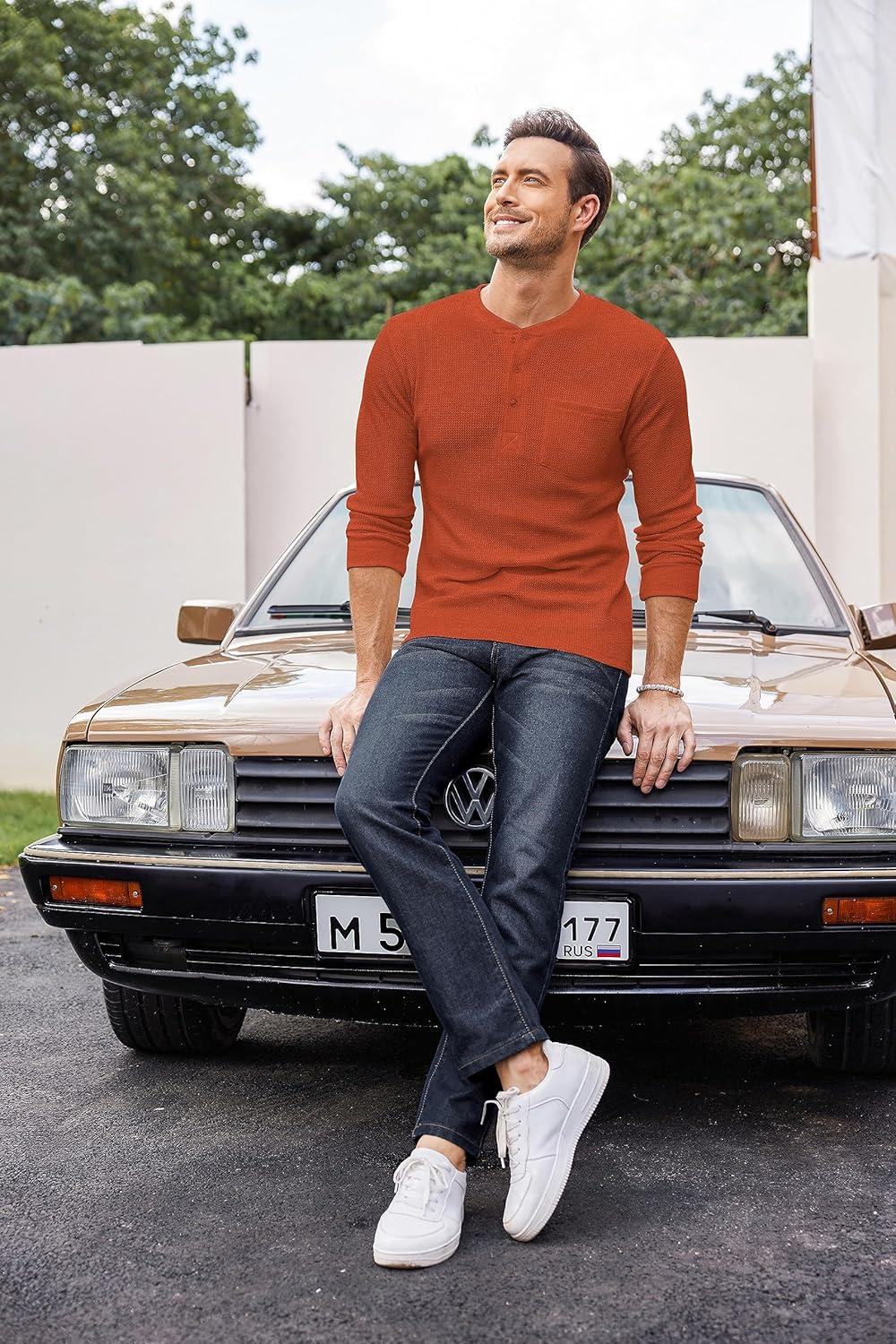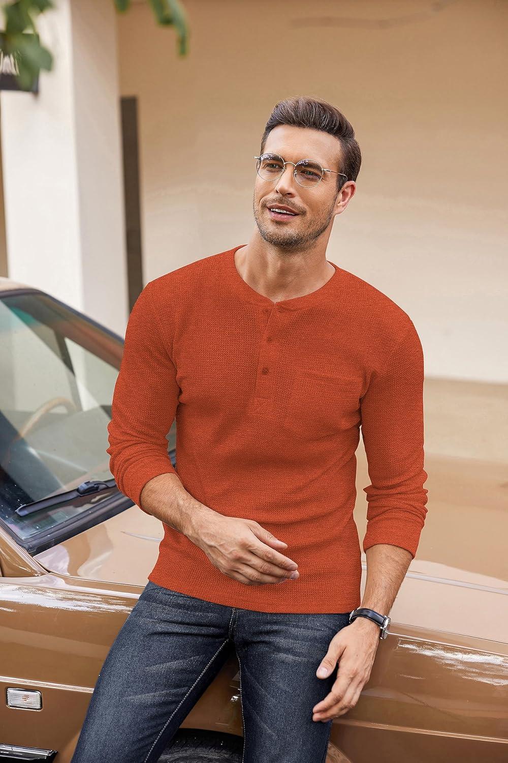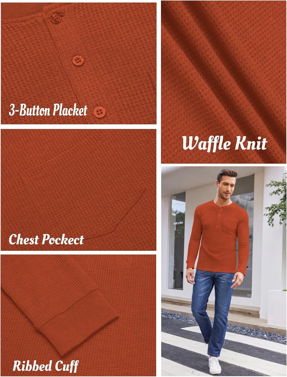 COOFANDY Men’s Henley Shirts Long Sleeve Basic Waffle Pique Pullover T-Shirt with Pocket(Caramel)