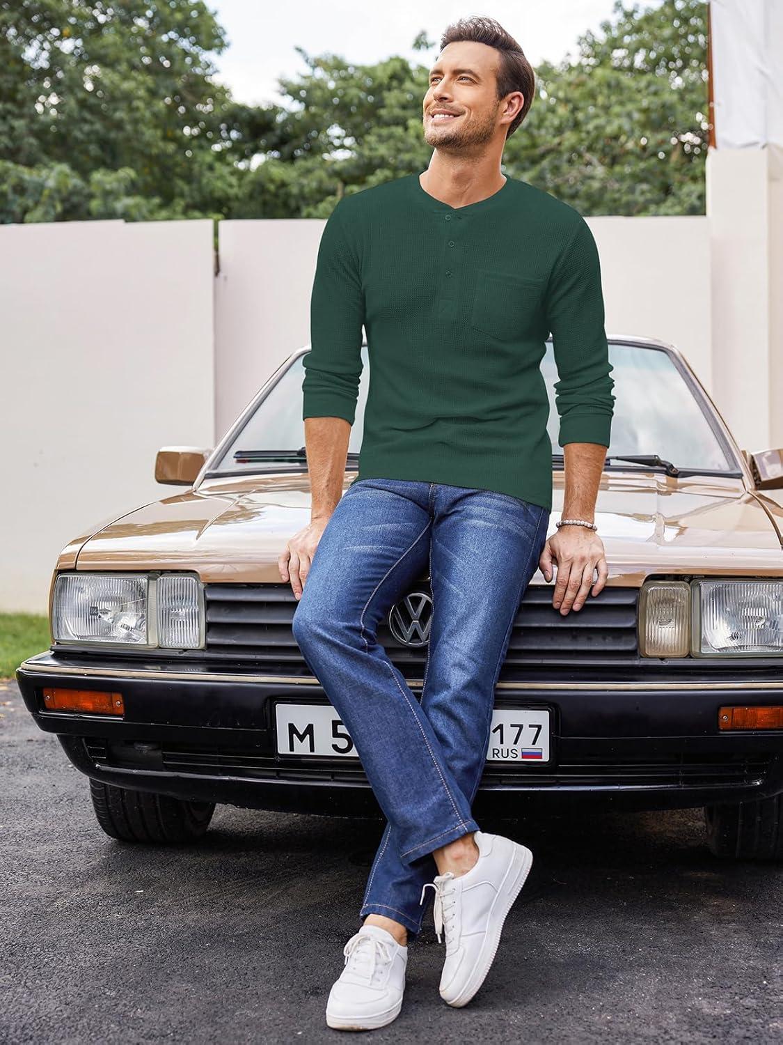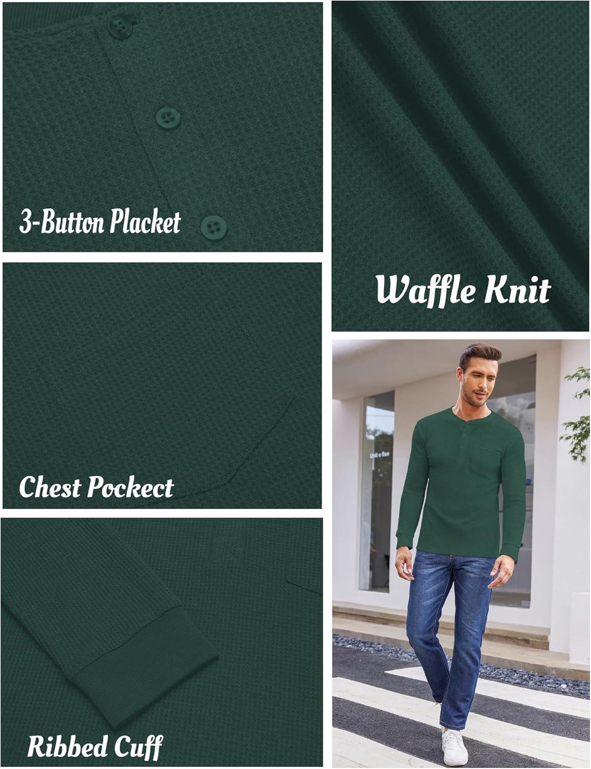 COOFANDY Men’s Henley Shirts Long Sleeve Basic Waffle Pique Pullover T-Shirt with Pocket(Dark Green)
