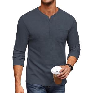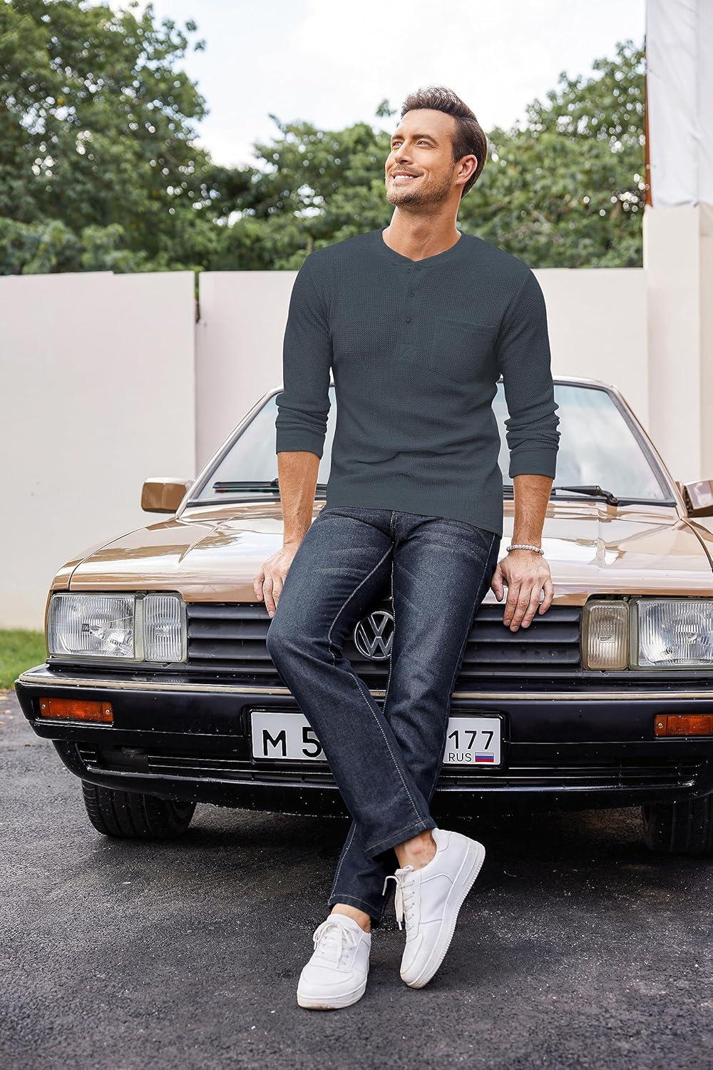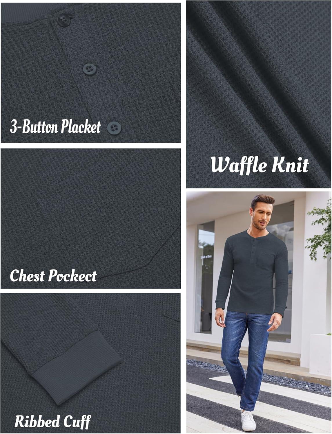 COOFANDY Men’s Henley Shirts Long Sleeve Basic Waffle Pique Pullover T-Shirt with Pocket(Dark Grey)