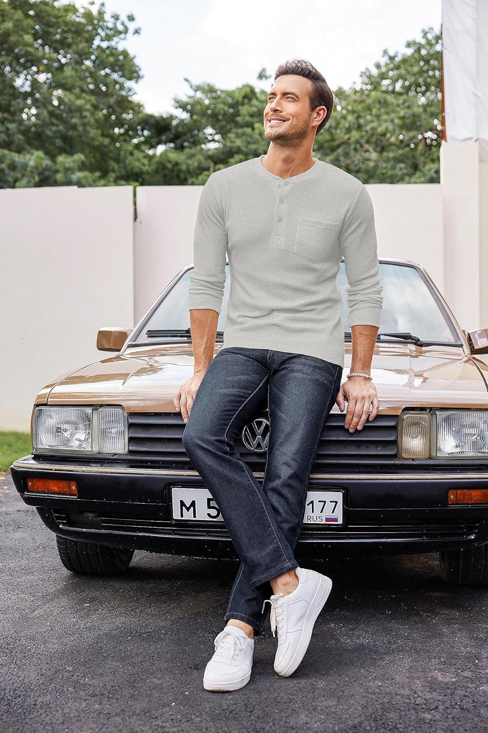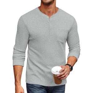 COOFANDY Men’s Henley Shirts Long Sleeve Basic Waffle Pique Pullover T-Shirt with Pocket(Grey)
