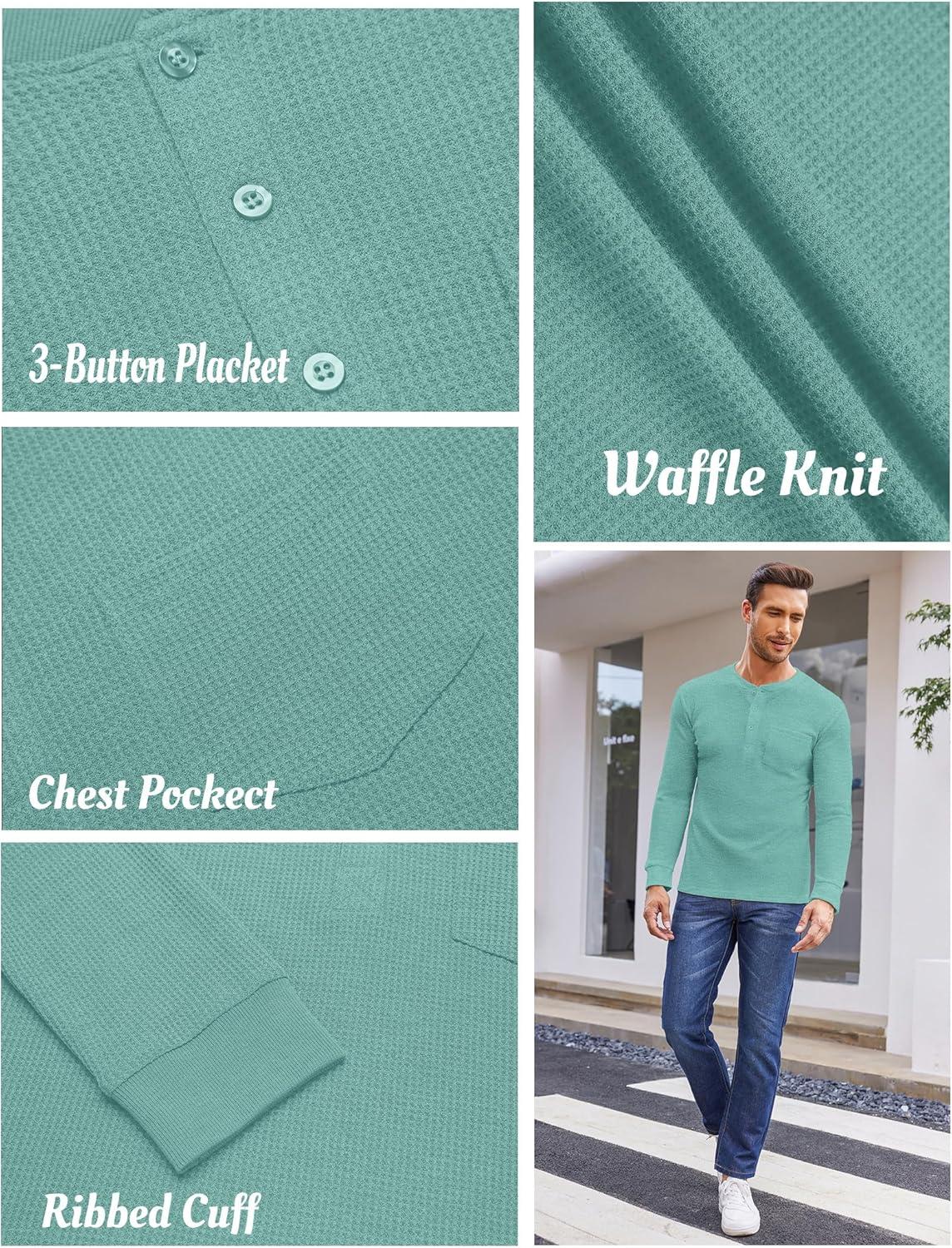 COOFANDY Men’s Henley Shirts Long Sleeve Basic Waffle Pique Pullover T-Shirt with Pocket(Grey Green)