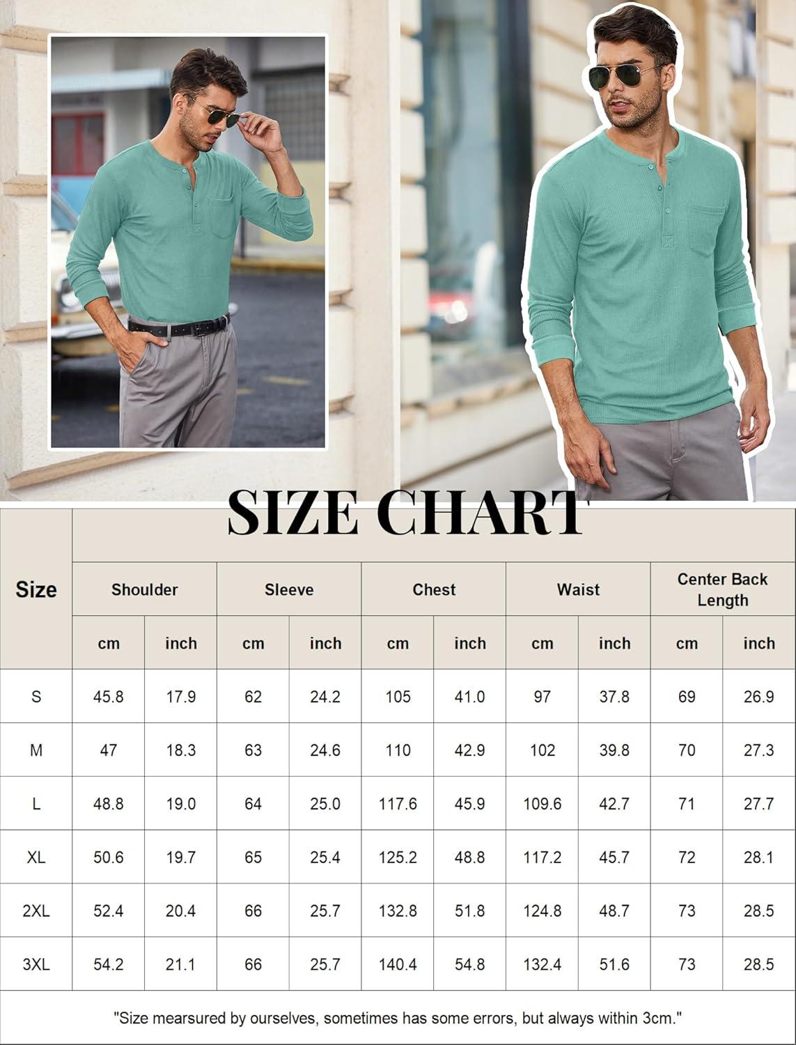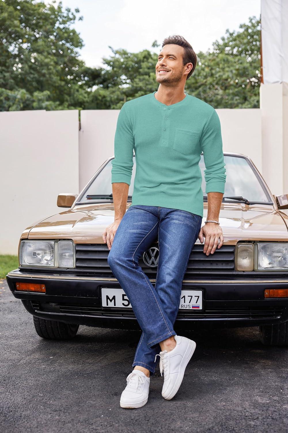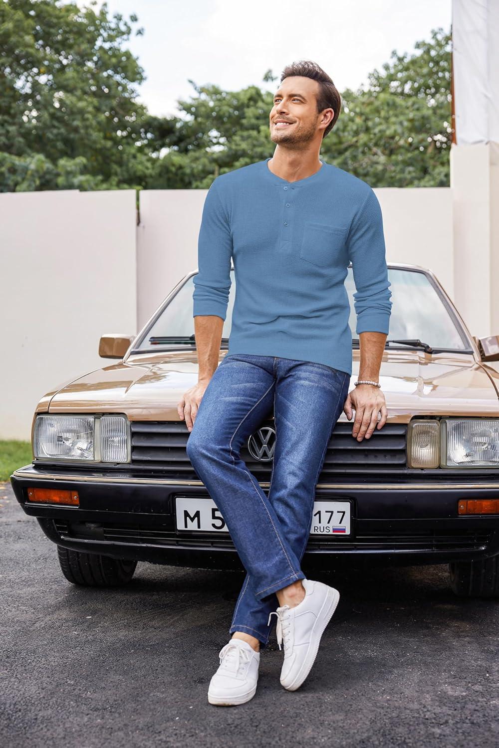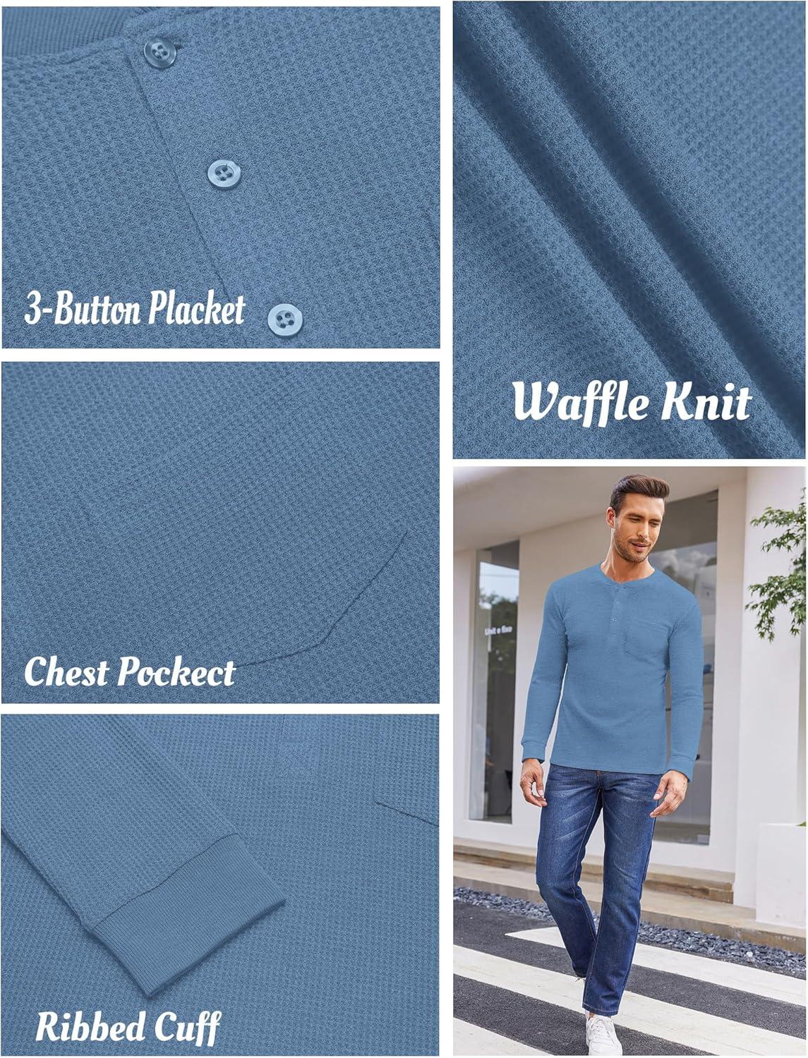 COOFANDY Men’s Henley Shirts Long Sleeve Basic Waffle Pique Pullover T-Shirt with Pocket(Lake Blue)
