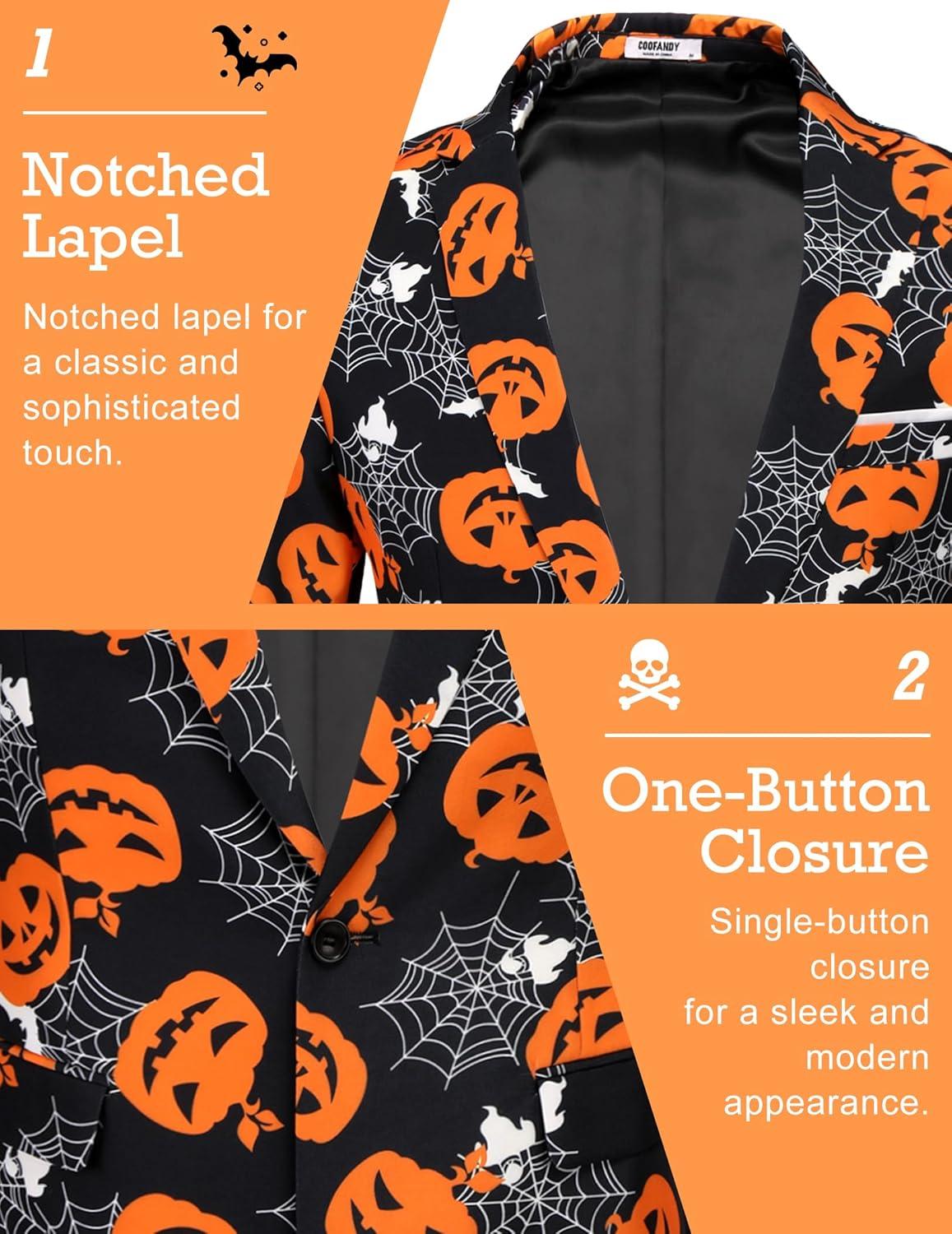 COOFANDY Men’s Christmas Blazer Jacket One Button Halloween Sport Coat Christmas Party Holiday Jacket(Halloween Blazer – Pumpkin & Bat)