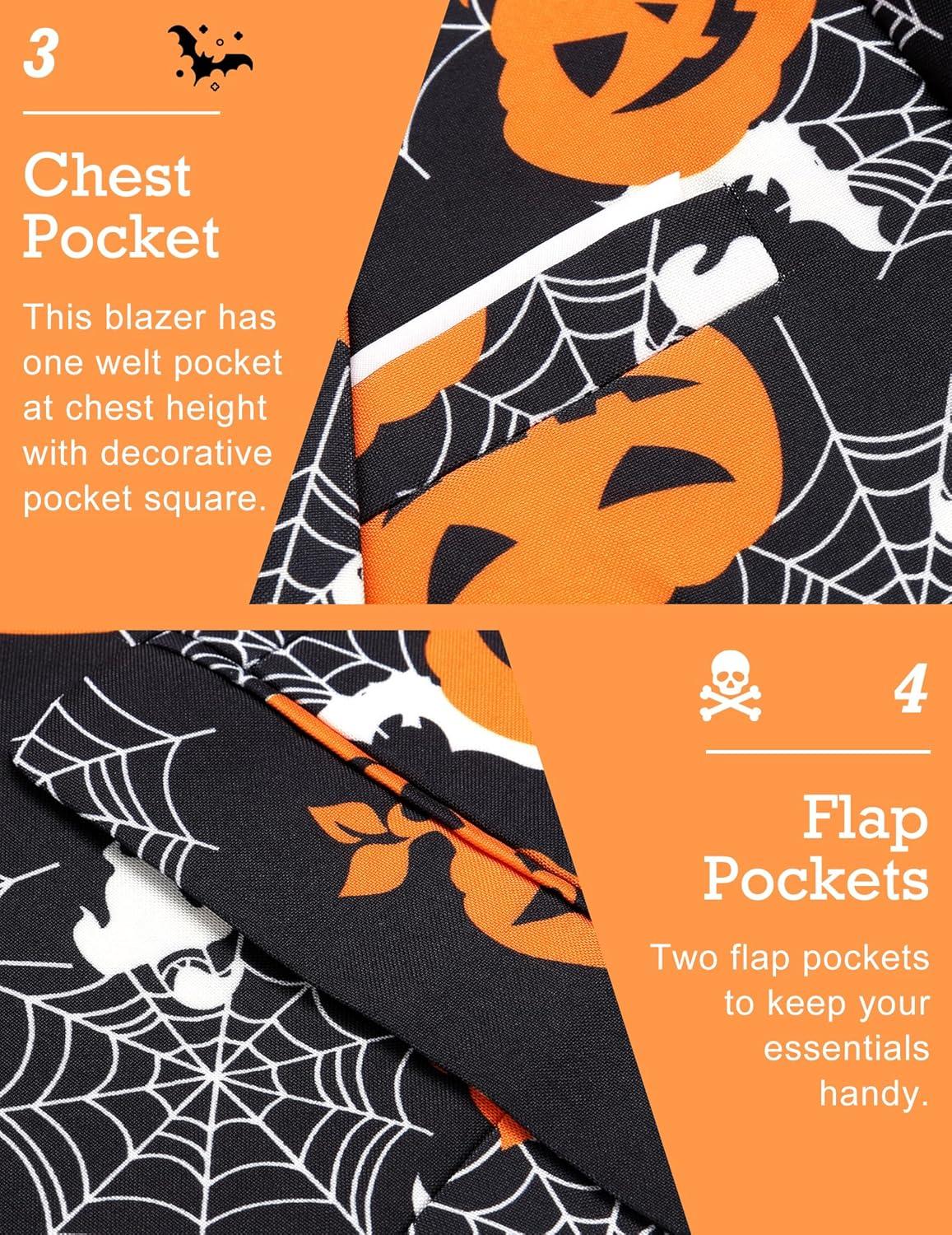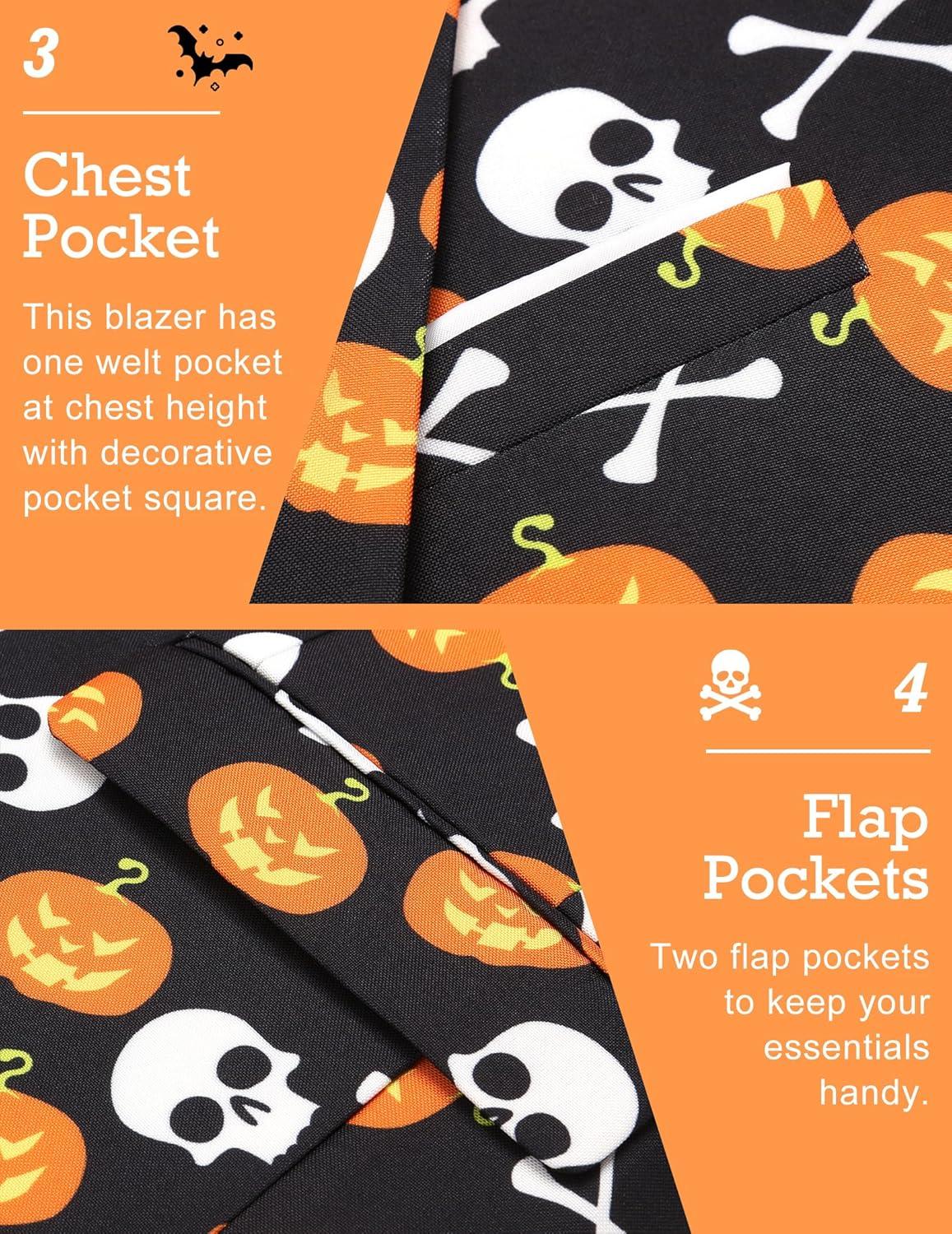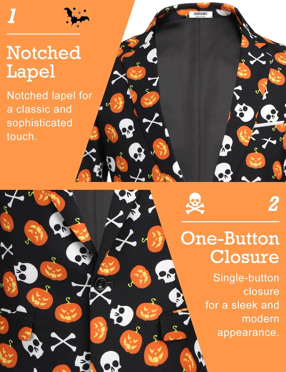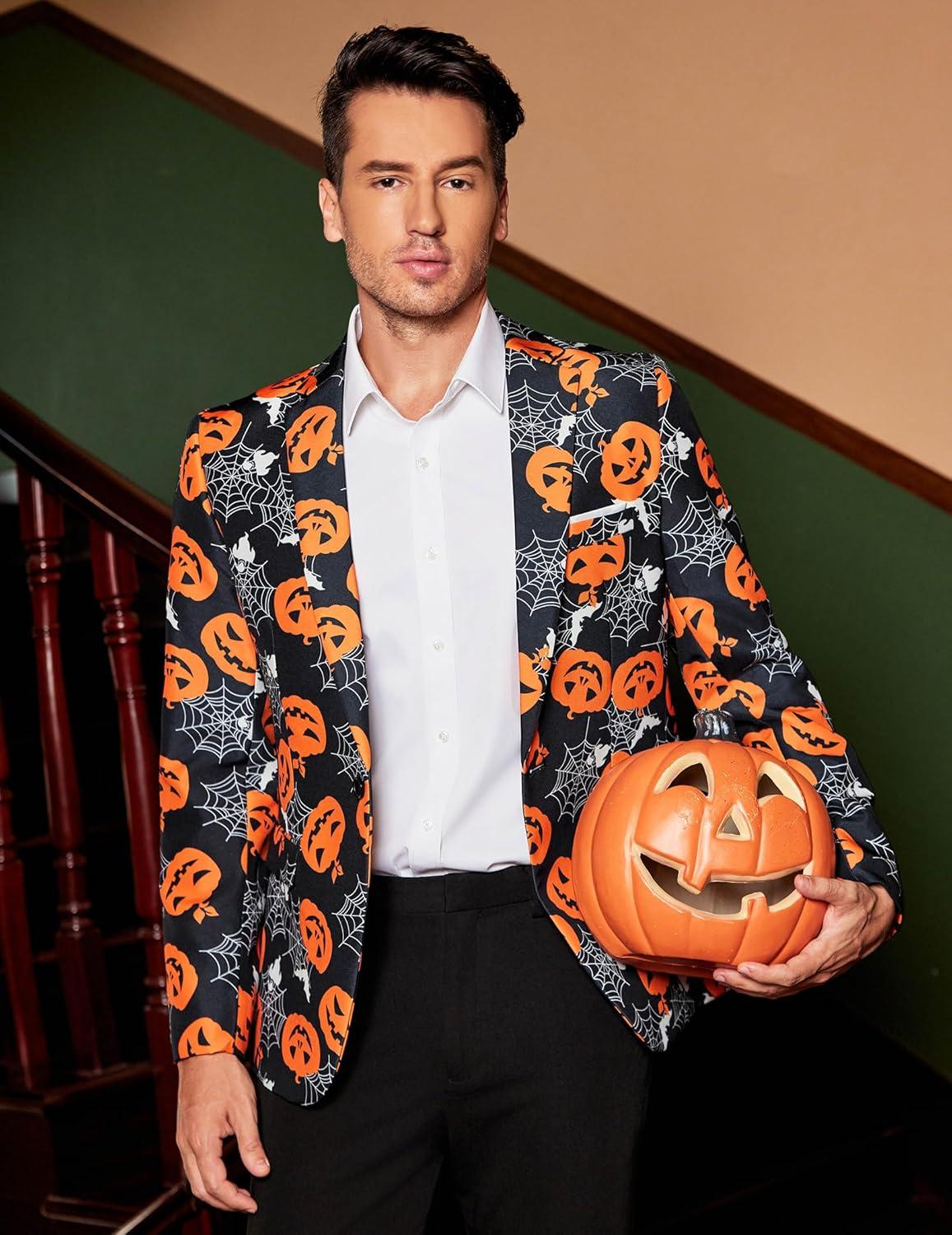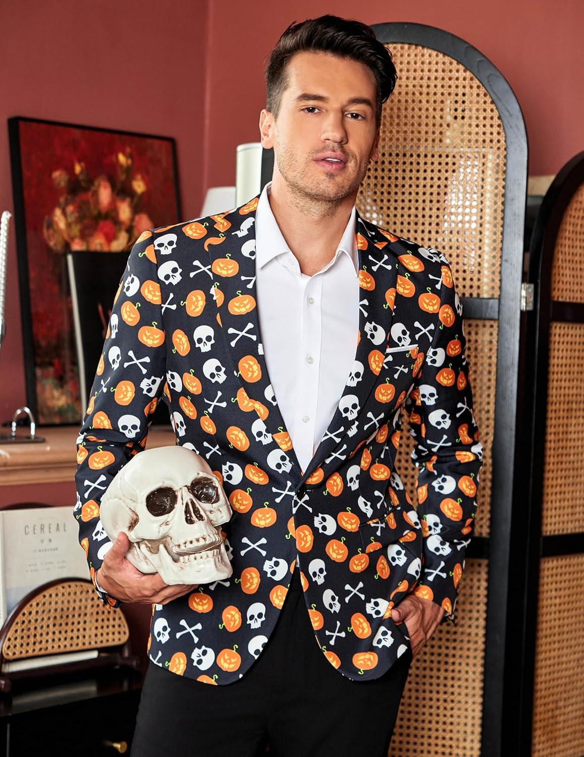 COOFANDY Men’s Christmas Blazer Jacket One Button Halloween Sport Coat Christmas Party Holiday Jacket(Halloween Blazer – Pumpkin & Skull)