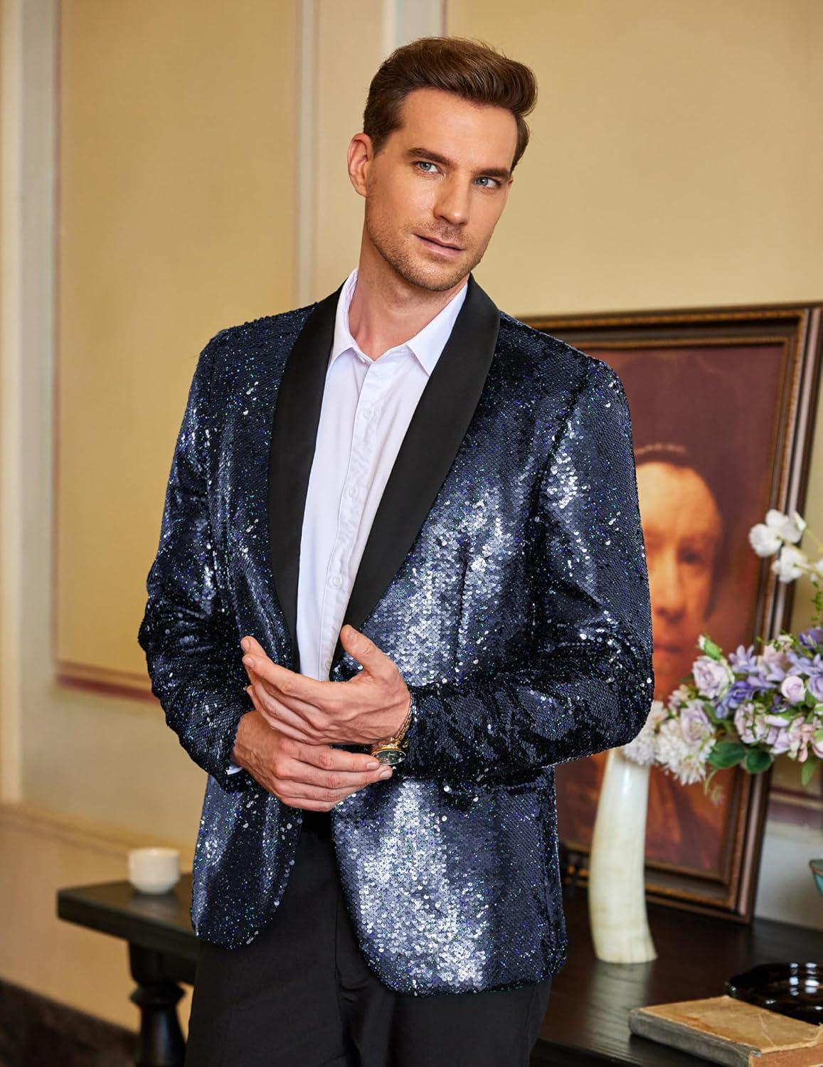 COOFANDY Mens Shiny Sequin Blazer Tuxedo Party Dinner Prom One Button Suit Jacket(Navy Blue)