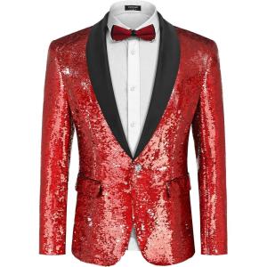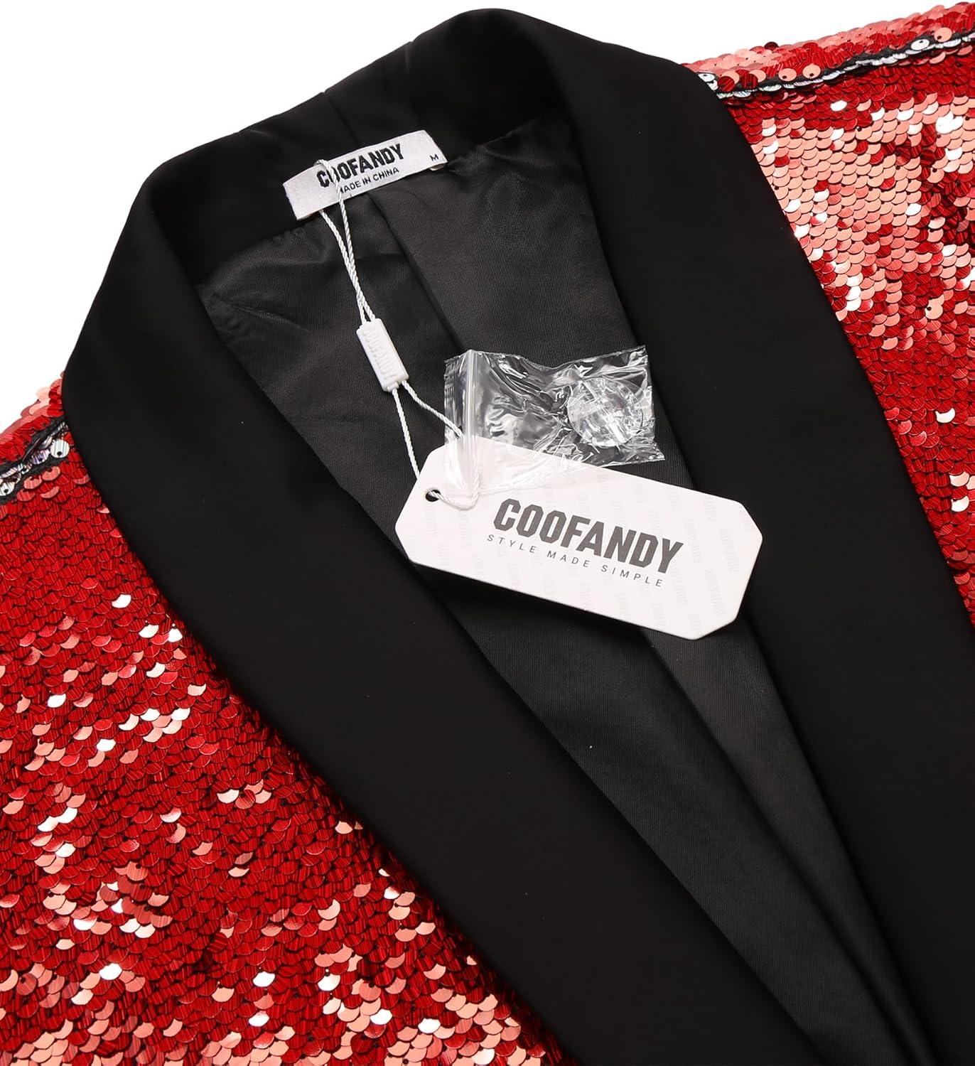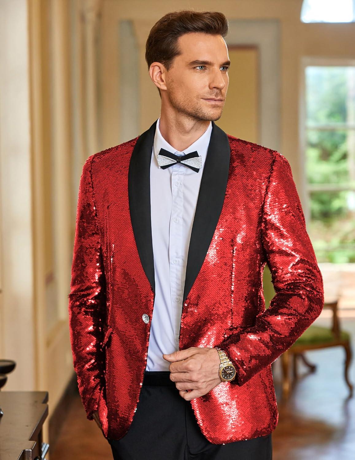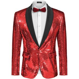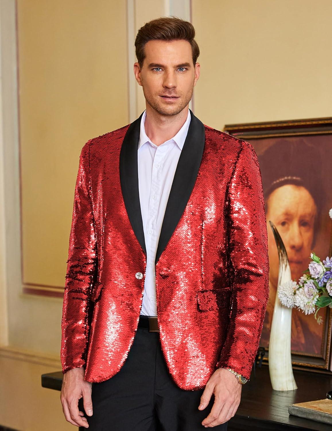 COOFANDY Mens Shiny Sequin Blazer Tuxedo Party Dinner Prom One Button Suit Jacket(Red)