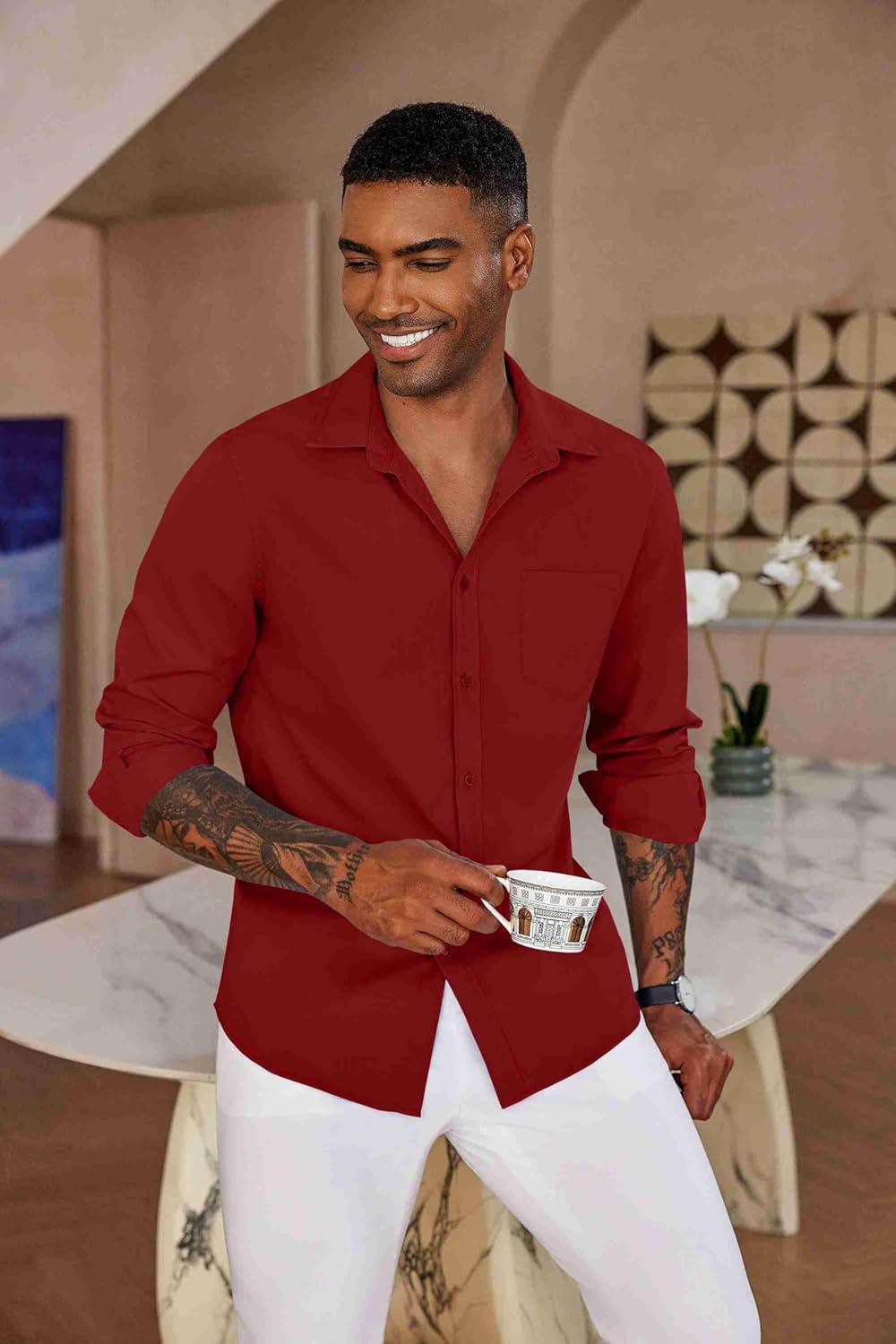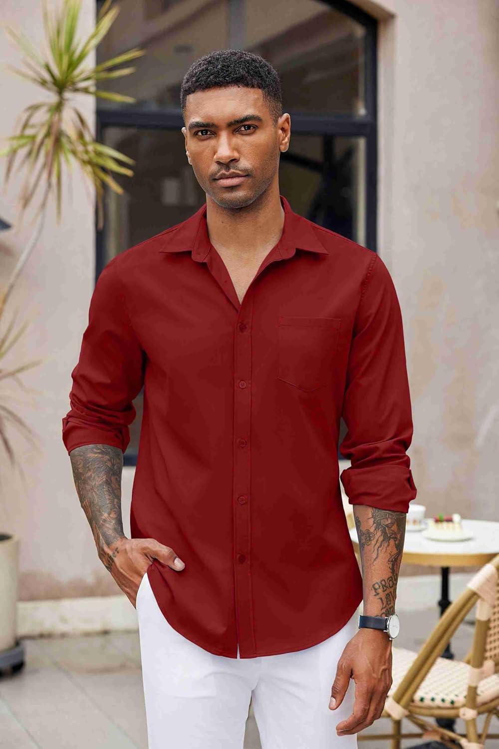 COOFANDY Men’s Button Down Long Sleeve Shirt Casual Untucked Dress Shirt Regular Fit Wedding Shirts(Red Dahlia)