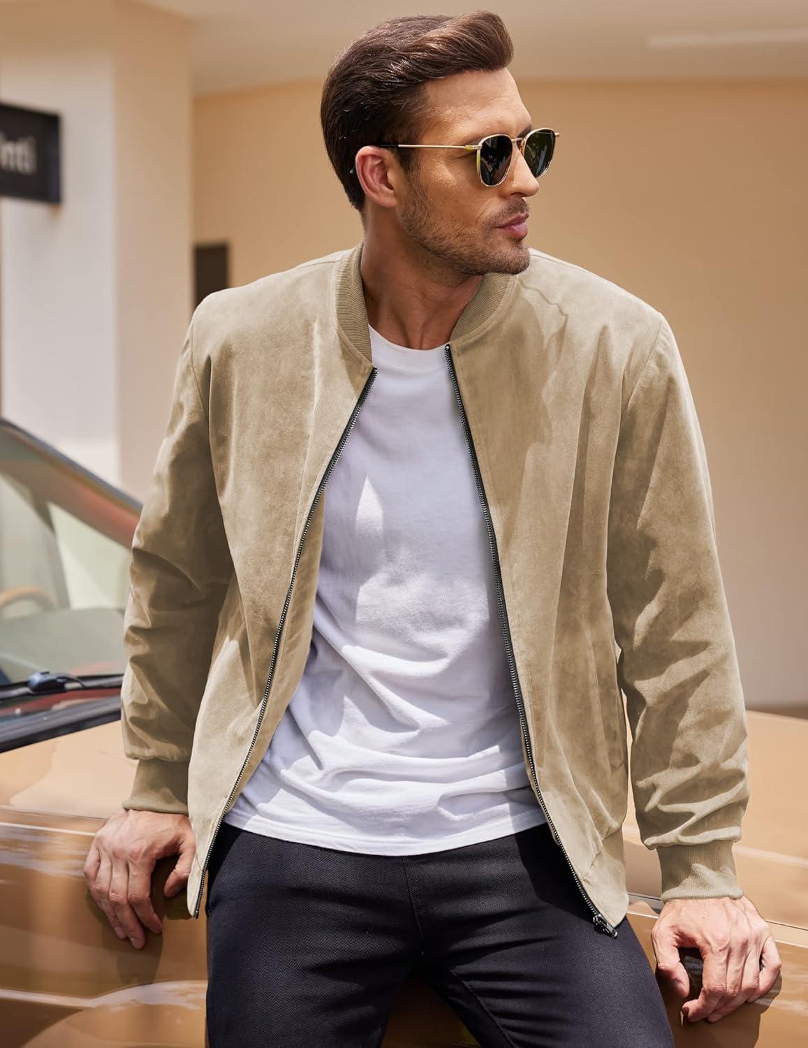 COOFANDY Men’s Casual Varsity Jacket Vintage Lightweight Suede Bomber Jackets(Light Khaki)