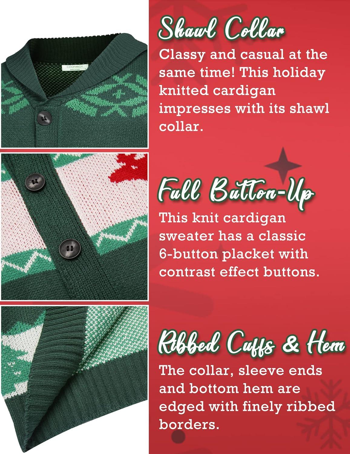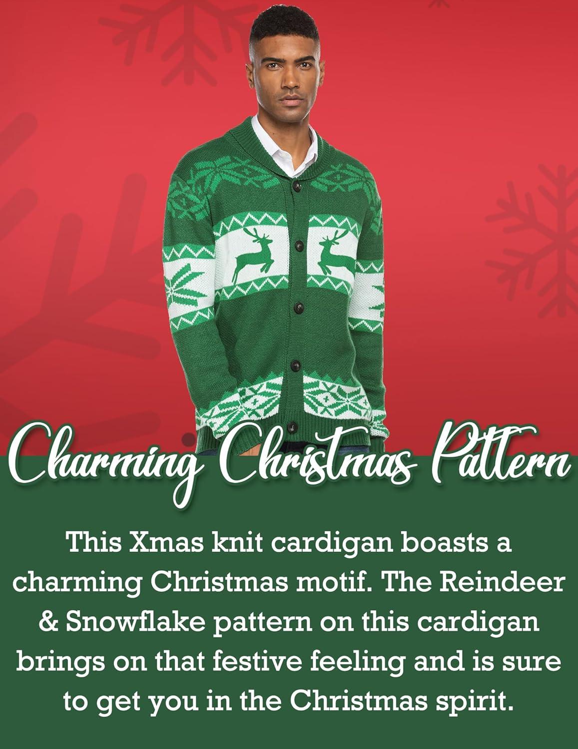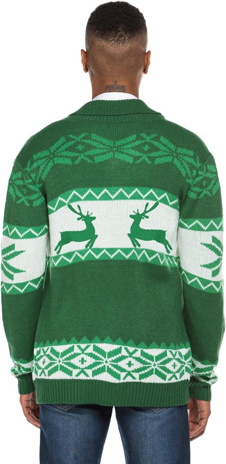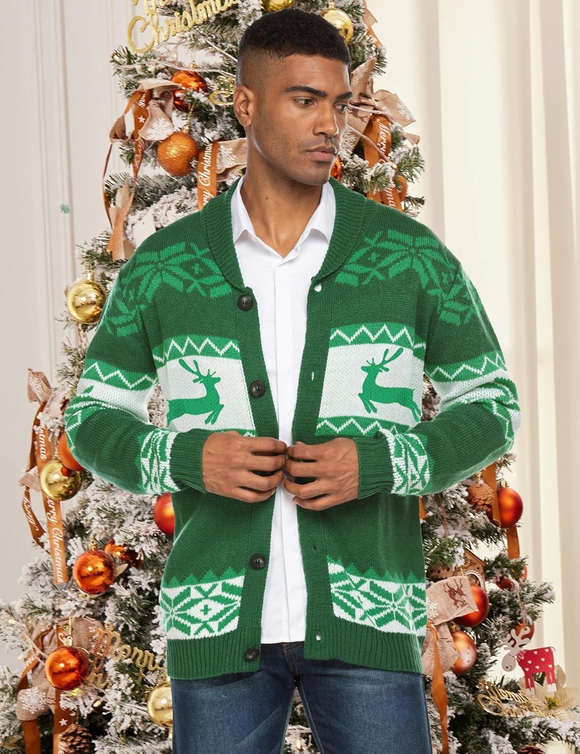 COOFANDY Men’s Christmas Cardigans Ugly Xmas Sweaters Reindeer Snowflake Shawl Collar Knitted Cardigan Sweater(A – Green – a)