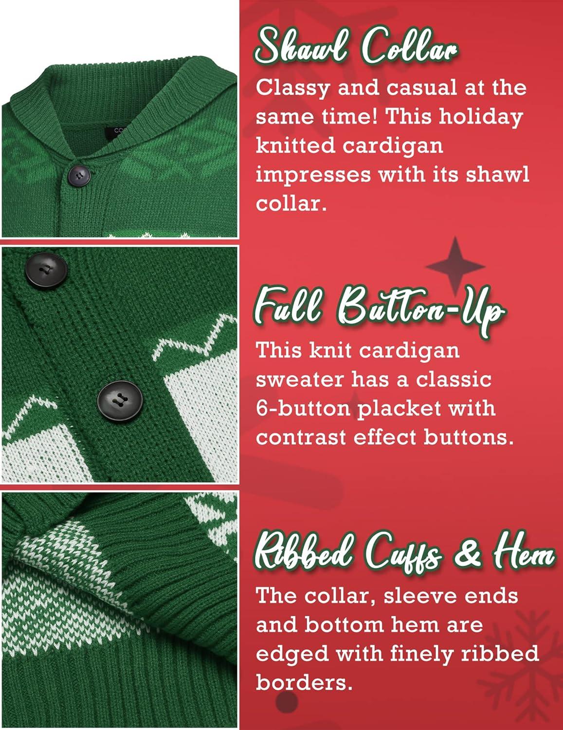 COOFANDY Men’s Christmas Cardigans Ugly Xmas Sweaters Reindeer Snowflake Shawl Collar Knitted Cardigan Sweater(A – Green – B)