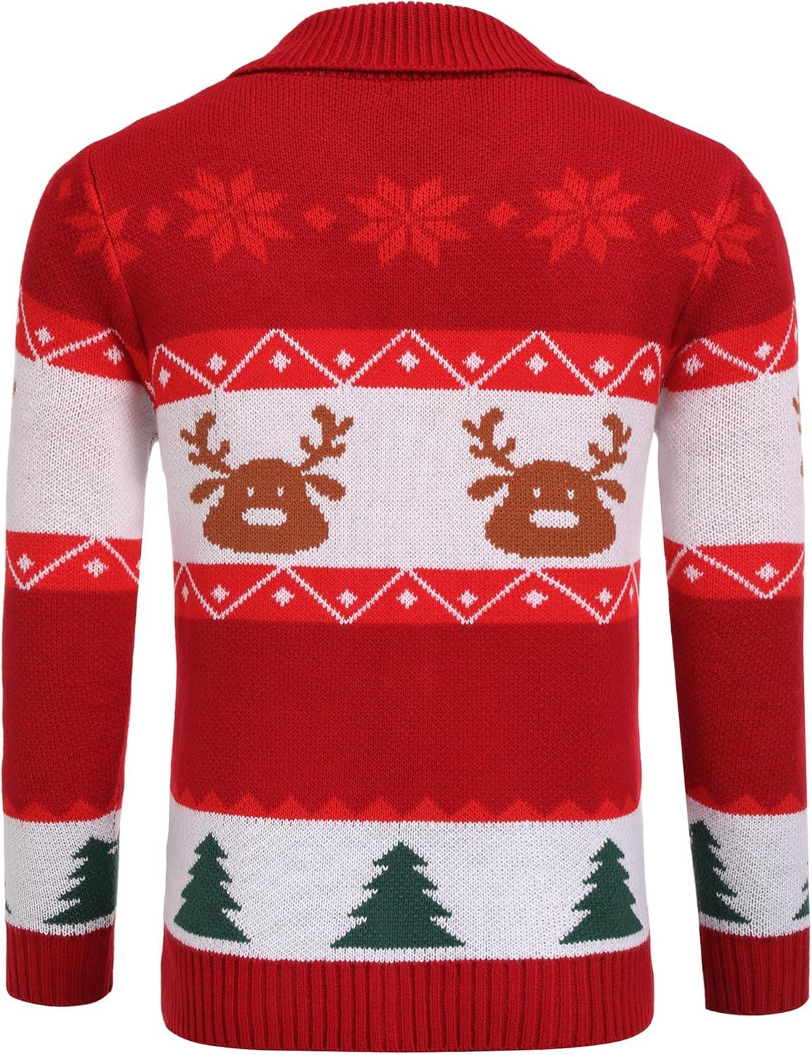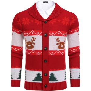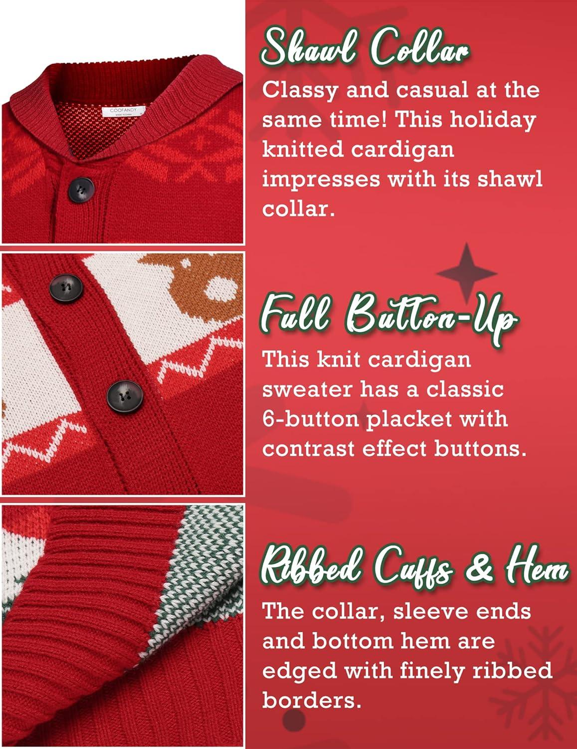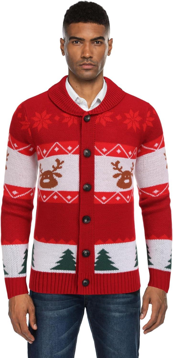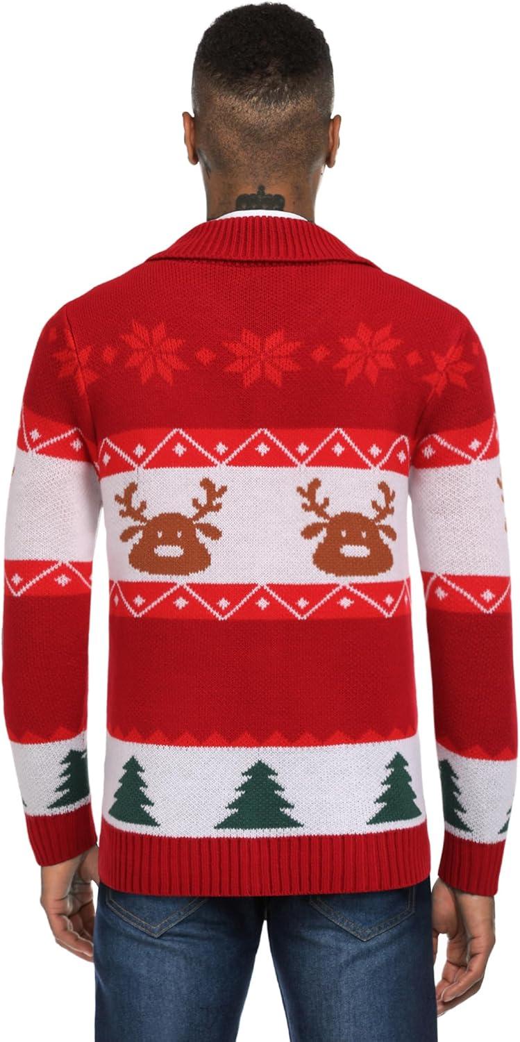 COOFANDY Men’s Christmas Cardigans Ugly Xmas Sweaters Reindeer Snowflake Shawl Collar Knitted Cardigan Sweater(A – Red – a)