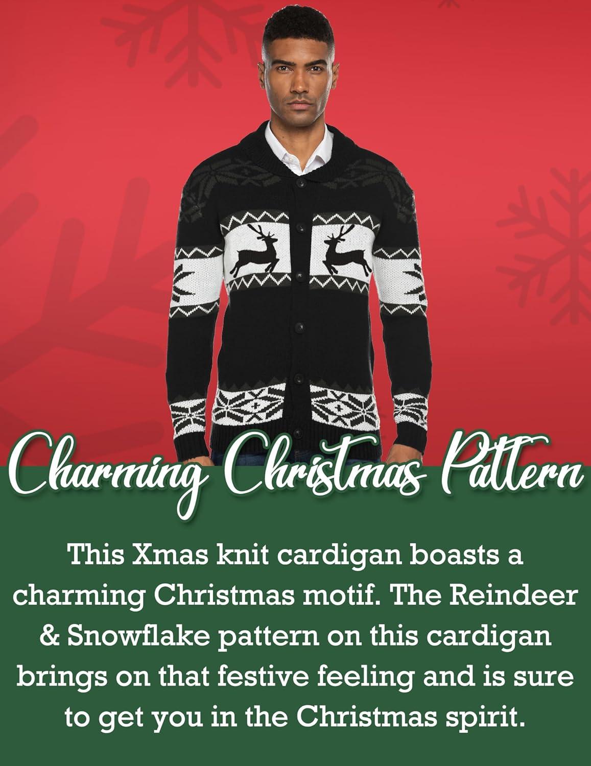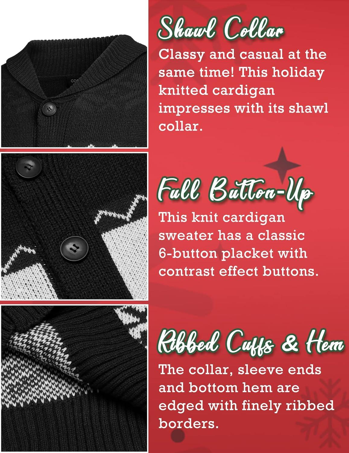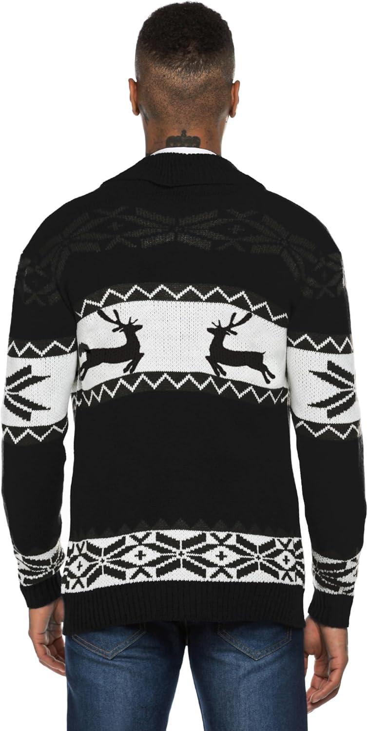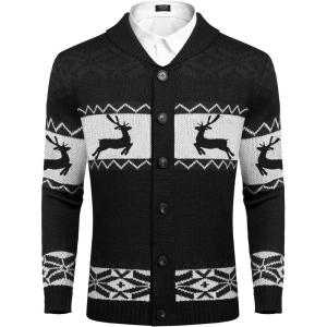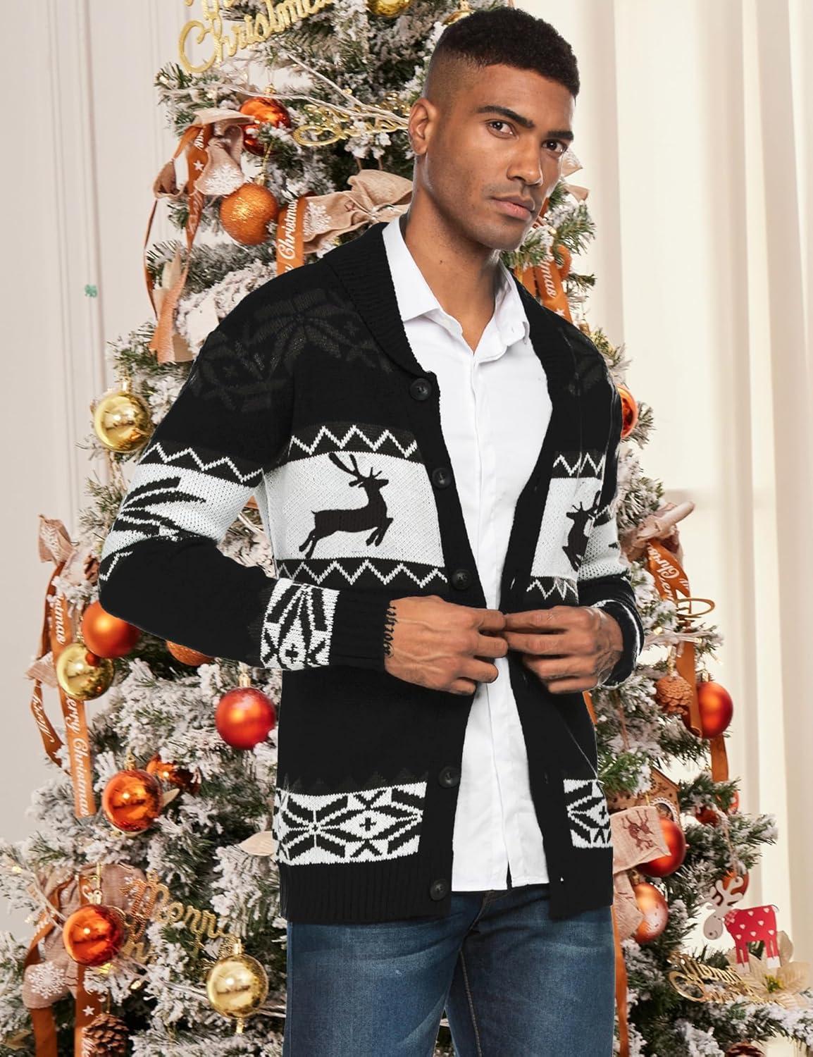 COOFANDY Men’s Christmas Cardigans Ugly Xmas Sweaters Reindeer Snowflake Shawl Collar Knitted Cardigan Sweater(Black)