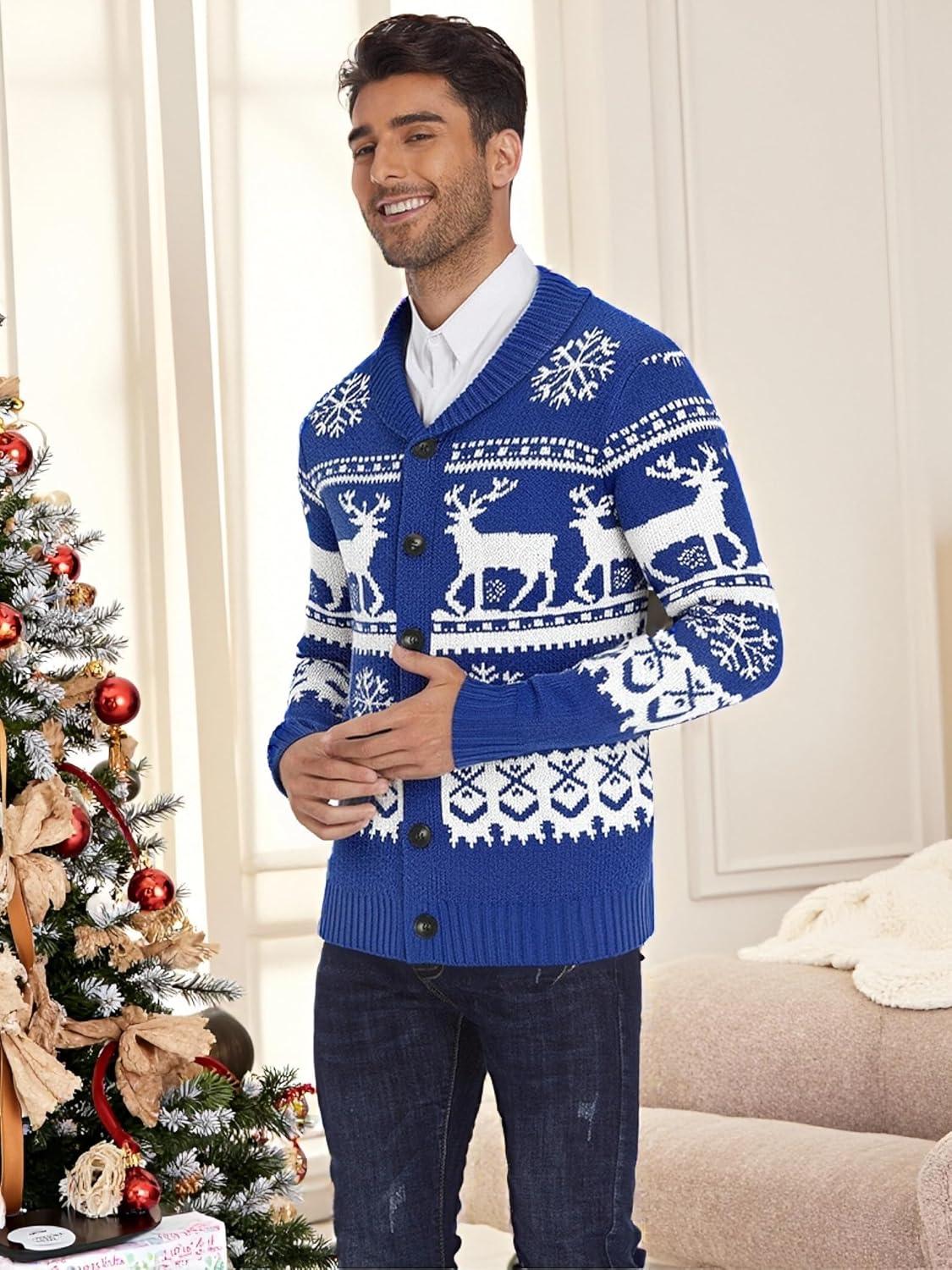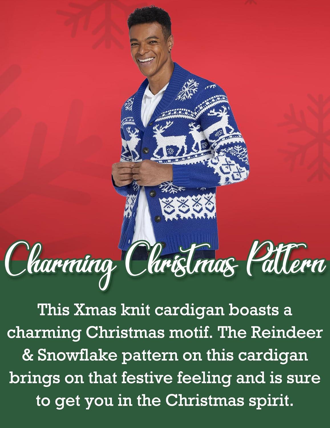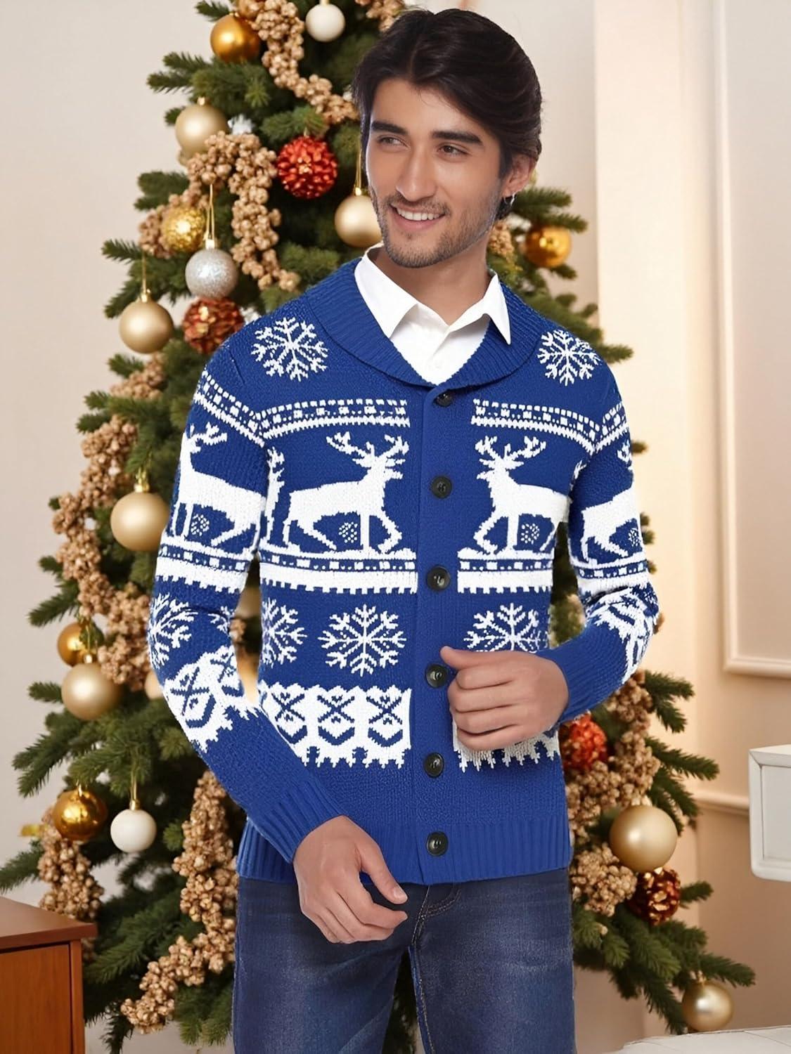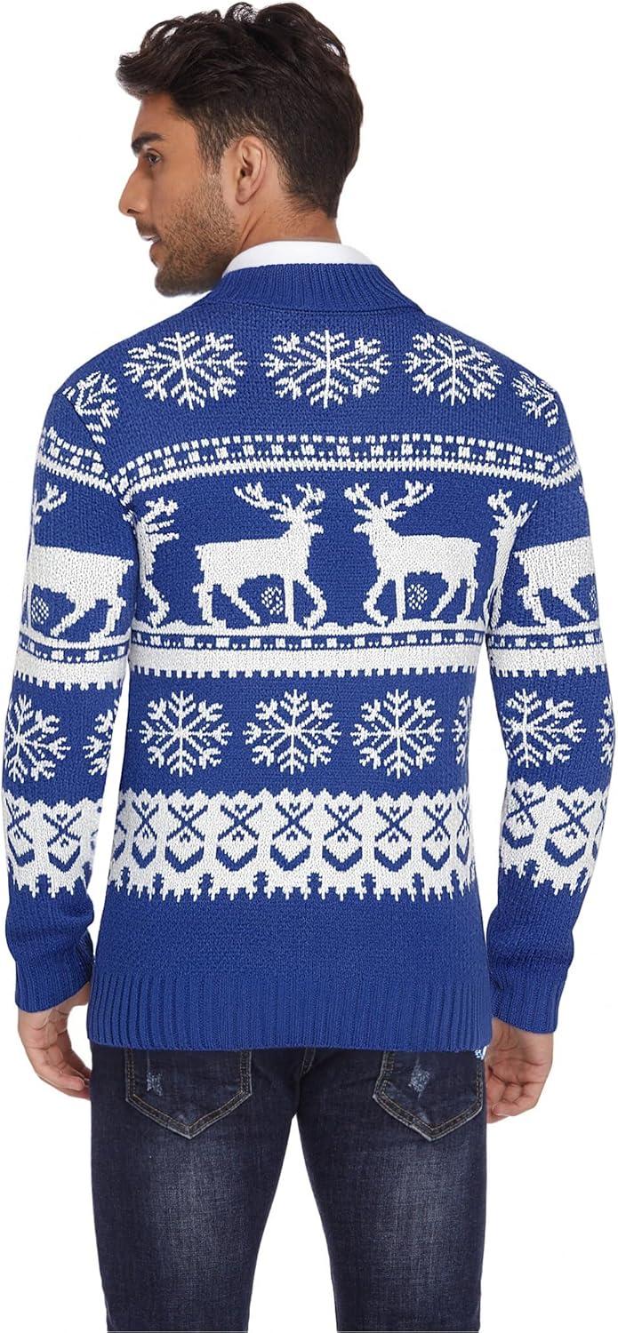 COOFANDY Men’s Christmas Cardigans Ugly Xmas Sweaters Reindeer Snowflake Shawl Collar Knitted Cardigan Sweater(Blue-white Snowflake Elk)