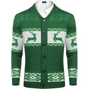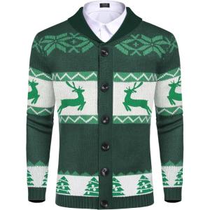 COOFANDY Men’s Christmas Cardigans Ugly Xmas Sweaters Reindeer Snowflake Shawl Collar Knitted Cardigan Sweater(A – Green – C)
