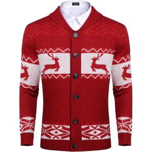 COOFANDY Men’s Christmas Cardigans Ugly Xmas Sweaters Reindeer Snowflake Shawl Collar Knitted Cardigan Sweater(A – Red – C)