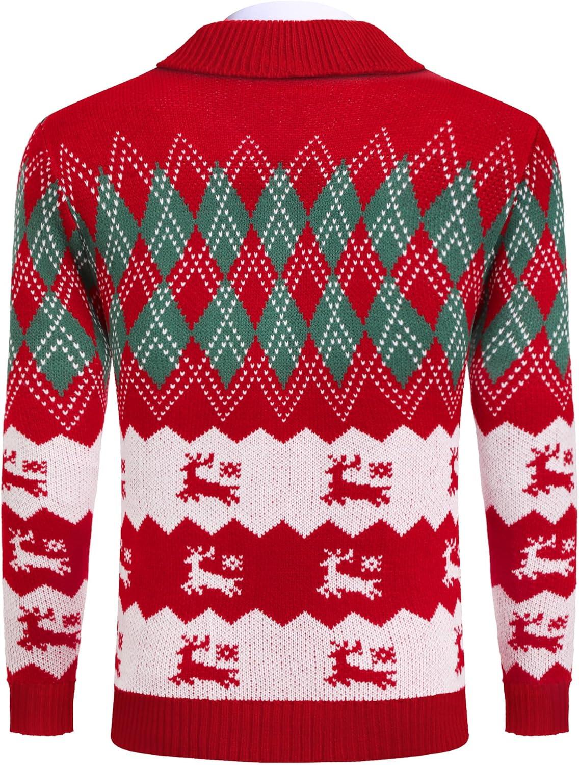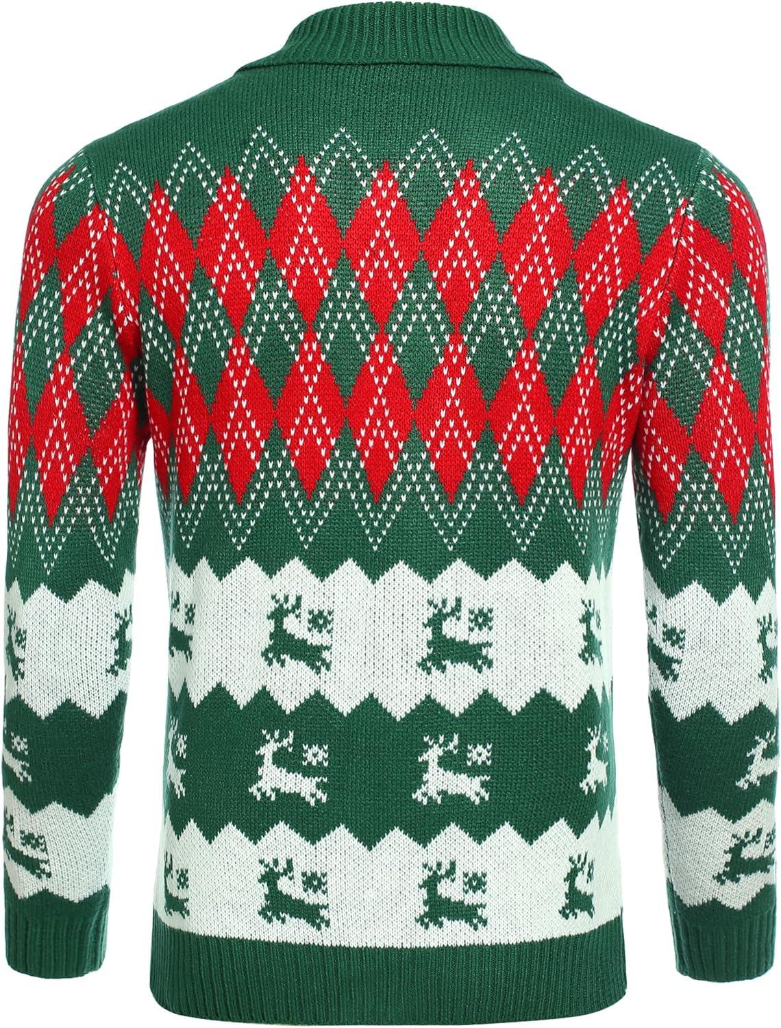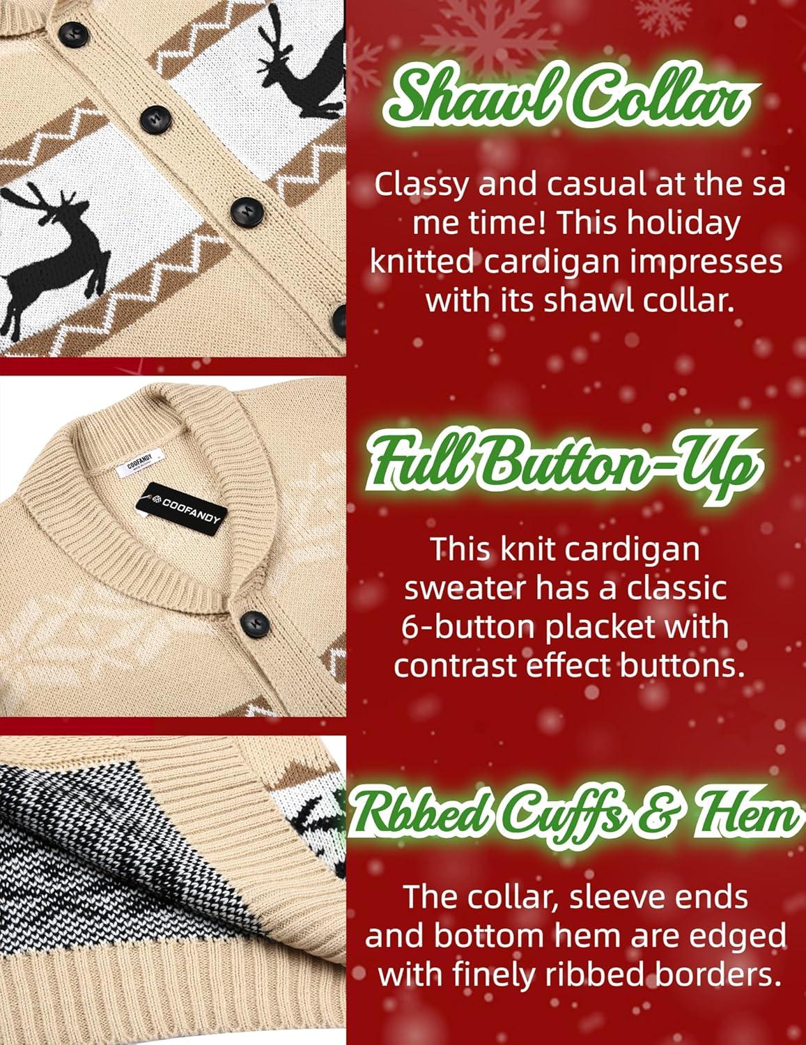 COOFANDY Men’s Christmas Cardigans Ugly Xmas Sweaters Reindeer Snowflake Shawl Collar Knitted Cardigan Sweater(Red Elk Green White)