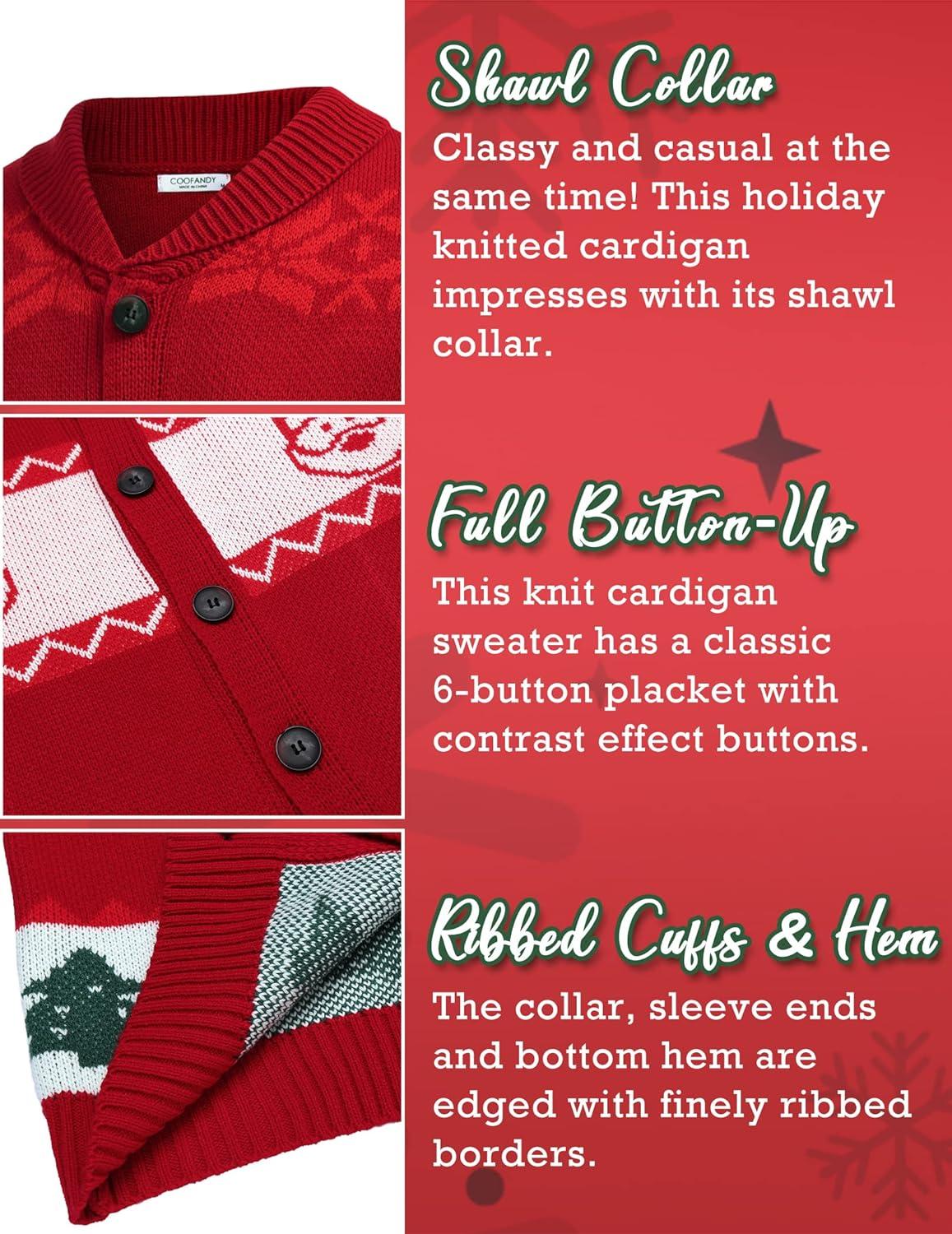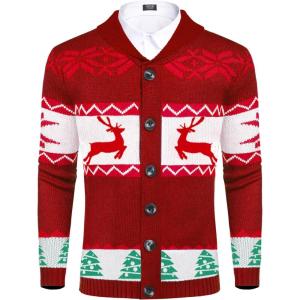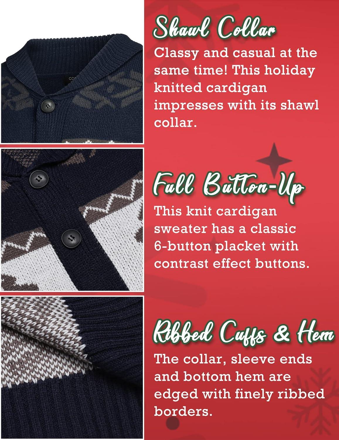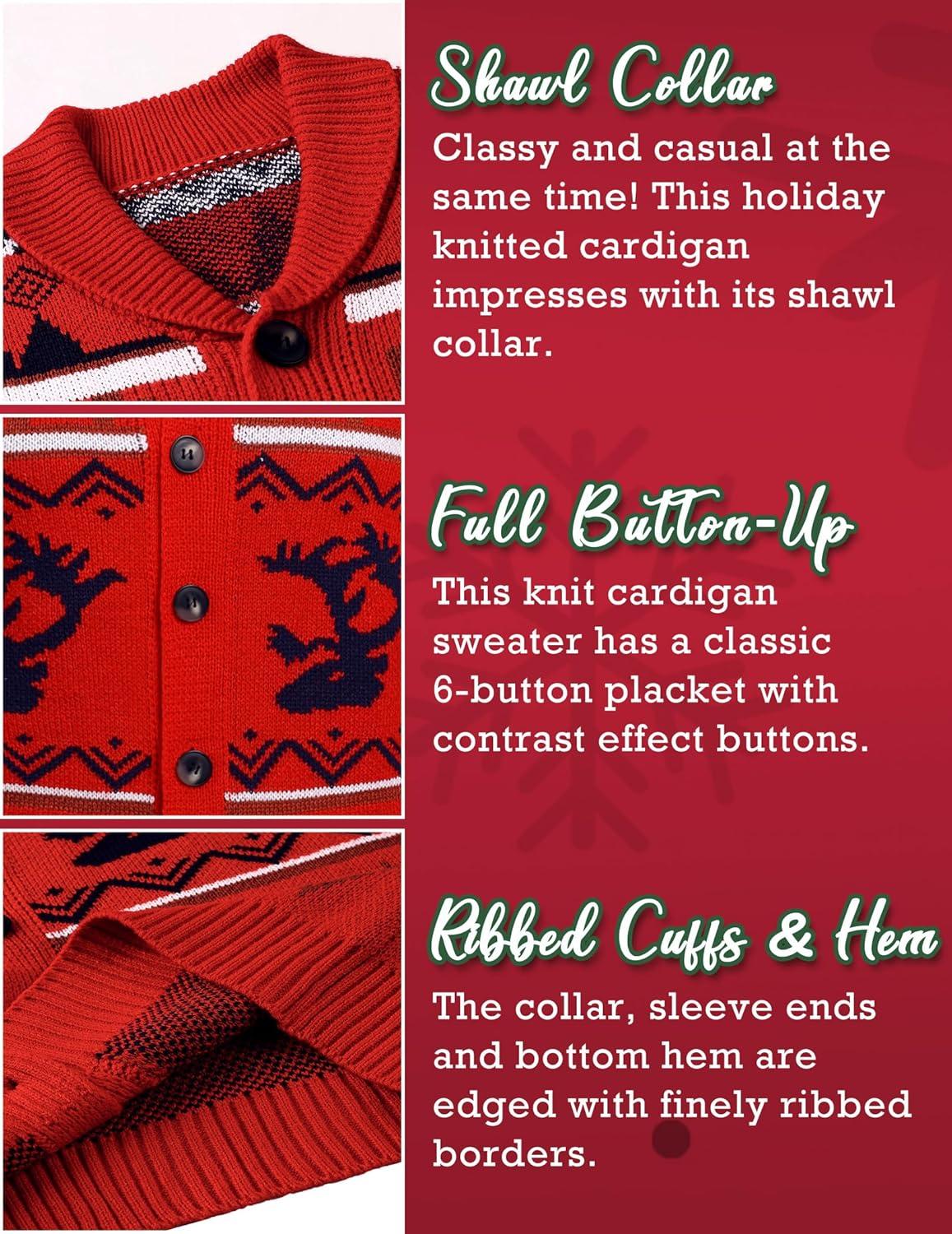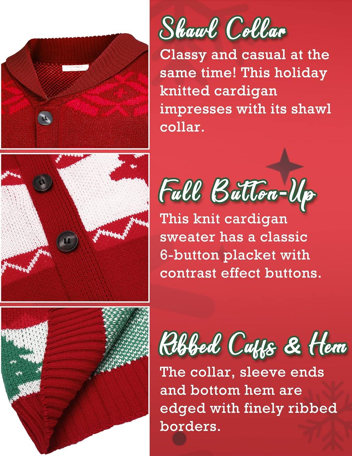 COOFANDY Men’s Christmas Cardigans Ugly Xmas Sweaters Reindeer Snowflake Shawl Collar Knitted Cardigan Sweater(Christmas Red)
