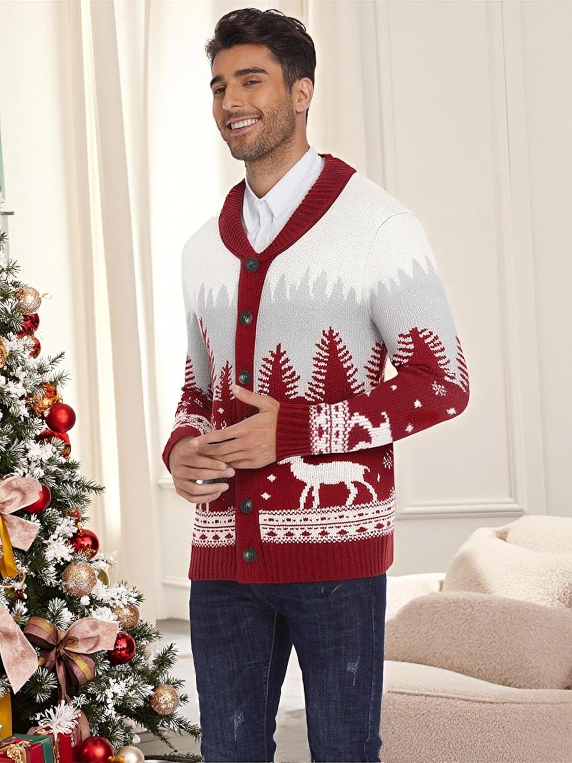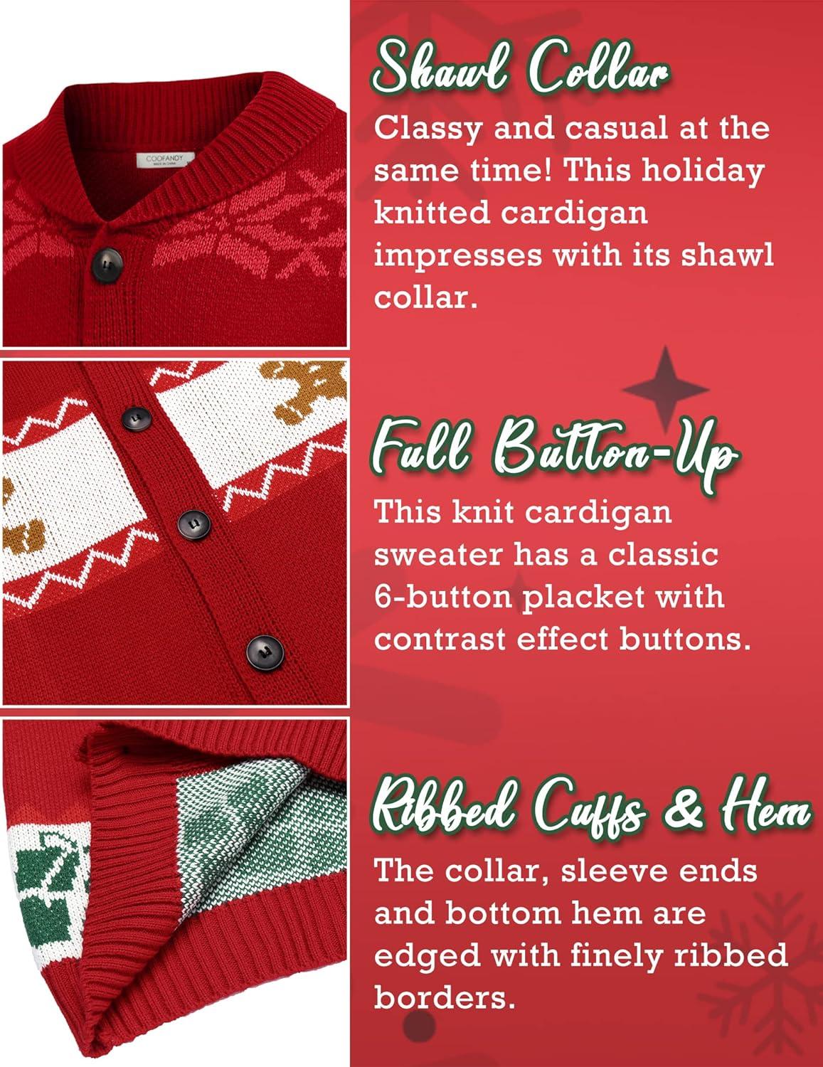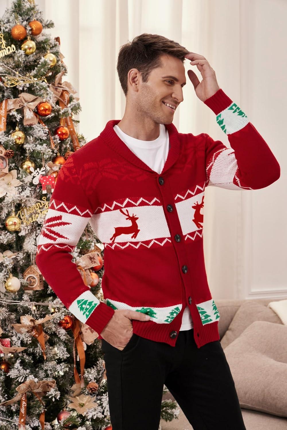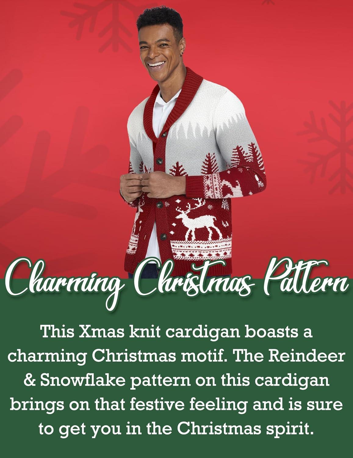 COOFANDY Men’s Christmas Cardigans Ugly Xmas Sweaters Reindeer Snowflake Shawl Collar Knitted Cardigan Sweater(Christmas Red)