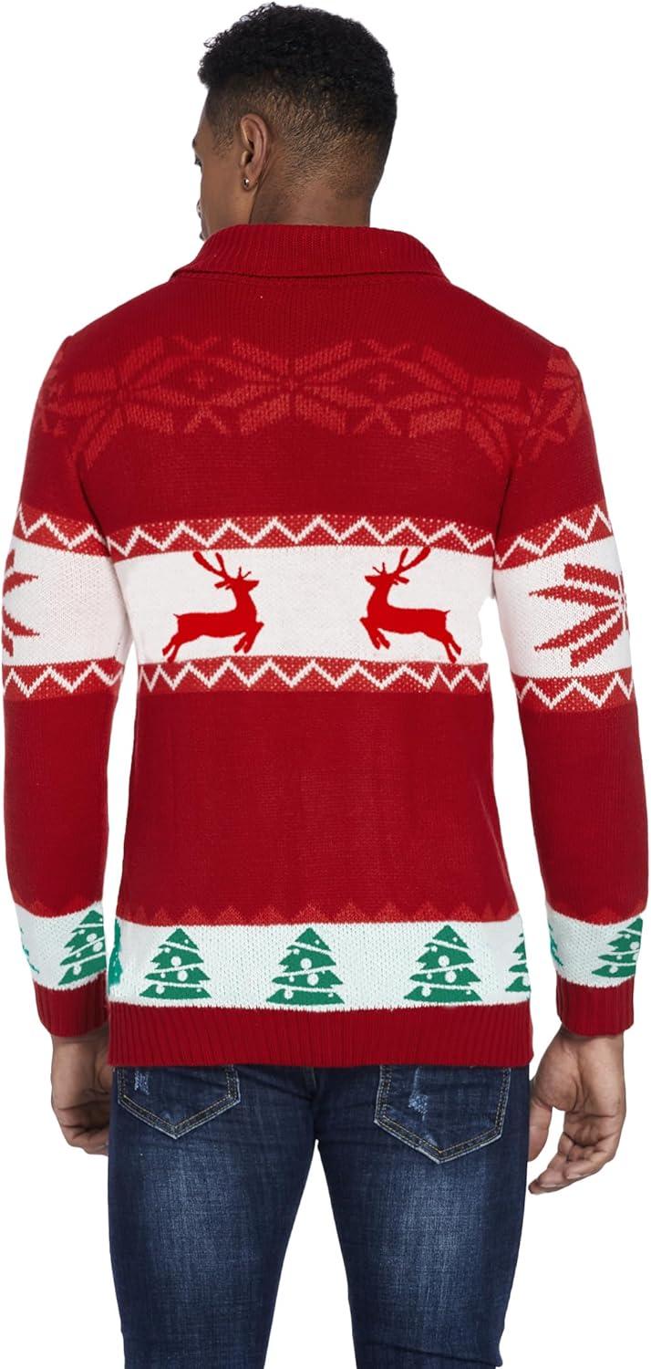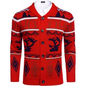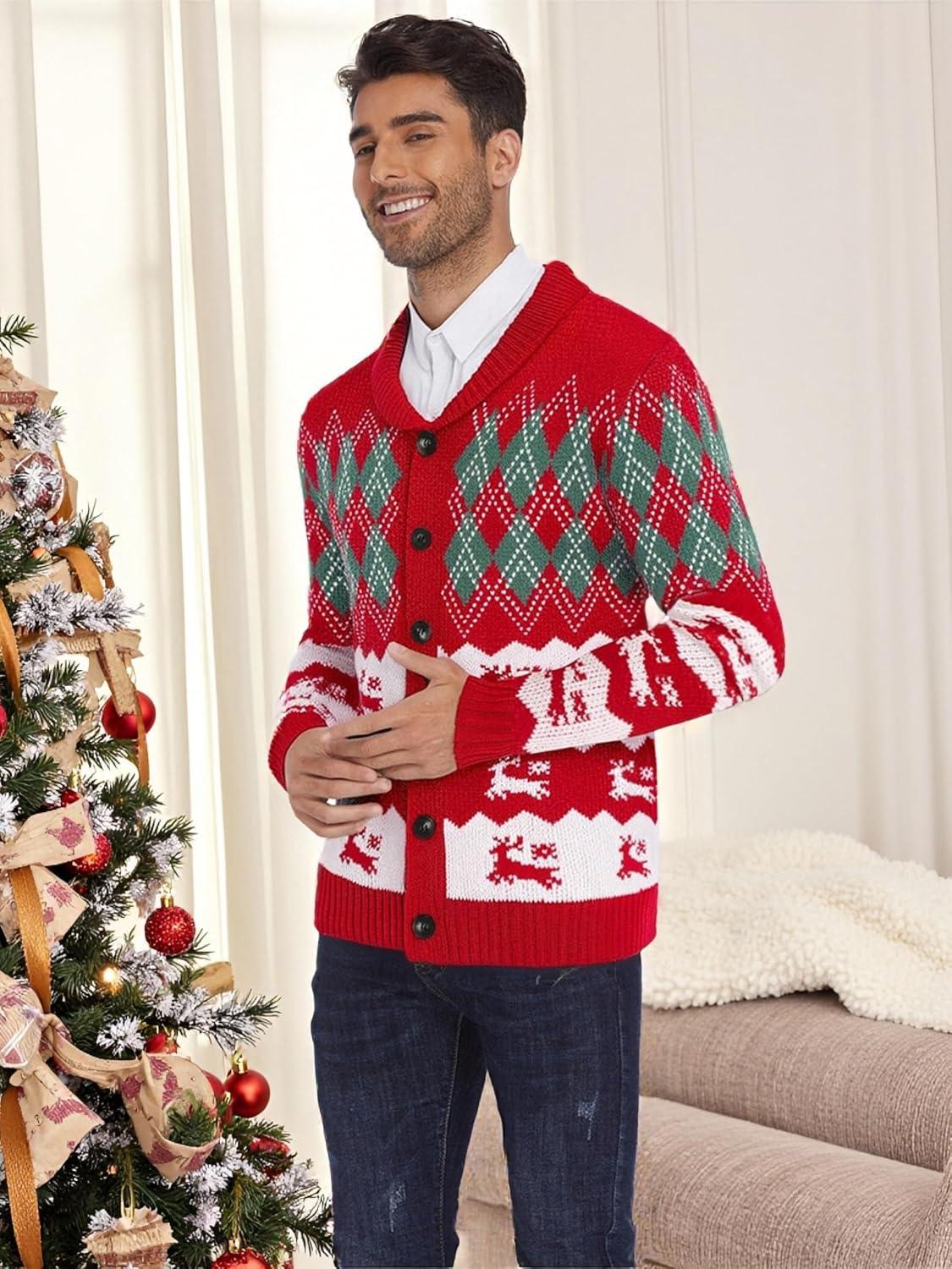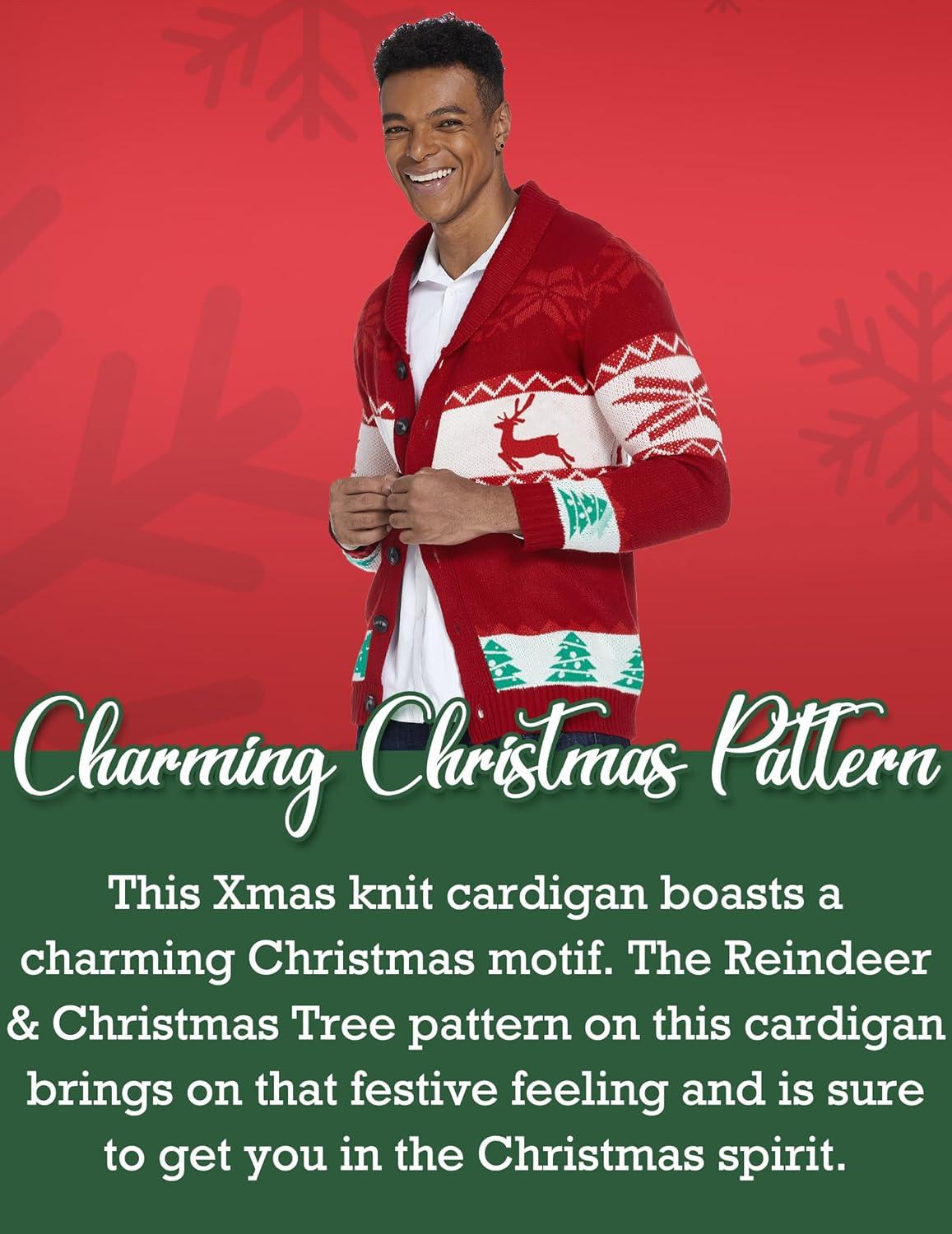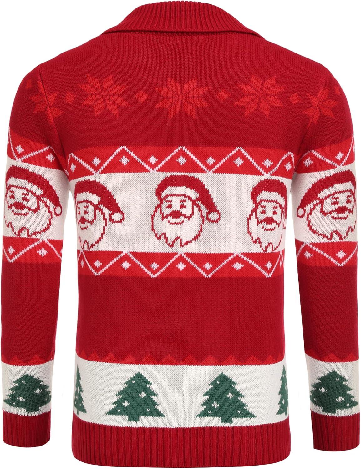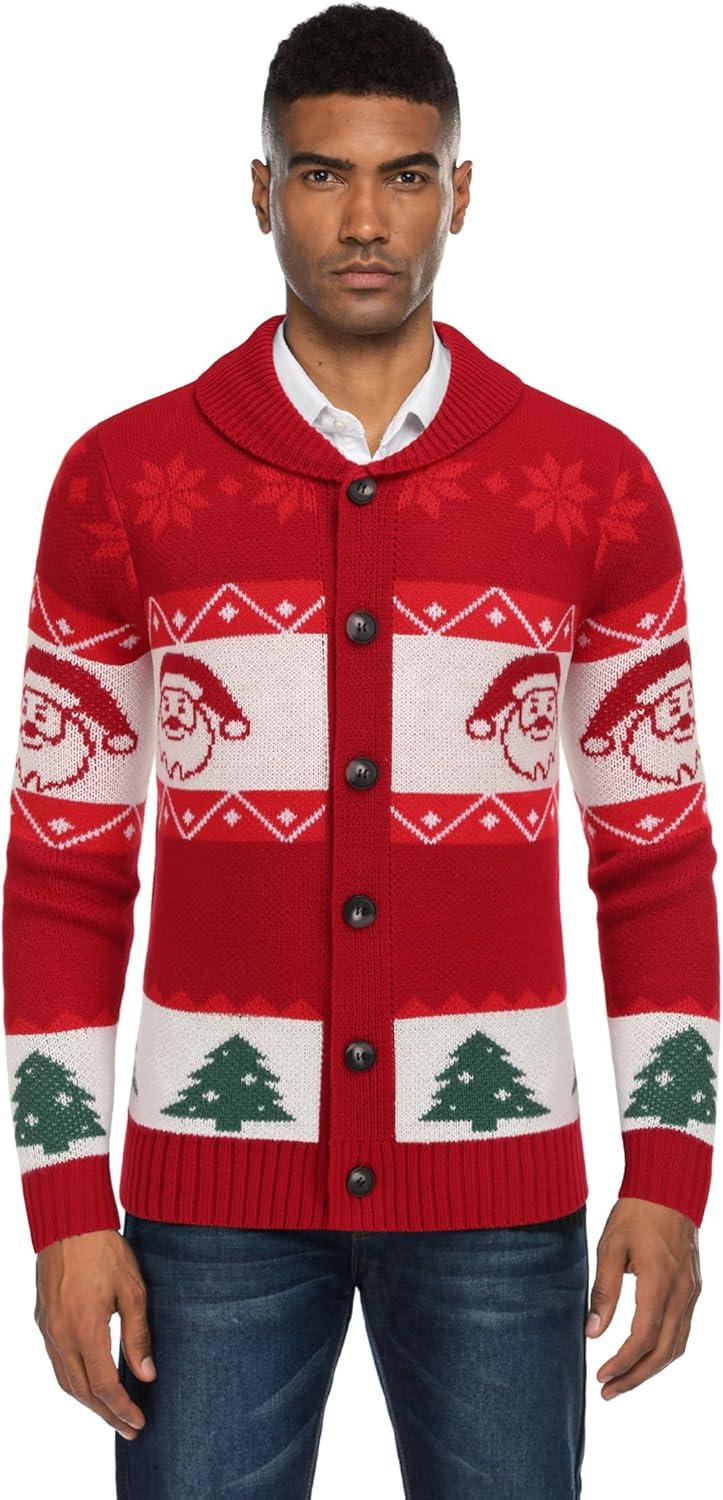 COOFANDY Men’s Christmas Cardigans Ugly Xmas Sweaters Reindeer Snowflake Shawl Collar Knitted Cardigan Sweater(Christmas Red)