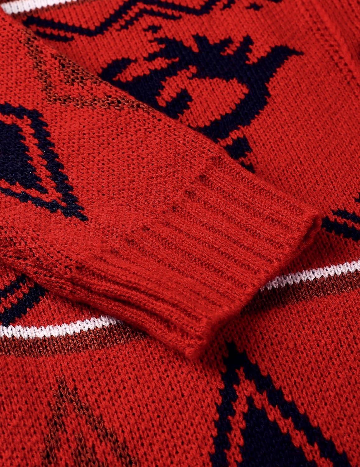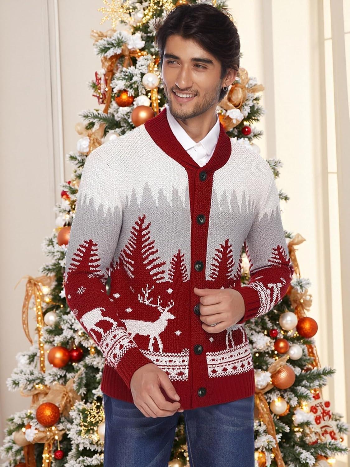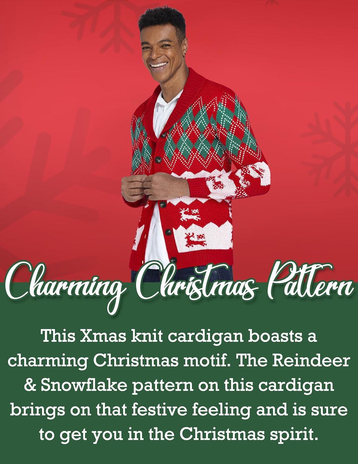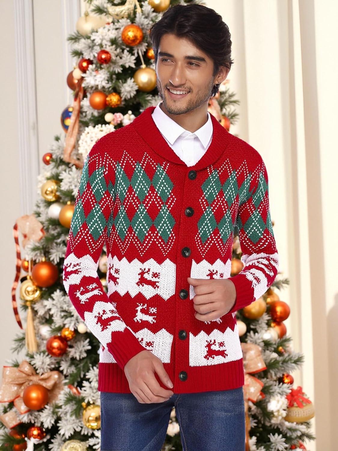 COOFANDY Men’s Christmas Cardigans Ugly Xmas Sweaters Reindeer Snowflake Shawl Collar Knitted Cardigan Sweater(Christmas Red)