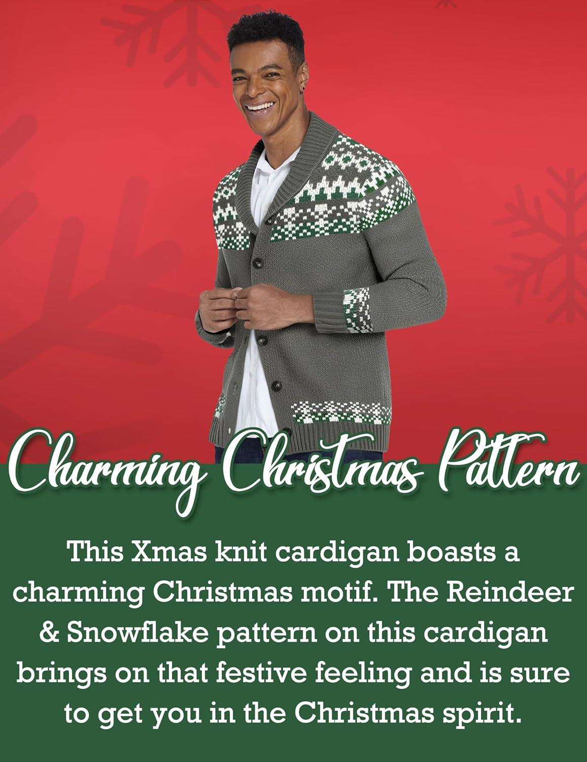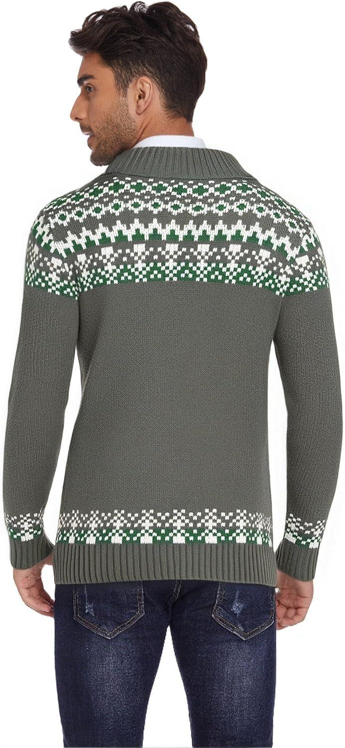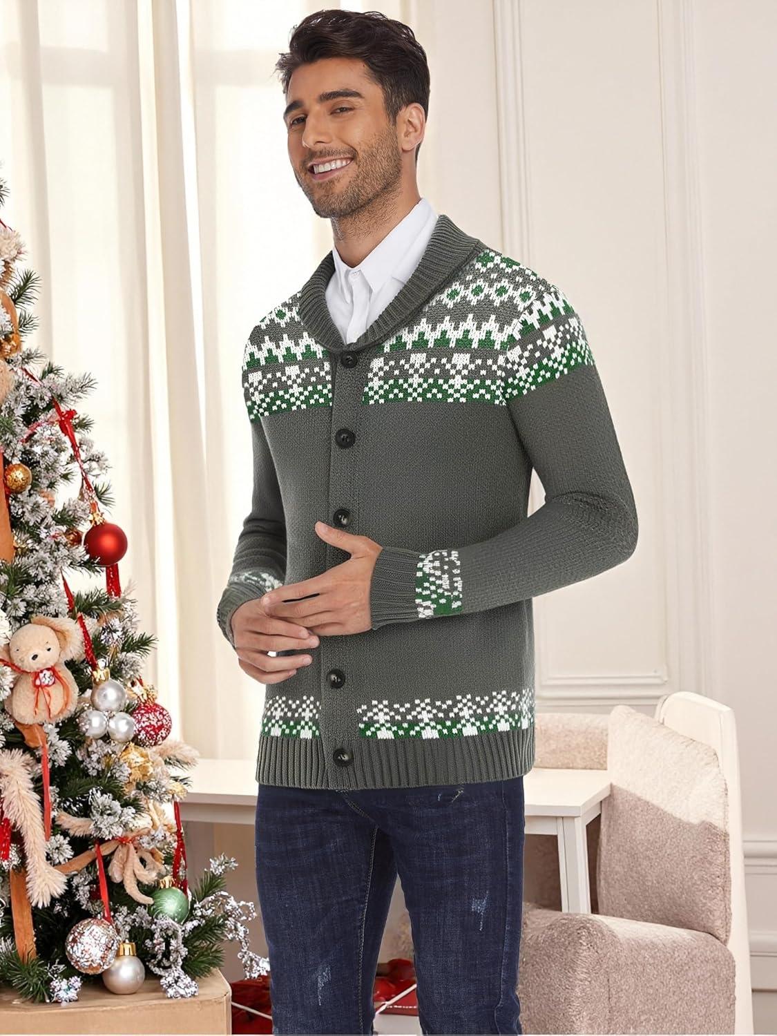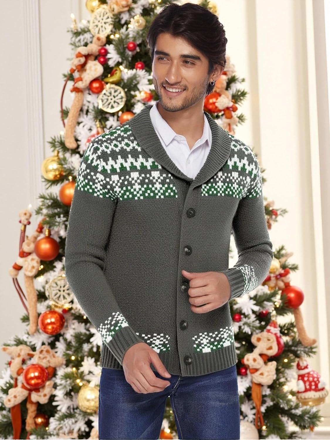 COOFANDY Men’s Christmas Cardigans Ugly Xmas Sweaters Reindeer Snowflake Shawl Collar Knitted Cardigan Sweater(Gray-green-white)