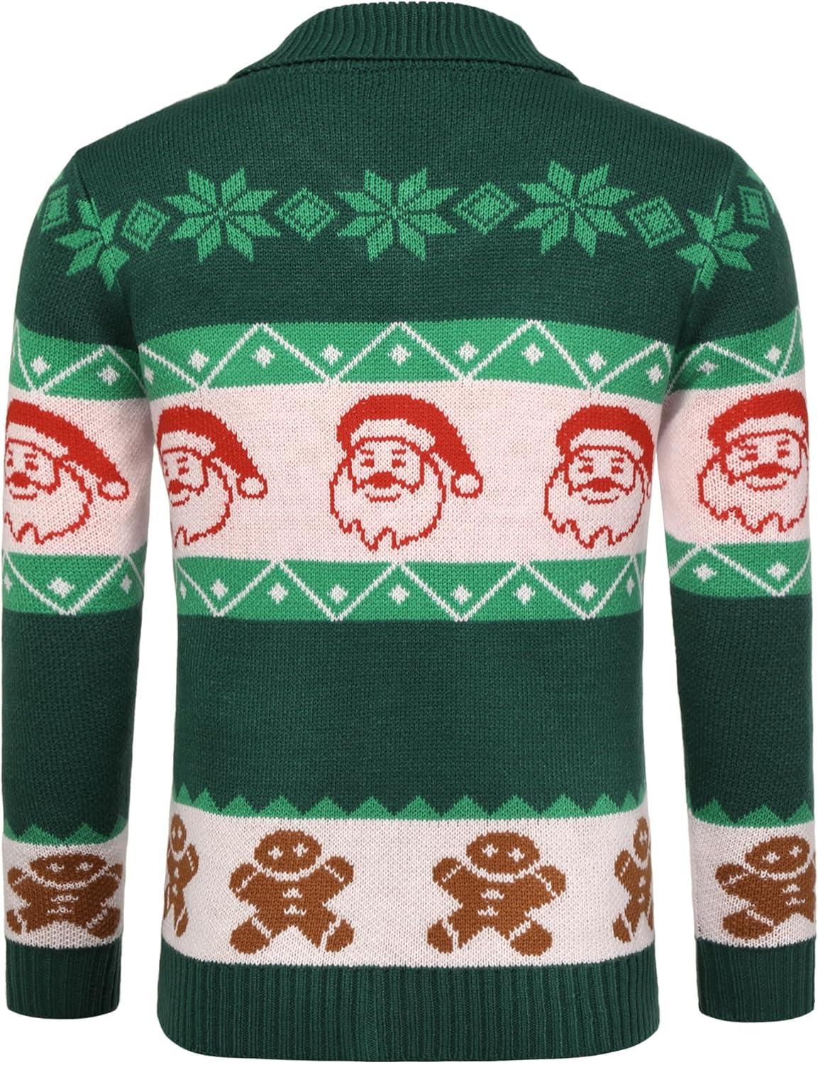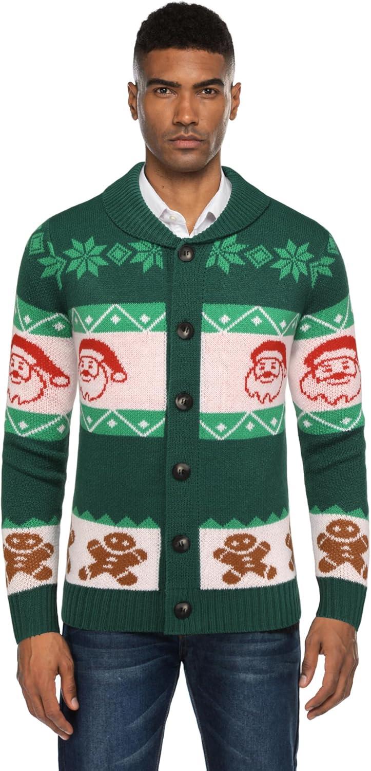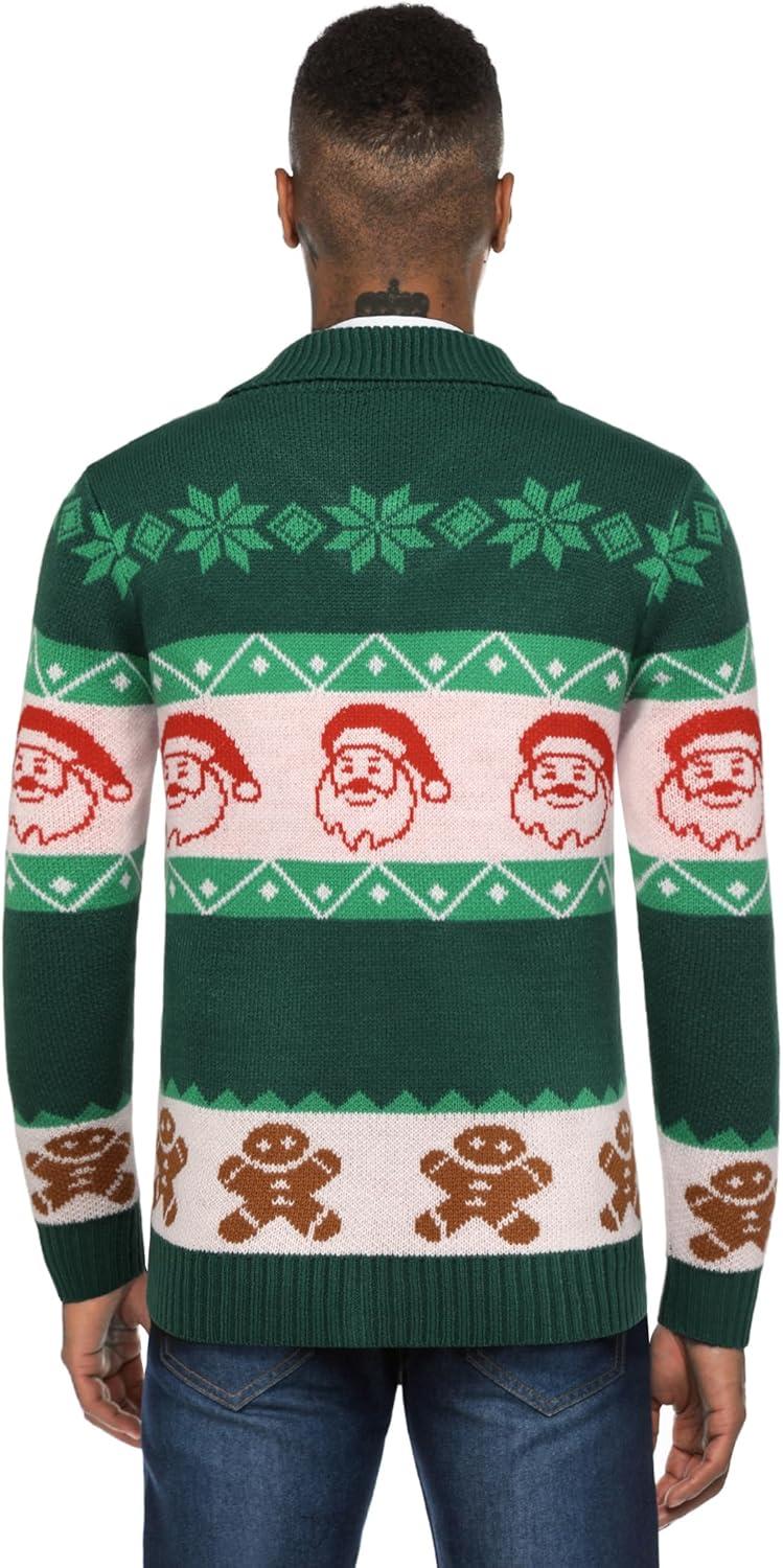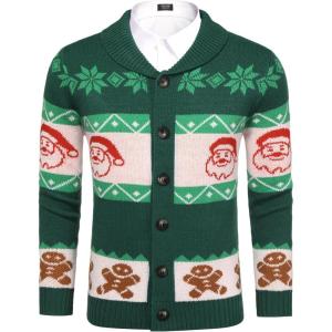 COOFANDY Men’s Christmas Cardigans Ugly Xmas Sweaters Reindeer Snowflake Shawl Collar Knitted Cardigan Sweater(Green Santa Claus)