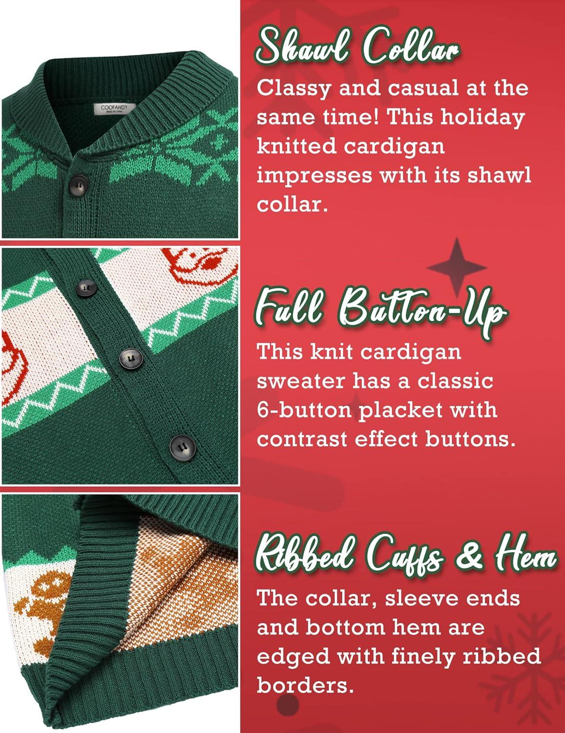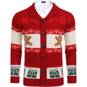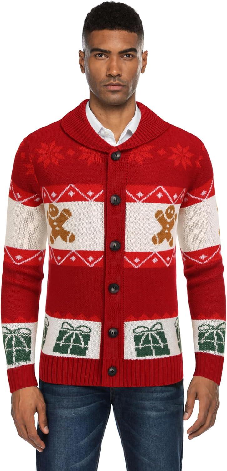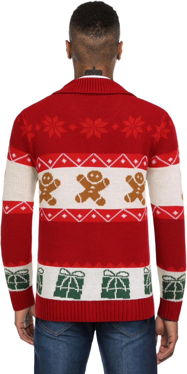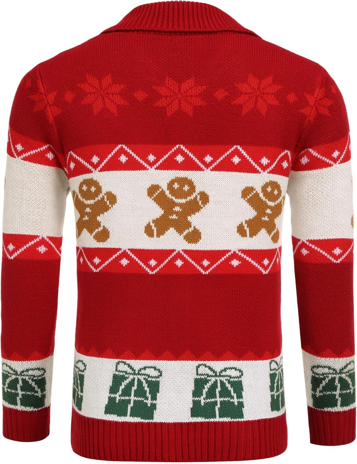 COOFANDY Men’s Christmas Cardigans Ugly Xmas Sweaters Reindeer Snowflake Shawl Collar Knitted Cardigan Sweater(Red Gingerbread)