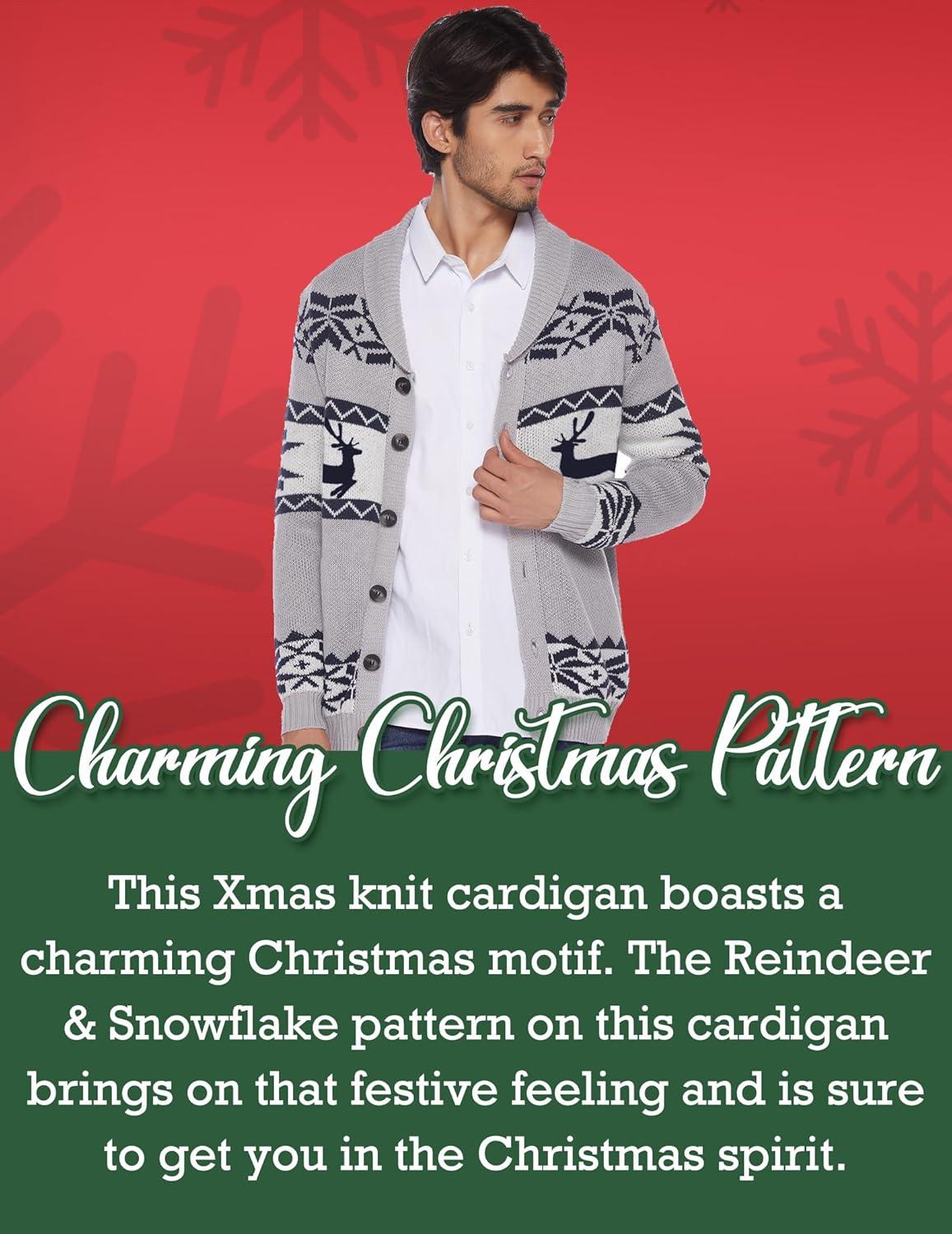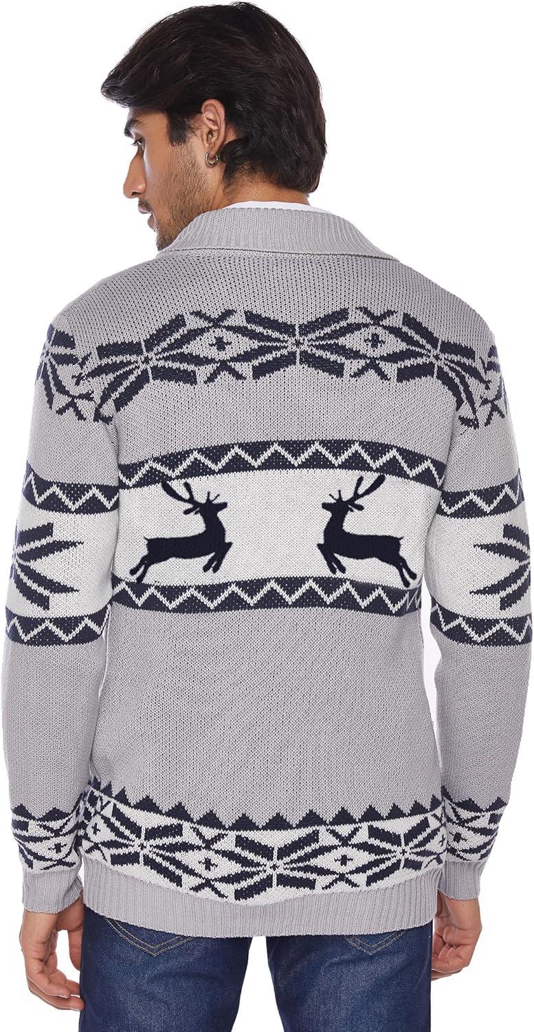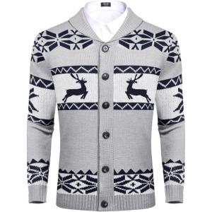 COOFANDY Men’s Christmas Cardigans Ugly Xmas Sweaters Reindeer Snowflake Shawl Collar Knitted Cardigan Sweater(Grey)