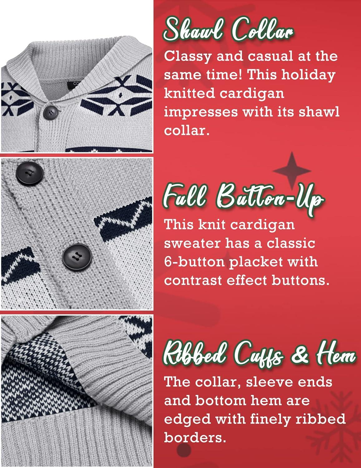 COOFANDY Men’s Christmas Cardigans Ugly Xmas Sweaters Reindeer Snowflake Shawl Collar Knitted Cardigan Sweater(Red-white-gray)