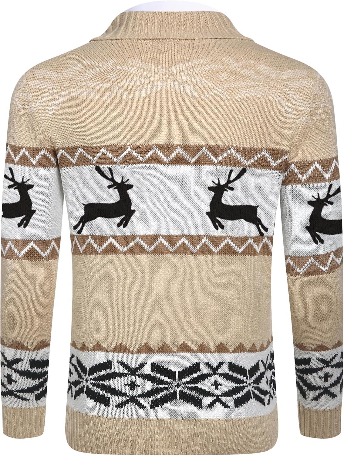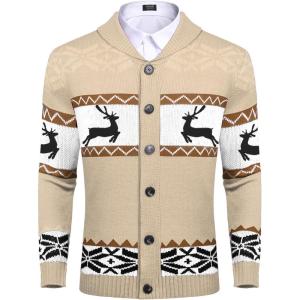 COOFANDY Men’s Christmas Cardigans Ugly Xmas Sweaters Reindeer Snowflake Shawl Collar Knitted Cardigan Sweater(Light Apricot)
