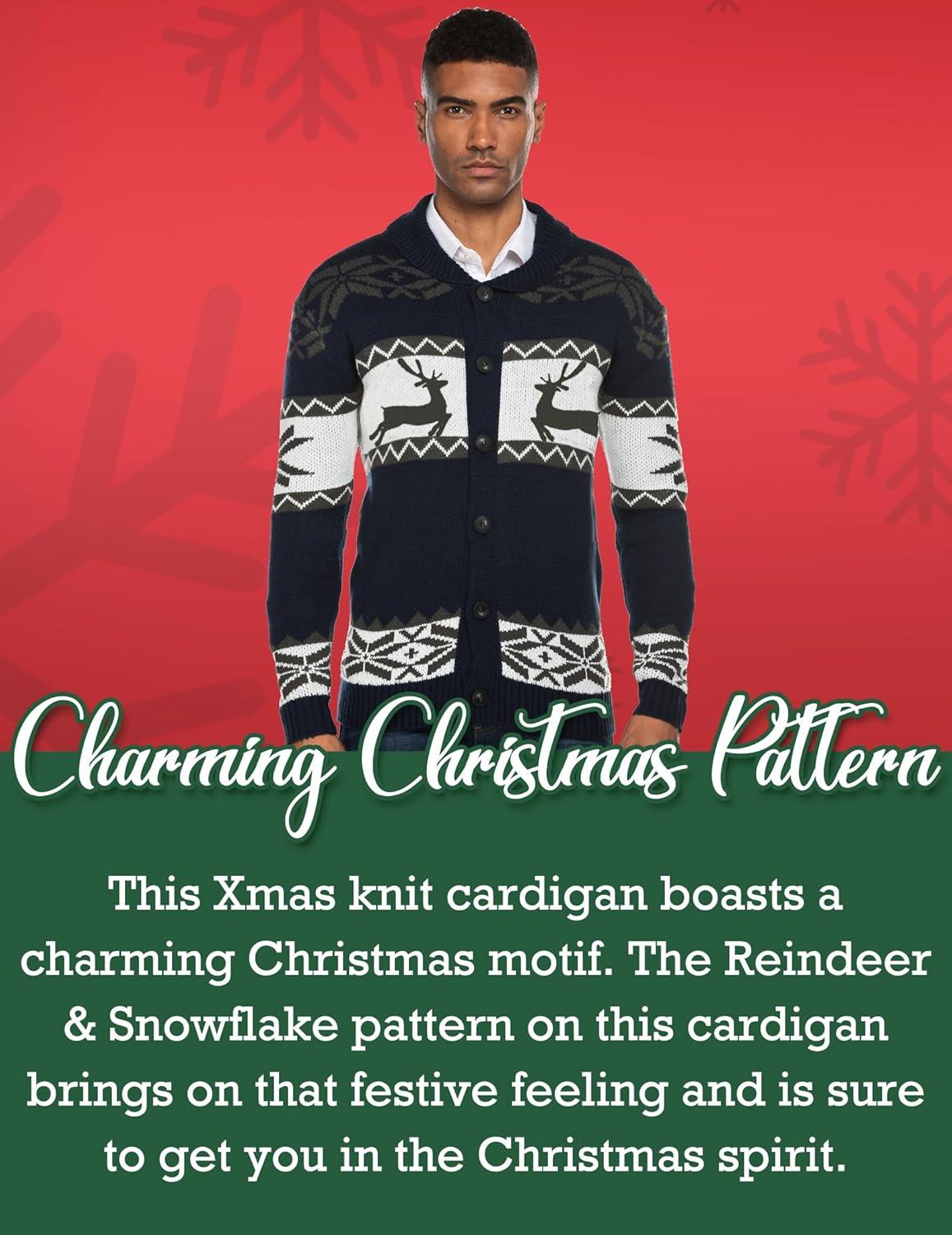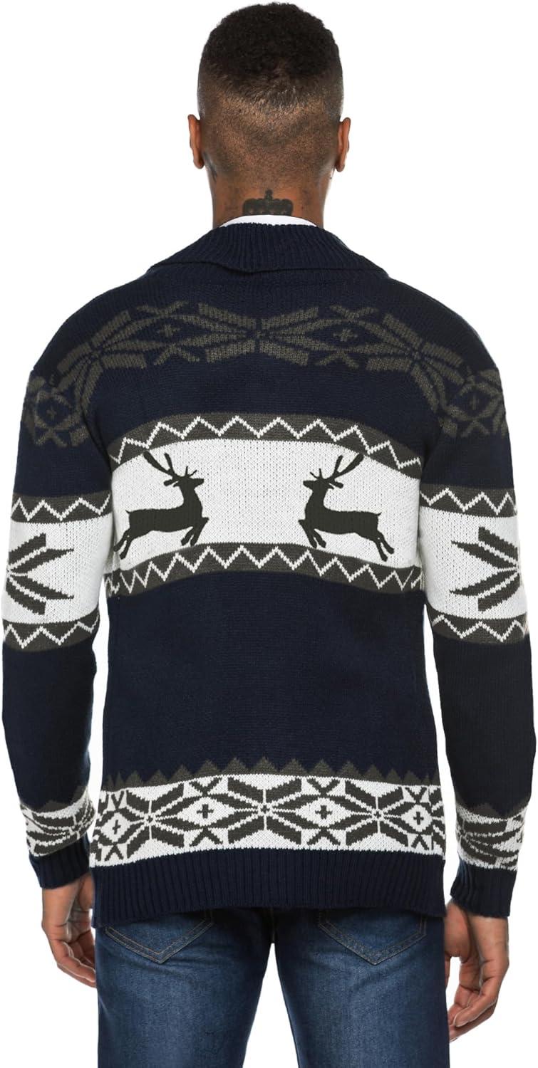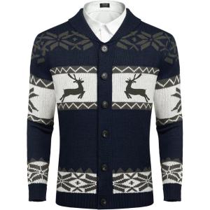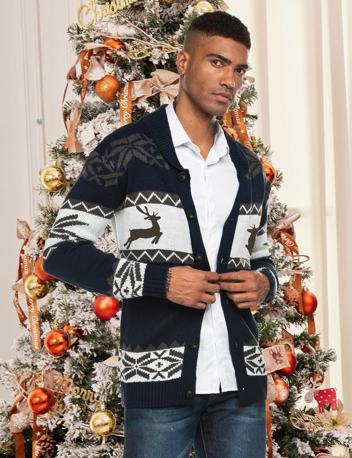 COOFANDY Men’s Christmas Cardigans Ugly Xmas Sweaters Reindeer Snowflake Shawl Collar Knitted Cardigan Sweater(Navy Blue)